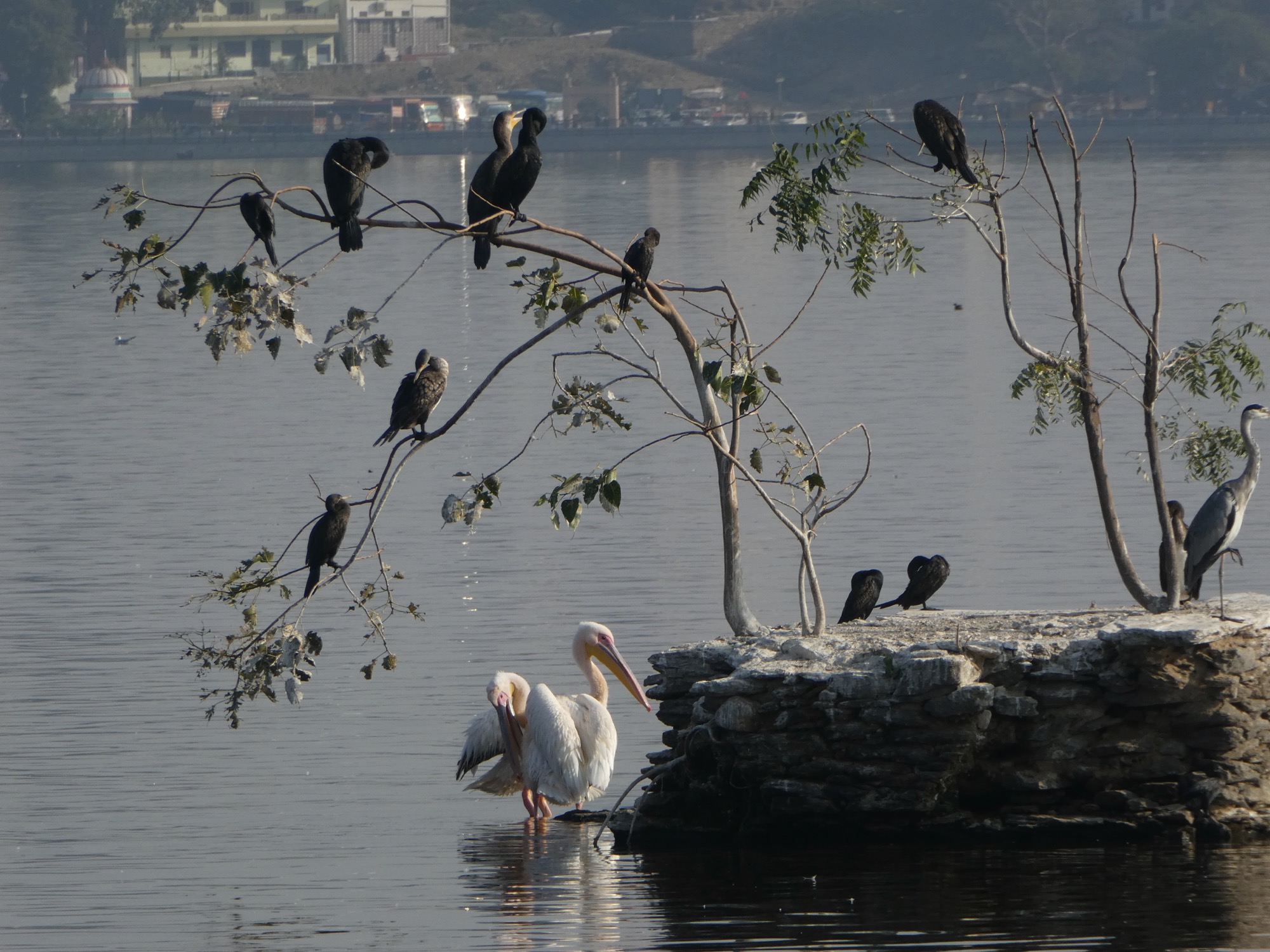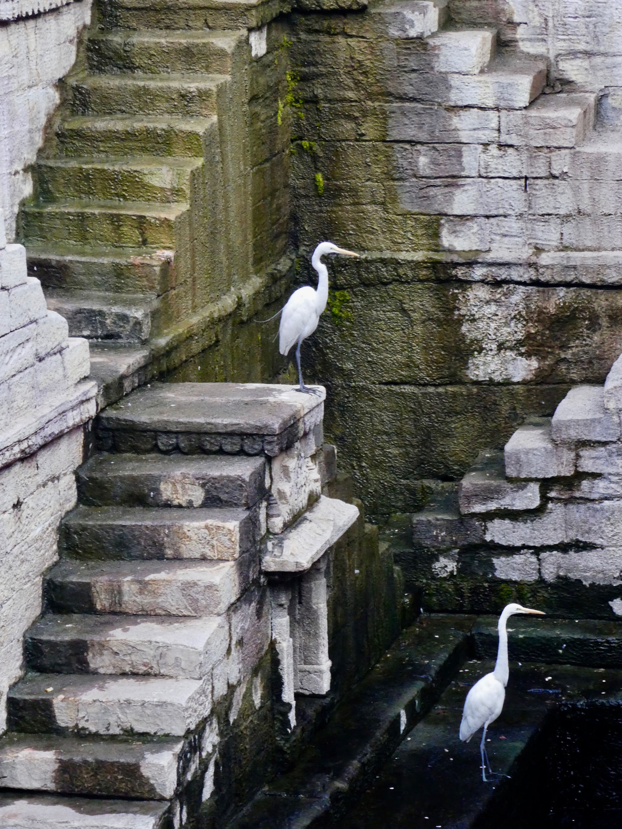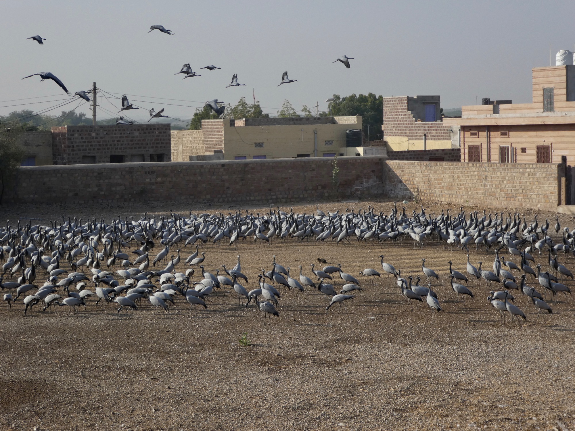 Und dann Jodhpur – die blaue Stadt. Blau ist die Farbe der Brahmanen. Sieht hübsch aus! Und die Stadt beginnt die historische Innenstadt zu restaurieren – kreativ wird neu&alt zusammengeführt … der Maharaja bringt sich wohl auch sehr aktiv ein. Direkt neben unserem Hotel liegen restaurierte Stepwells „Tunwarji ka Jhalra“, in denen sich morgens die Kraniche ein Stell-Dich-Ein geben. Aus einem gemütlichen Café heraus beobachten wir die Jagd um die Frühstücksfische – die Kormorane fangen einen Fisch, der ihnen dann von einem Reiher abgejagt wird und dann lauern die Hunde dem Reiher auf … aber meistens ist der Reiher der Gewinner (… wenn er es denn schafft den Fisch durch seinen schlanken Hals hinunterzuwürgen …)