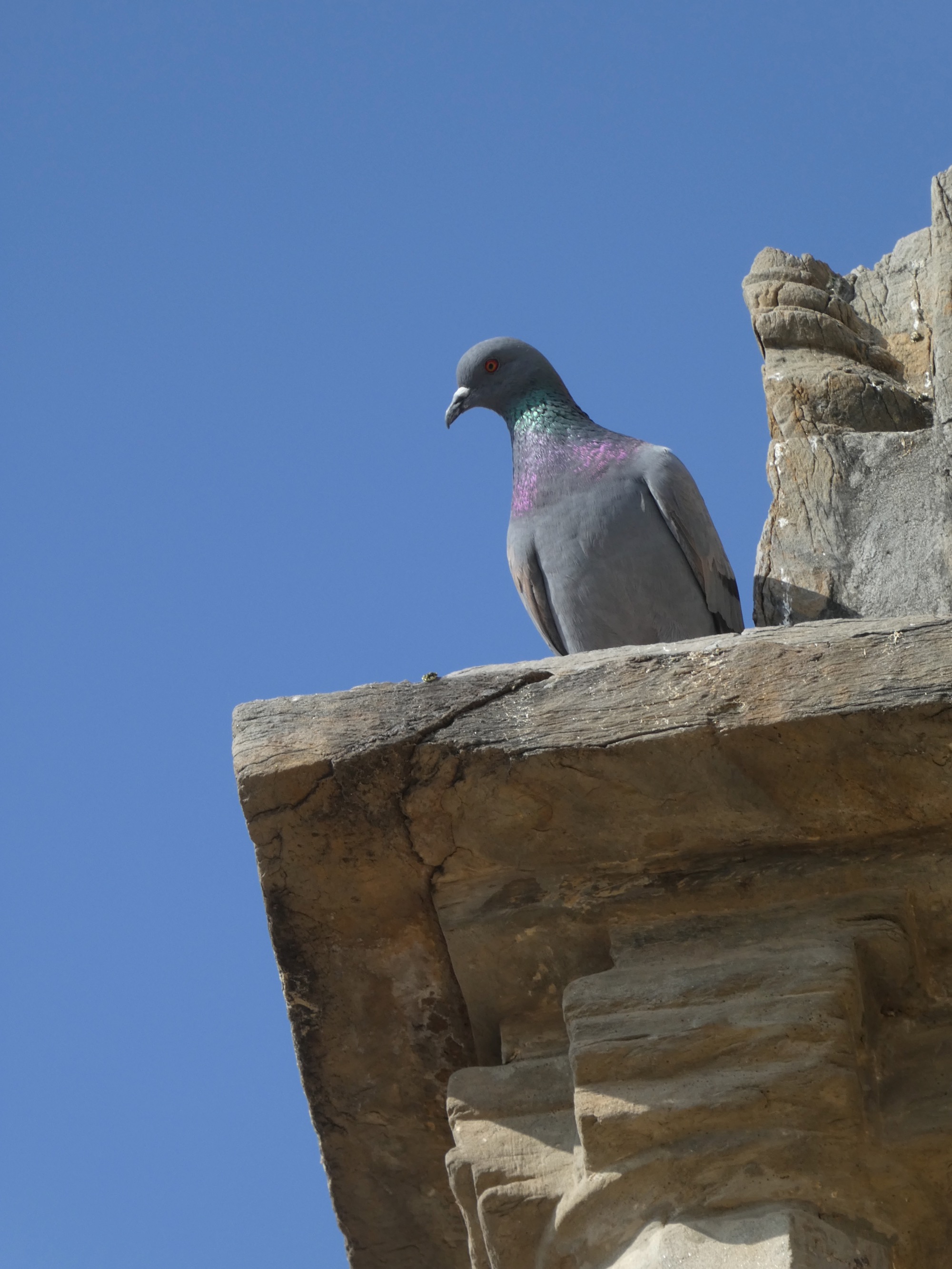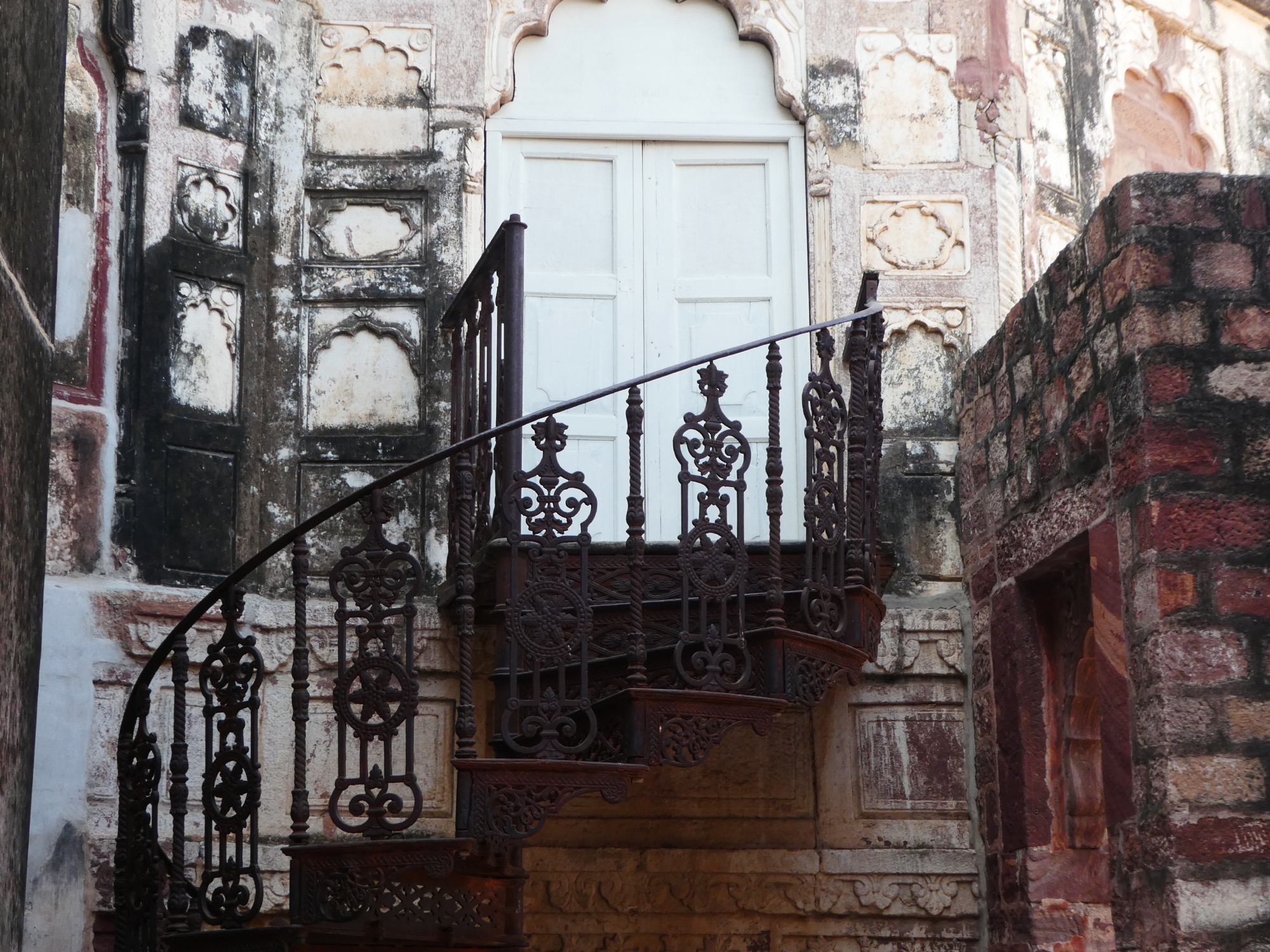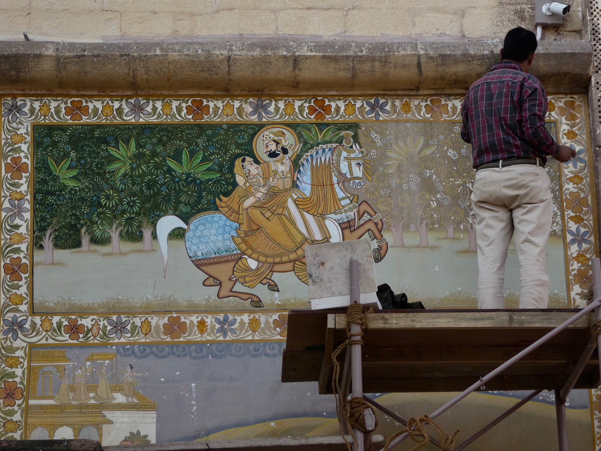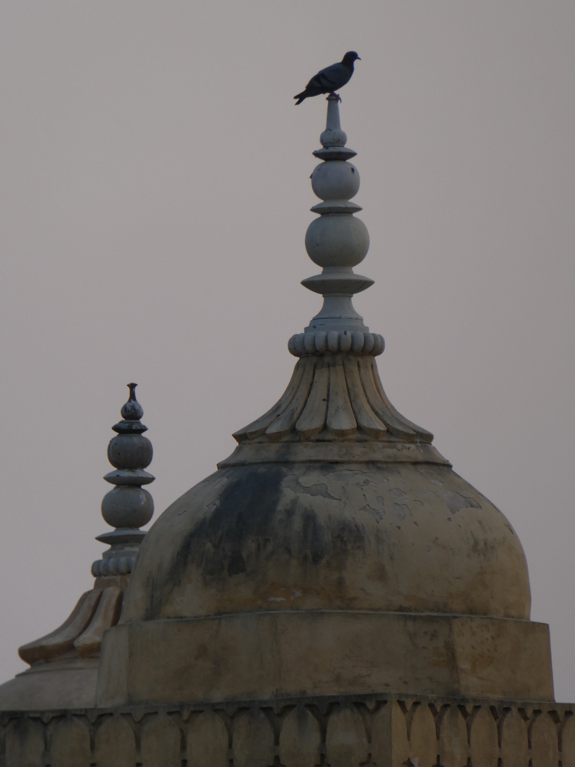 Und dann Jodhpur – die blaue Stadt. Blau ist die Farbe der Brahmanen. Sieht hübsch aus! Und die Stadt beginnt die historische Innenstadt zu restaurieren – kreativ wird neu&alt zusammengeführt … der Maharaja bringt sich wohl auch sehr aktiv ein. Direkt neben unserem Hotel liegen restaurierte Stepwells „Tunwarji ka Jhalra“, in denen sich morgens die Kraniche ein Stell-Dich-Ein geben. Aus einem gemütlichen Café heraus beobachten wir die Jagd um die Frühstücksfische – die Kormorane fangen einen Fisch, der ihnen dann von einem Reiher abgejagt wird und dann lauern die Hunde dem Reiher auf … aber meistens ist der Reiher der Gewinner (… wenn er es denn schafft den Fisch durch seinen schlanken Hals hinunterzuwürgen …)