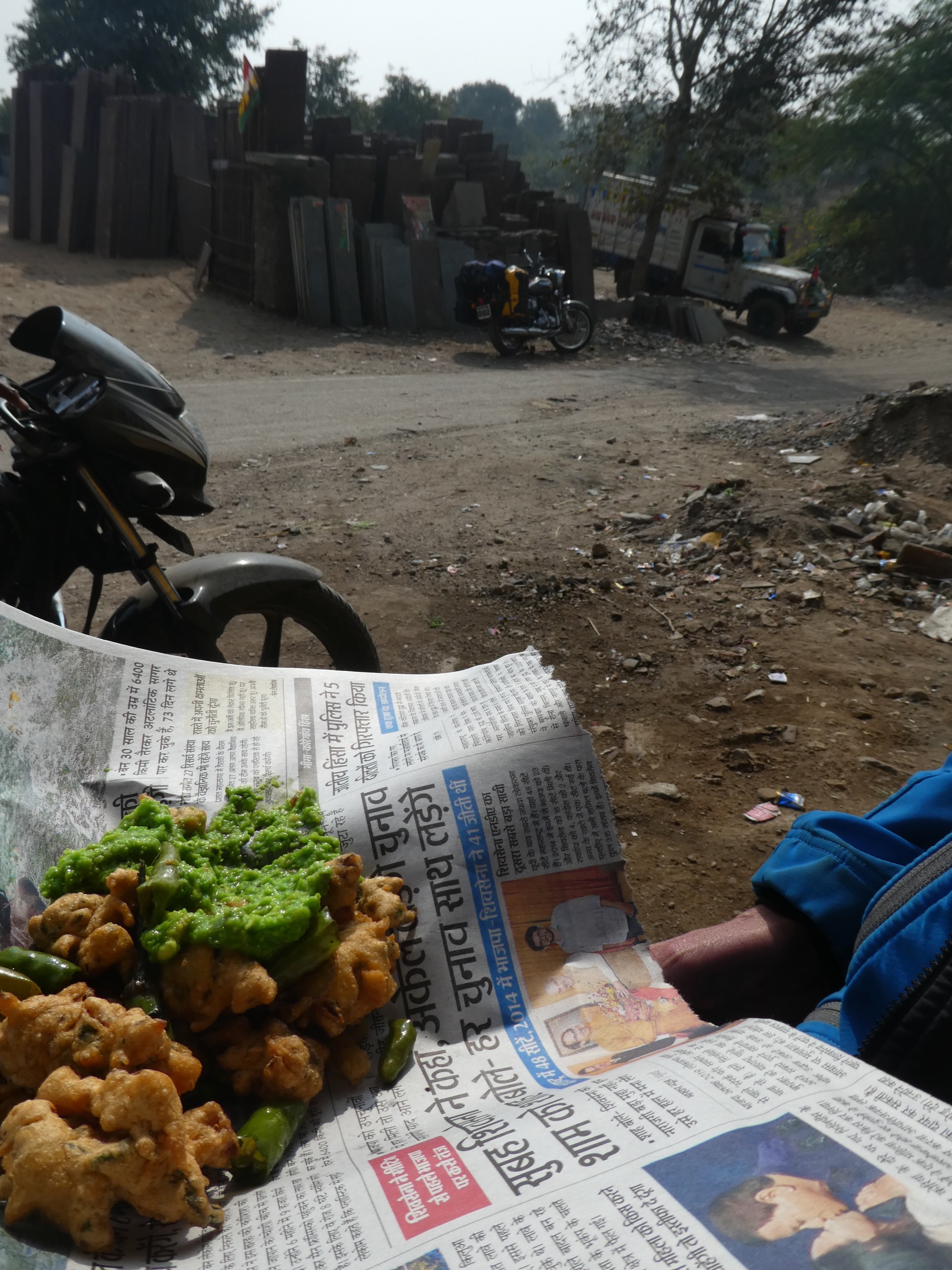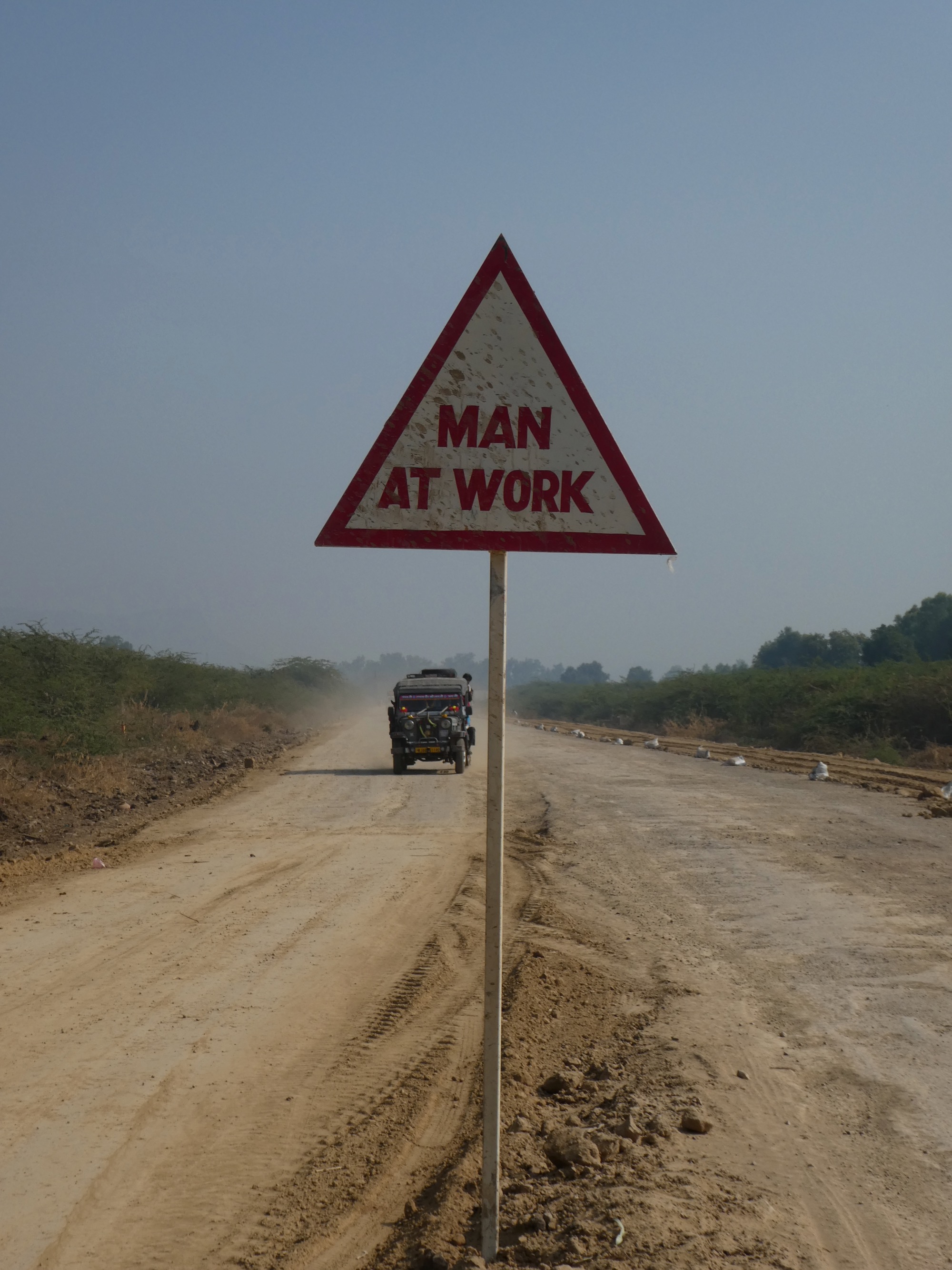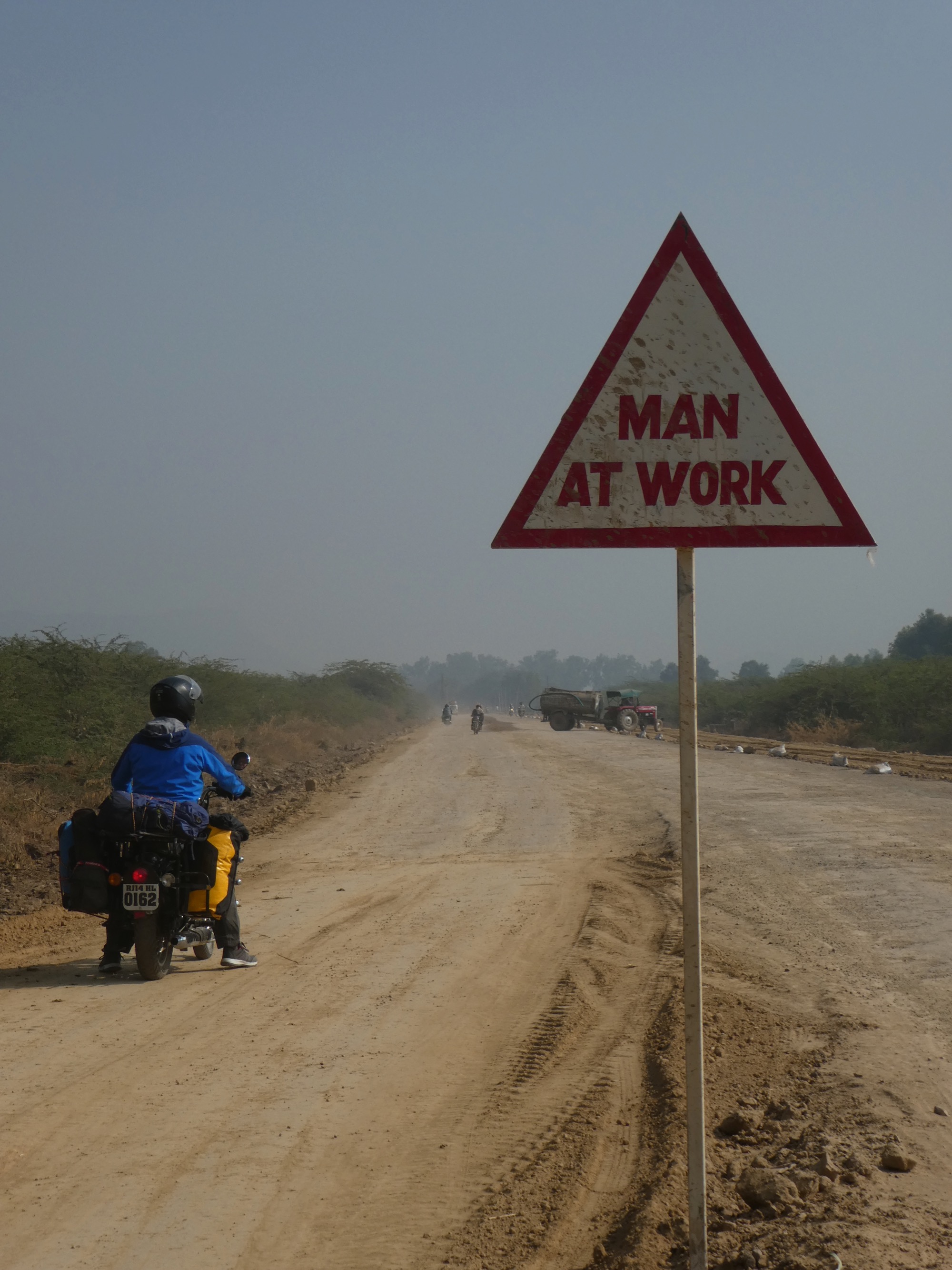 Baustellen sind in Indien spannend – es scheint das Anliegen der Verantwortlichen zu sein erst einmal den bestehenden – auch schon fragwürdigen Belag auf möglichst langer Strecke abzutragen. Der Verkehr quält sich dann über was halt immer der Boden und der Baustellenfortschritt so hergibt. Aber nach Fortschritt sieht es selten aus … wildes Verteilen von Baumaterial und sonst eher Ödnis. Wenn jemand arbeitet, dann macht es eher den Eindruck als ob man zufällig vorbei gekommen ist und halt mal etwas rumbuddelt … meist sind Frauen in bunten Saris dabei und tragen für die Erdbewegungen in großen Schüsseln Schotter auf ihrem Kopf balancierend irgendwo hin. Manchmal sieht man schweres Gerät – Bagger, Planierraupen … – die aber  kaum genutzt werden, ab und zu sitzt jemand drin – und spielt im Zweifelsfalls mit dem Handy, so tut sich selten etwas … Somit müht sich unsere schwere Maschine durch allen möglichen Untergrund – dabei liebt sie eigentlich gemütliches Cruisen auf der Landstraße im fünften Gang bei 70 – 80 km/h – genau wie Fahrer und Sozia ?