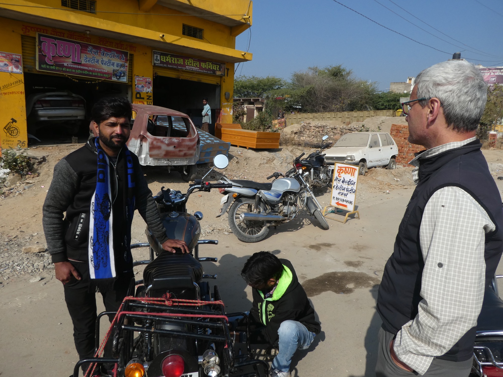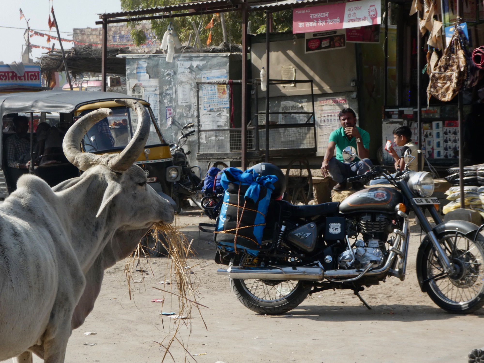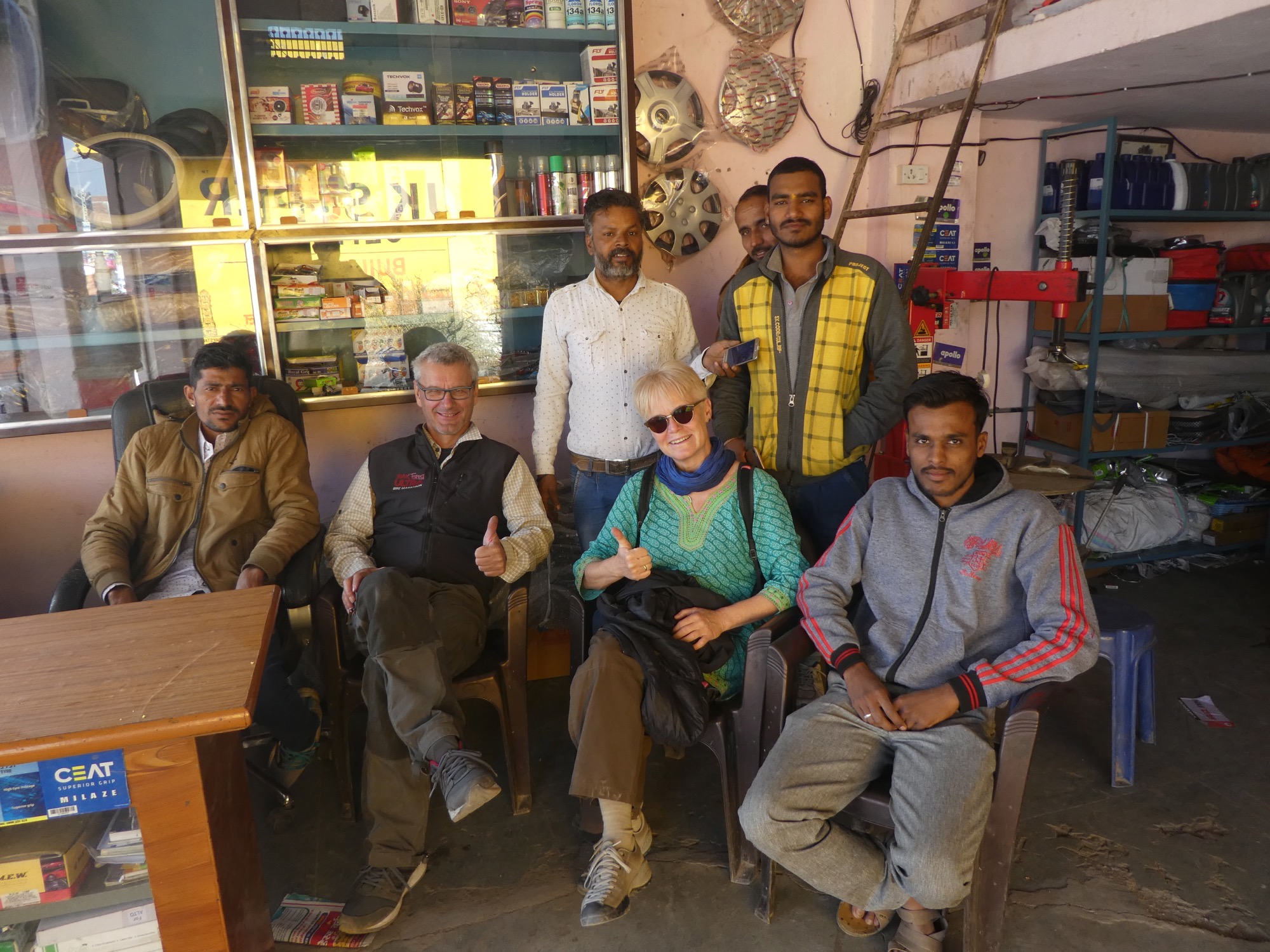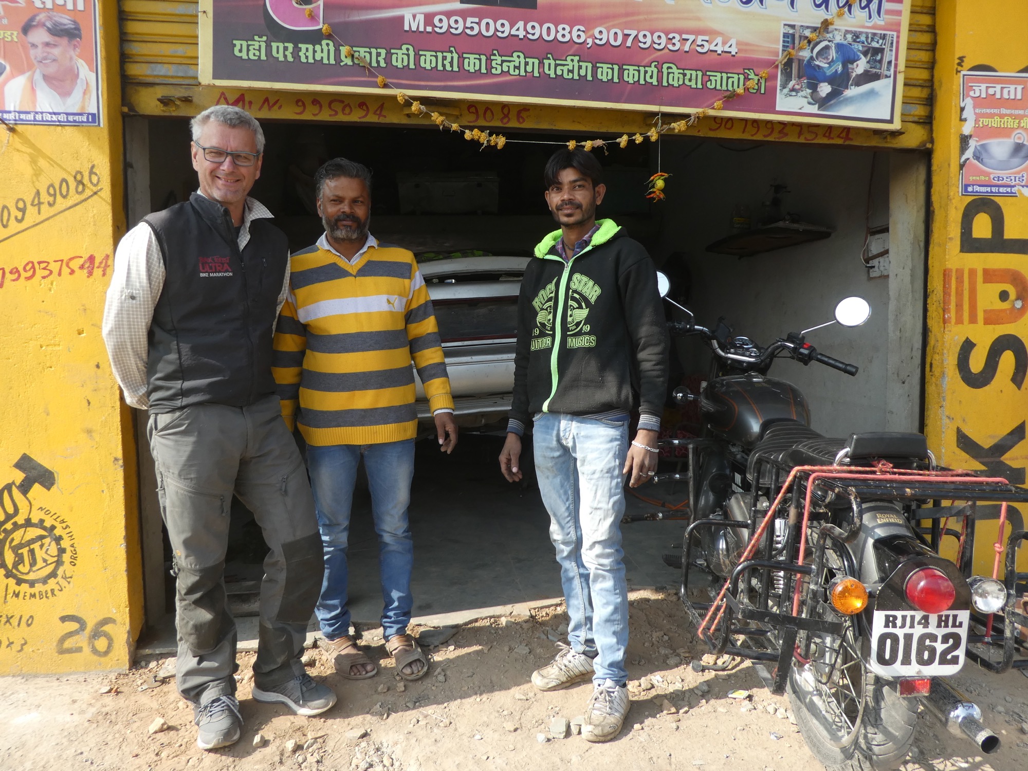 Kurz vorm Ziel noch einmal in der Pampa verfahren und an der Tankstelle dann ein kleiner Schock: Unseren Gepäckträger hat‘s gekostet – eine Schraube ist durch das viele Geschüttel verloren gegangen und schon ist der Träger an mehreren Stellen gebrochen. Hängt alles ziemlich schief … Hm, ein paar Spannriemen halten das Ganze noch bis zur Unterkunft … Wir übernachten im Raj Mahal (der lokale „Königspalast)“ in Bhindar, als am nächsten Morgen die „Prinzessin“ in der Werkstatt anruft, macht der Mechaniker sofort einen „Hausbesuch“. Kurz darauf stehen wir in einer kleinen Werkstatt und uns wird mit viel Einsatz geholfen. Die Nachbarwerkstatt unterbricht ihr „Team Meeting“ und sorgt für Chai – Gesamtszenario: Einer arbeitet und ganz viele Leute schauen zu, geben schlaue Ratschläge =) Ganz viele Selfies werden geschossen… und nach zwei Stunden ist der Gepäckträger quasi wie neu!