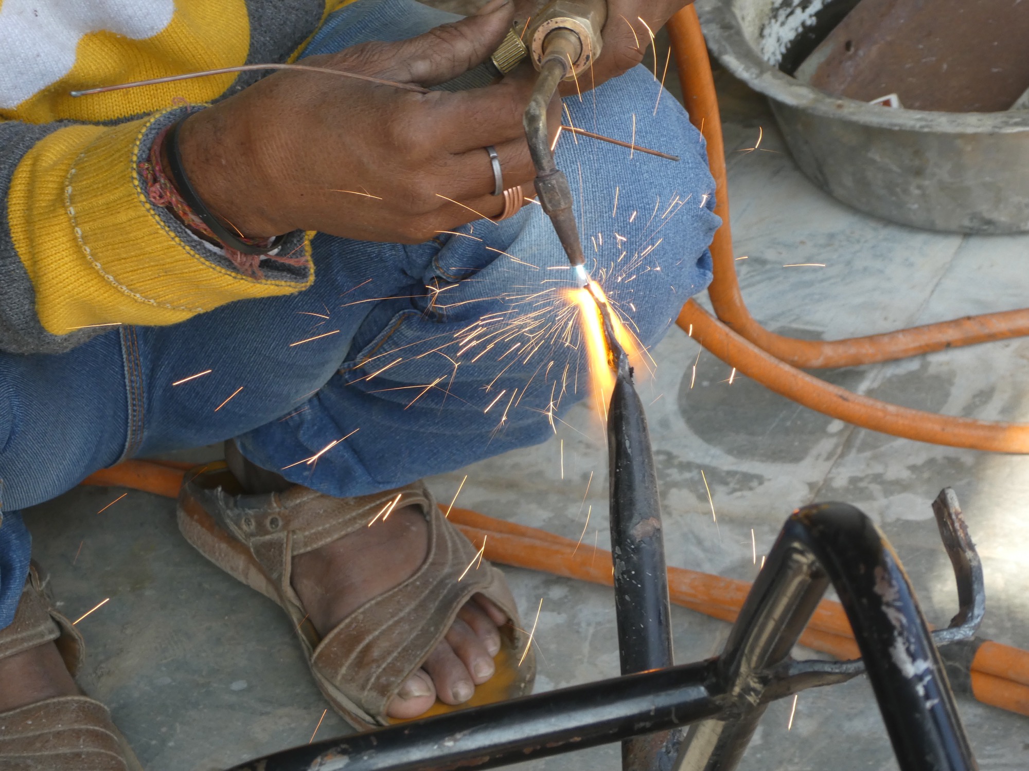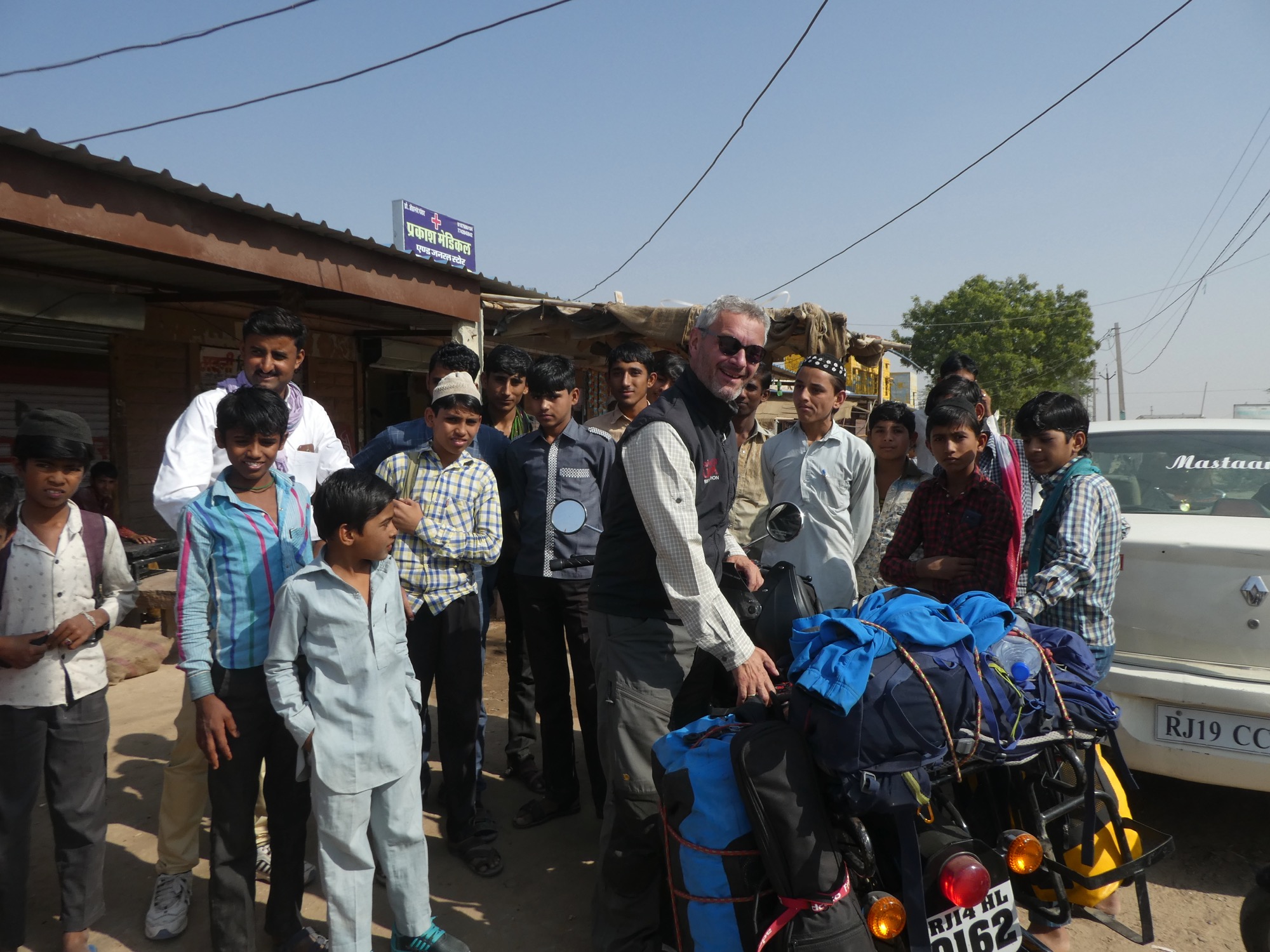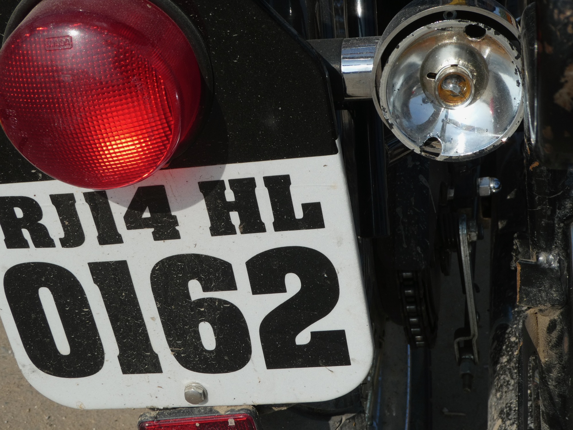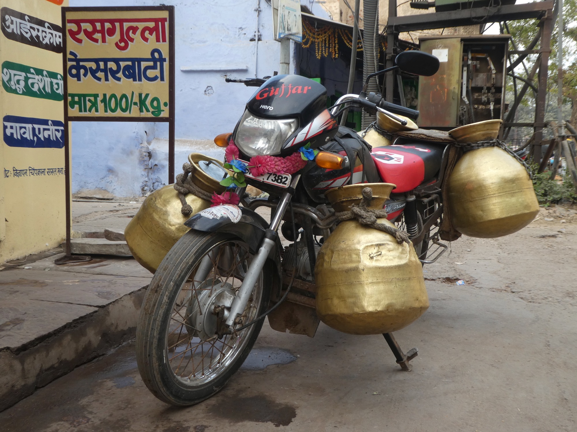 Kurz vorm Ziel noch einmal in der Pampa verfahren und an der Tankstelle dann ein kleiner Schock: Unseren Gepäckträger hat‘s gekostet – eine Schraube ist durch das viele Geschüttel verloren gegangen und schon ist der Träger an mehreren Stellen gebrochen. Hängt alles ziemlich schief … Hm, ein paar Spannriemen halten das Ganze noch bis zur Unterkunft … Wir übernachten im Raj Mahal (der lokale „Königspalast)“ in Bhindar, als am nächsten Morgen die „Prinzessin“ in der Werkstatt anruft, macht der Mechaniker sofort einen „Hausbesuch“. Kurz darauf stehen wir in einer kleinen Werkstatt und uns wird mit viel Einsatz geholfen. Die Nachbarwerkstatt unterbricht ihr „Team Meeting“ und sorgt für Chai – Gesamtszenario: Einer arbeitet und ganz viele Leute schauen zu, geben schlaue Ratschläge =) Ganz viele Selfies werden geschossen… und nach zwei Stunden ist der Gepäckträger quasi wie neu!