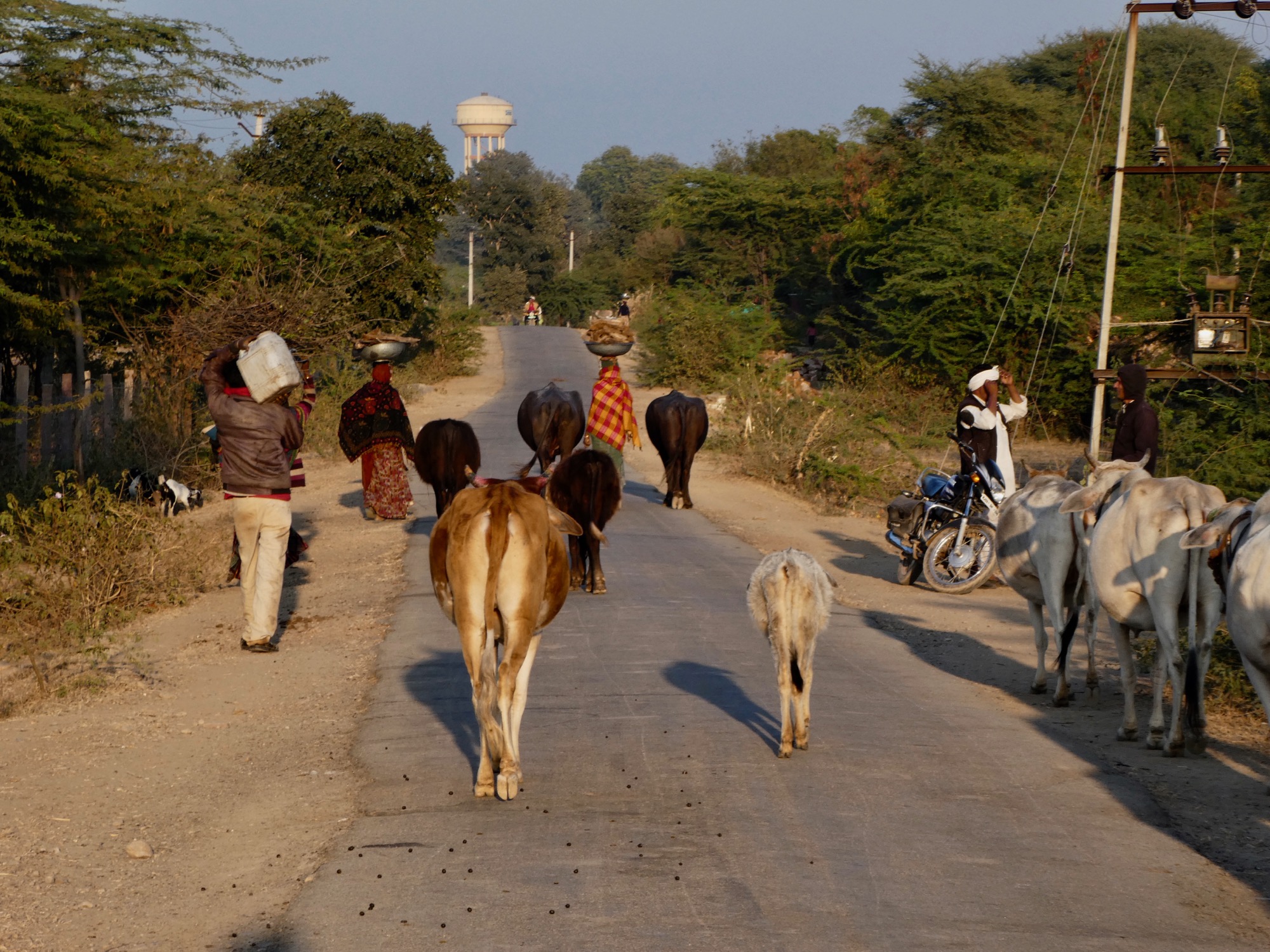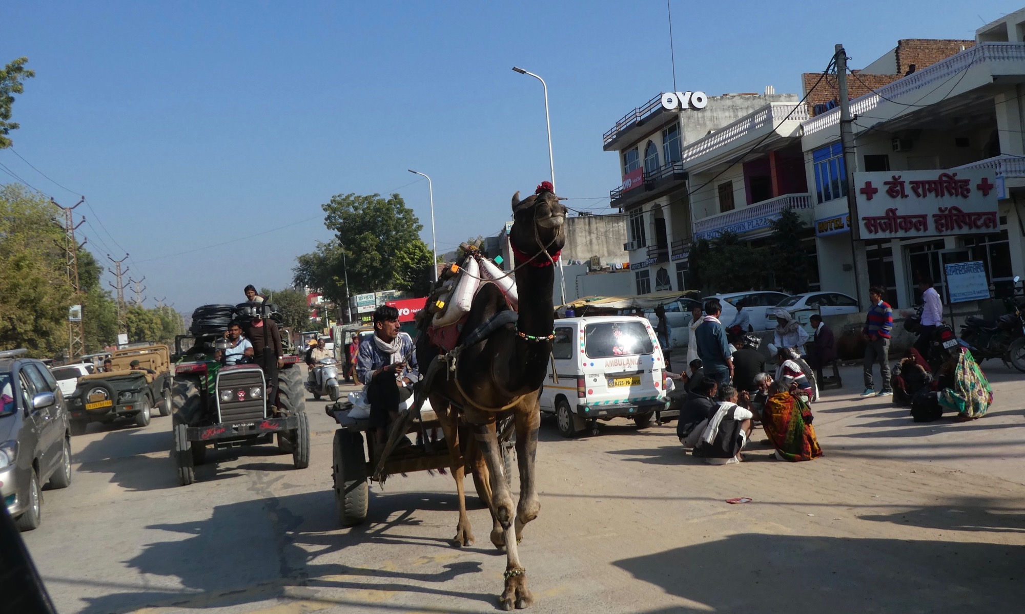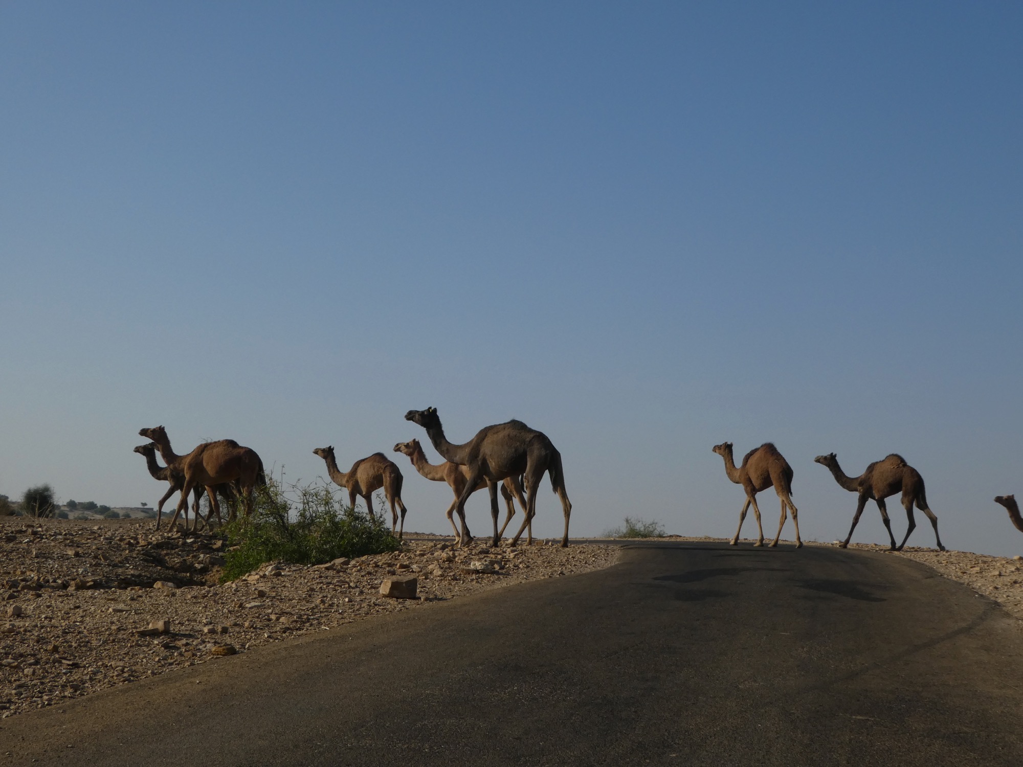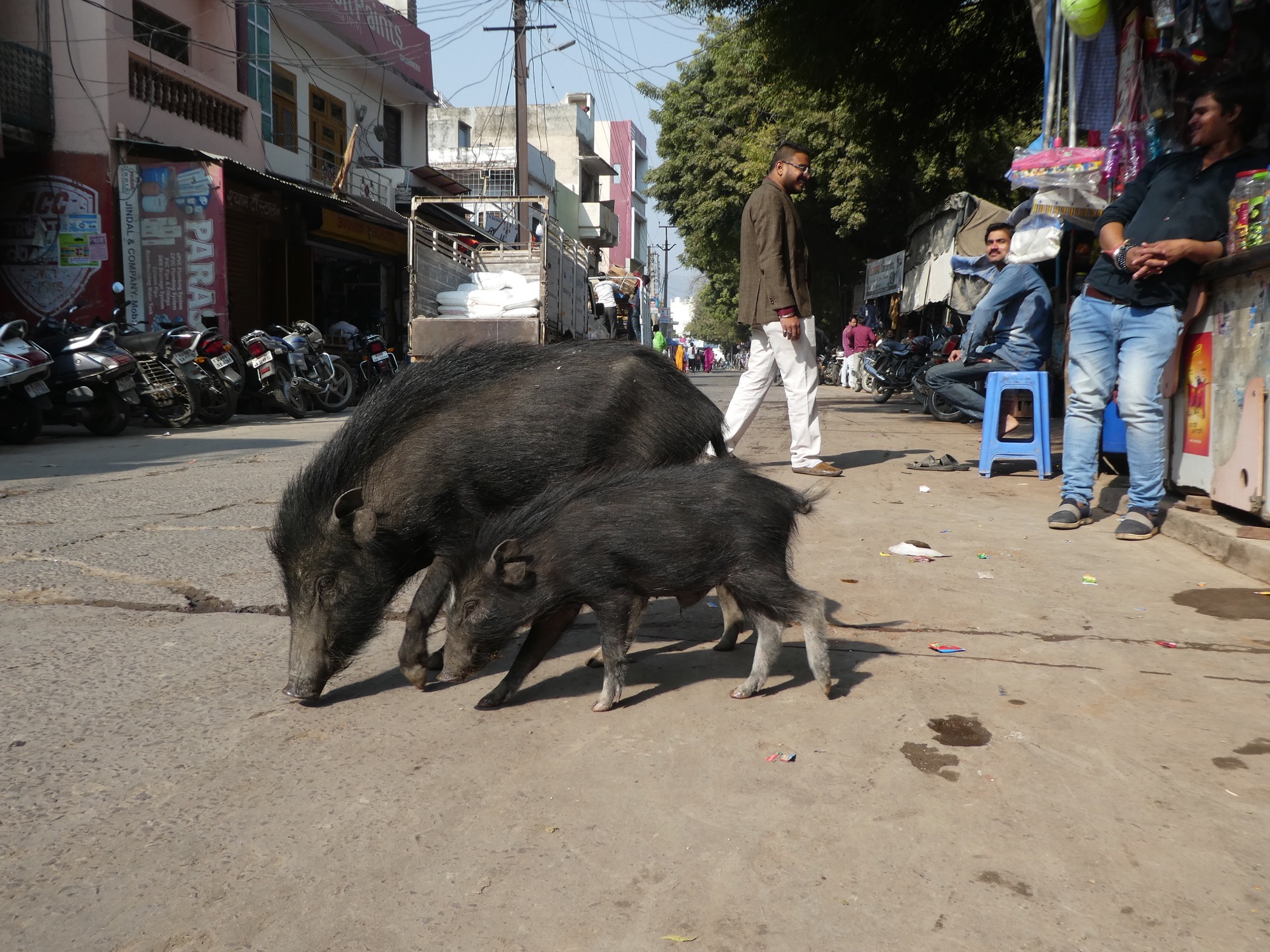 Immerhin kann man sich – wahrscheinlich einem darwinistischen Prinzip folgend – darauf verlassen, dass im Verkehr alle aufmerksam sind – Rücksichtsname ist allerdings ein Fremdwort. Die totale Unberechenbarkeit gilt dann für die indische Tierwelt, die wir auf den Straßen antreffen – Kühe, Wasserbüffel, Kamele, Elefanten, Pferde, Ziegen, Schafe, Haus- und Wildschweine, Affen, Pfaue und was auch immer. Kühe sind einfach überall: In den Städten, auf den Landstraßen und Expressways – auf letzteren lieben sie insbesondere den Mittelstreifen.