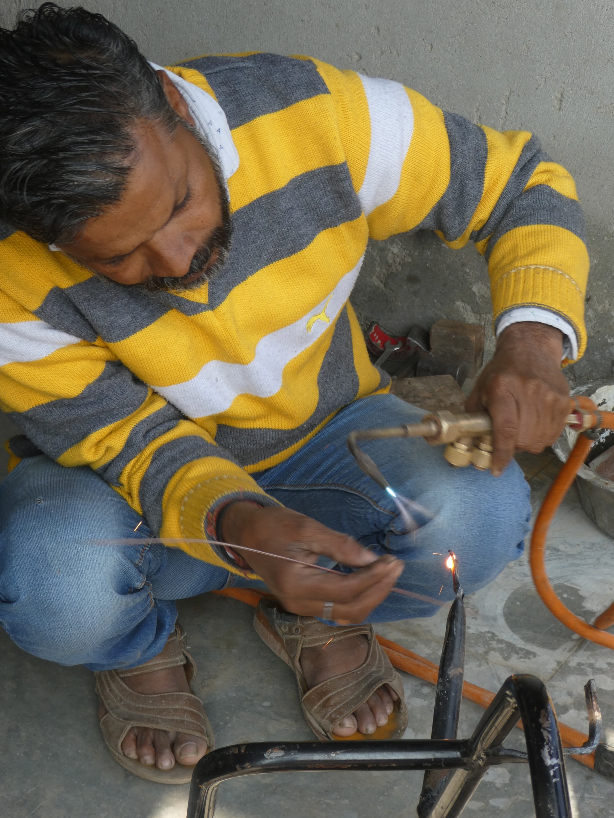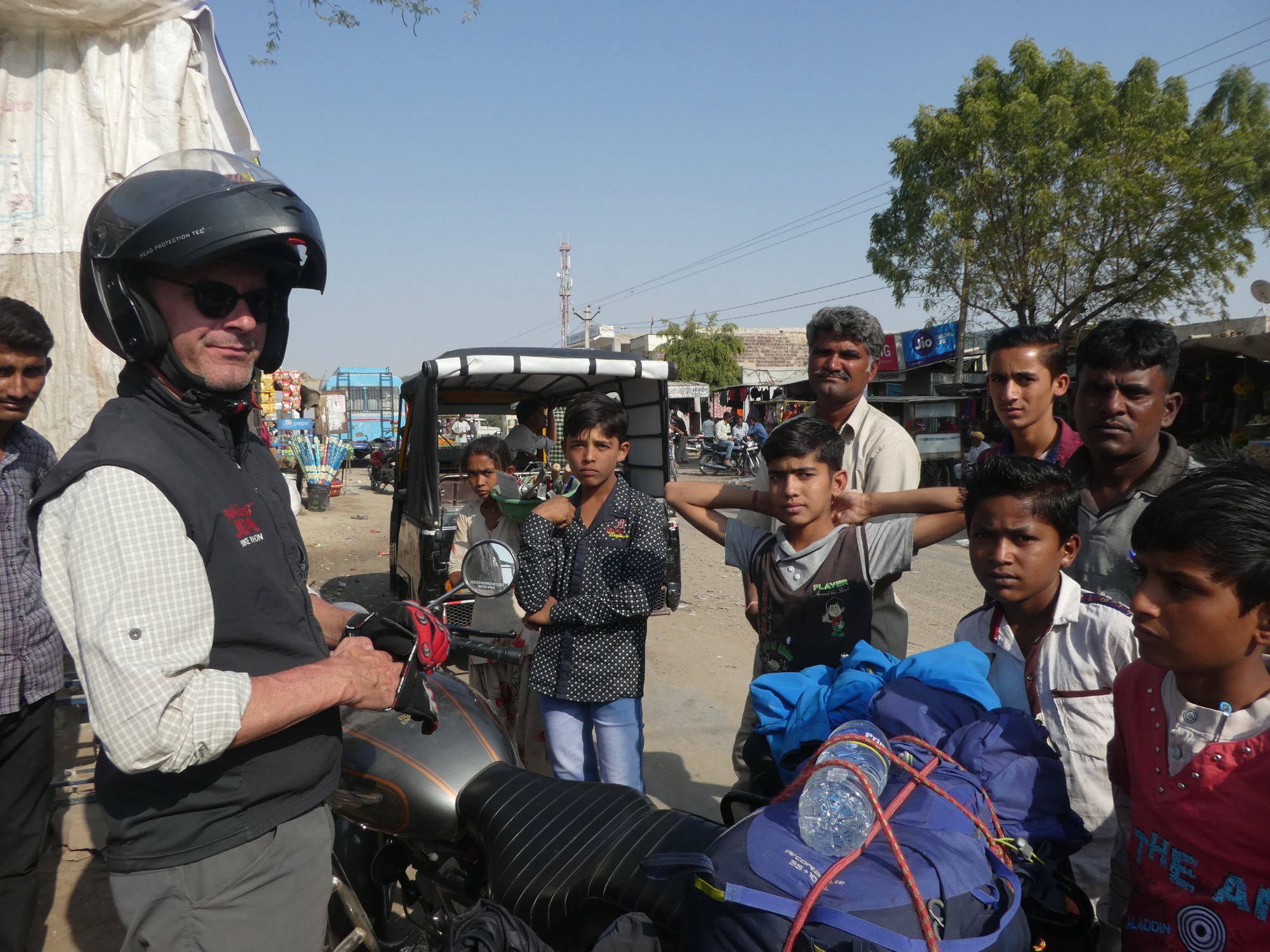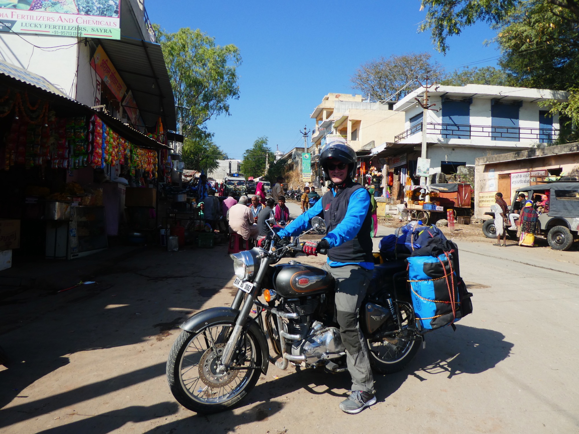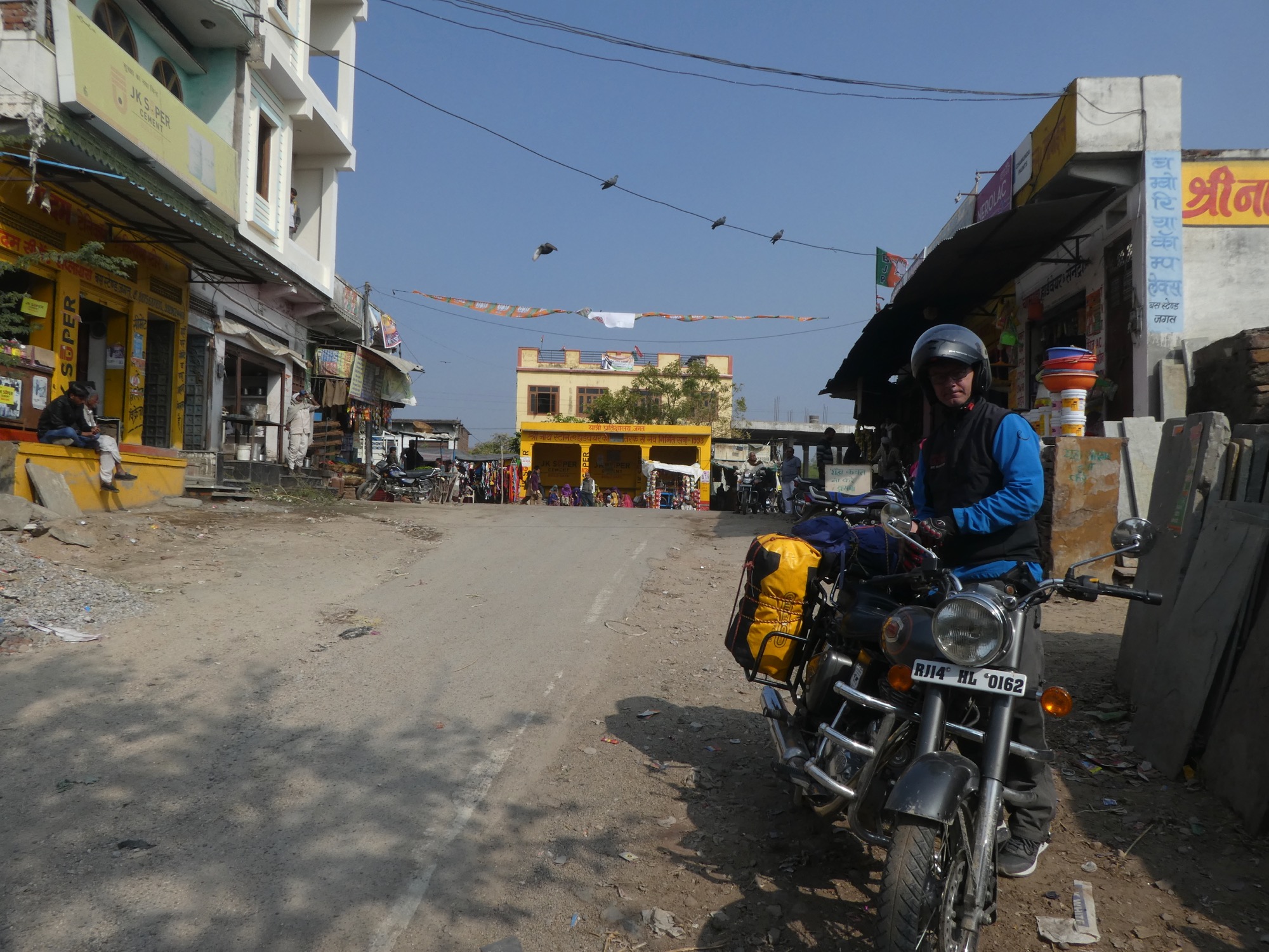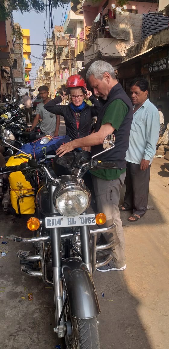 Am nächsten Morgen sortieren wir wieder mal unser Gepäck um – diesmal muss ja alles aufs Motorrad passen. Zwei 40l Ortliebtaschen (… die haben inzwischen auch schon Einiges erlebt …) und ein 35l Rucksack. Ich schaue schon etwas kritisch, ob das mit uns zusammen auf ein Bike passt … Am nächsten Morgen holt uns unser LieblingsRikschaFahrer Max ab und fährt uns zu Javeds Shop. Hier geht es gewohnt indisch zu: Erstmal einen Chai … das reservierte Bike hatte am Morgen bei der Testfahrt geschwächelt, also wird der Gepäckträger auf ein anderes Bike ummontiert. Und einen Helm für meinen Frauenkopf gibt’s auch nicht – kein Problem … wir werden mit Max erstmal zum Bazar geschickt – einen Helm kaufen! Chris braucht noch Handschuhe und „Bikeschuhe“. Bis dahin ist dann auch das Bike fertig und wir trauen uns ins wahre Leben …