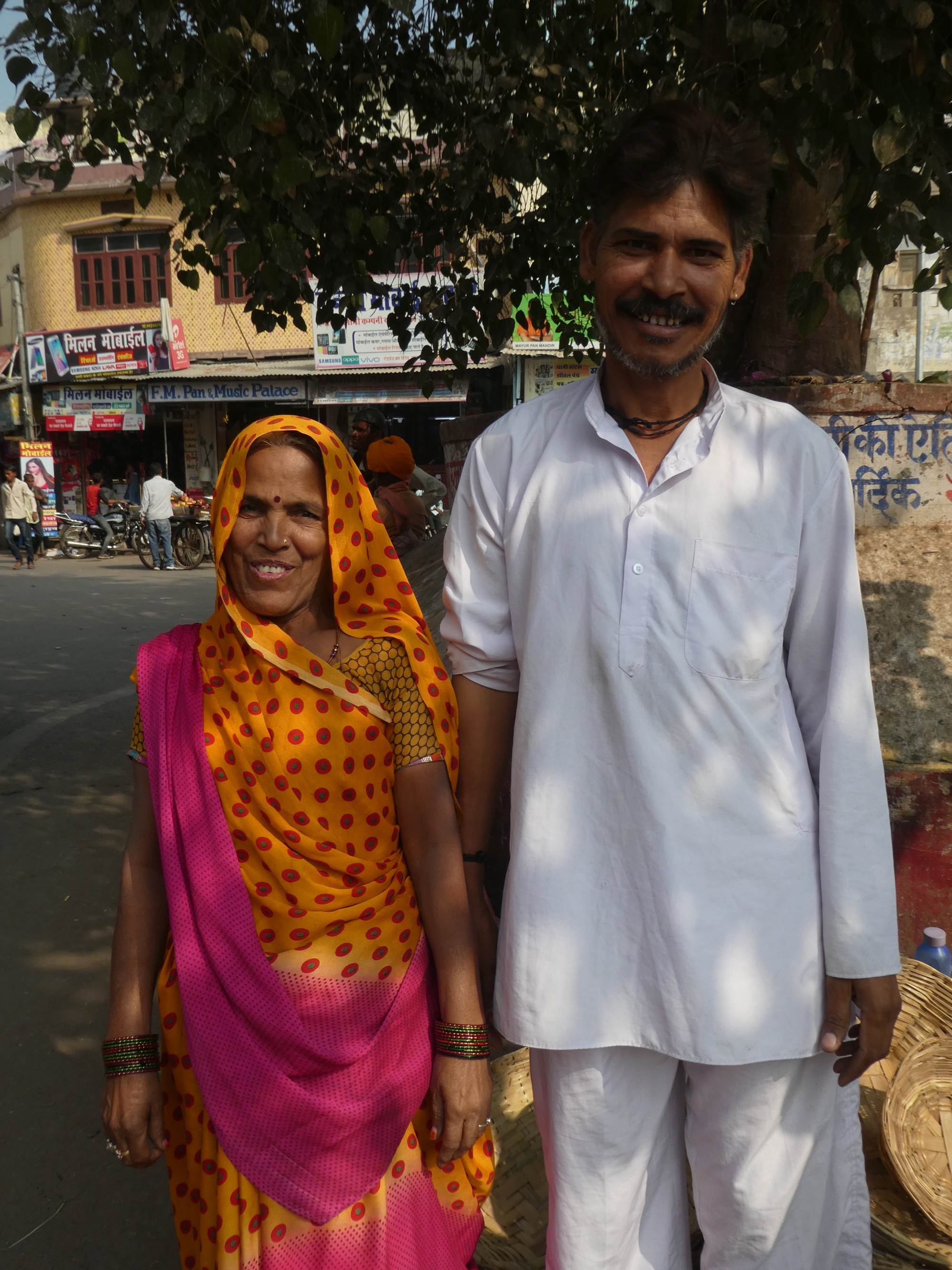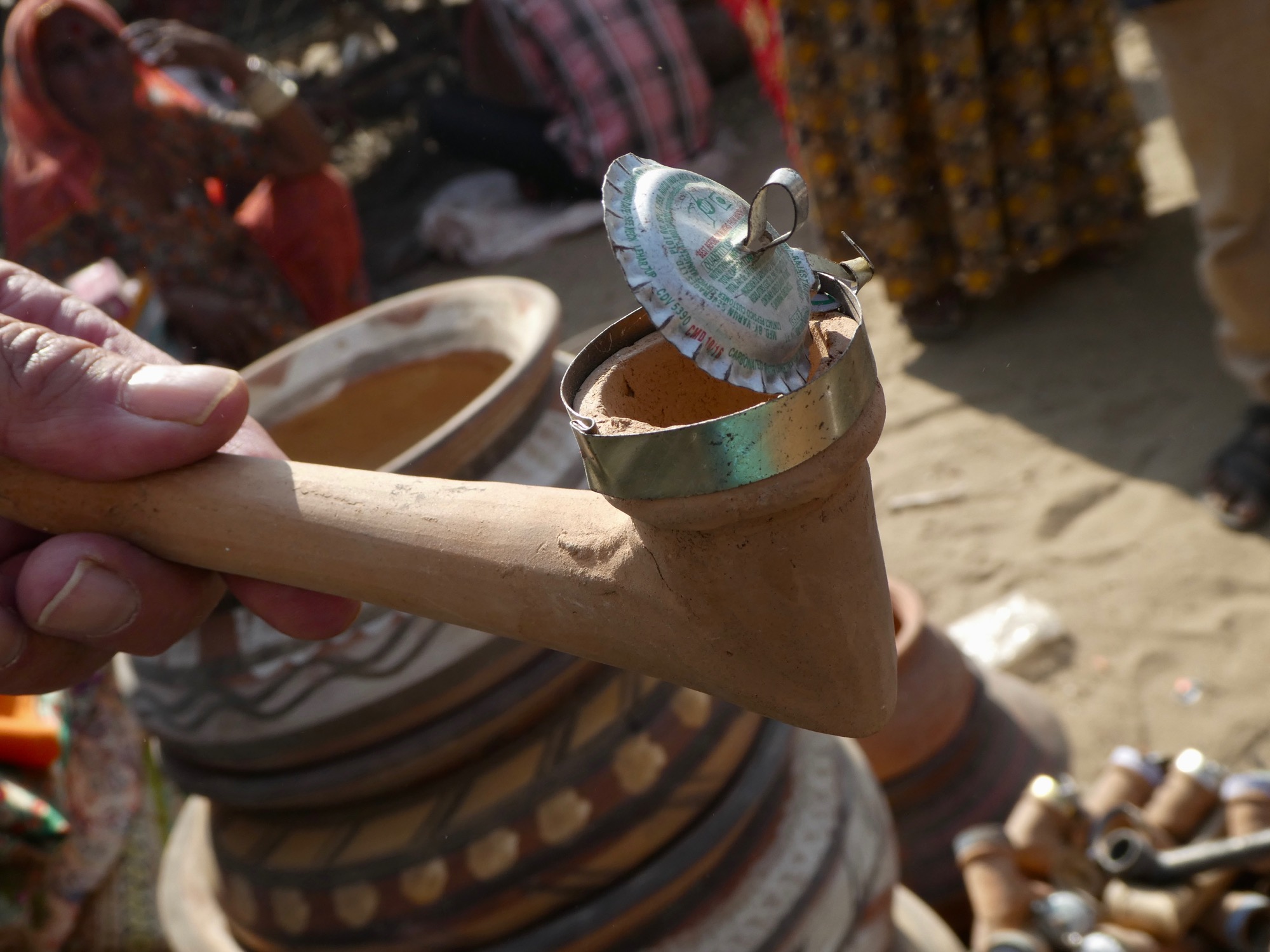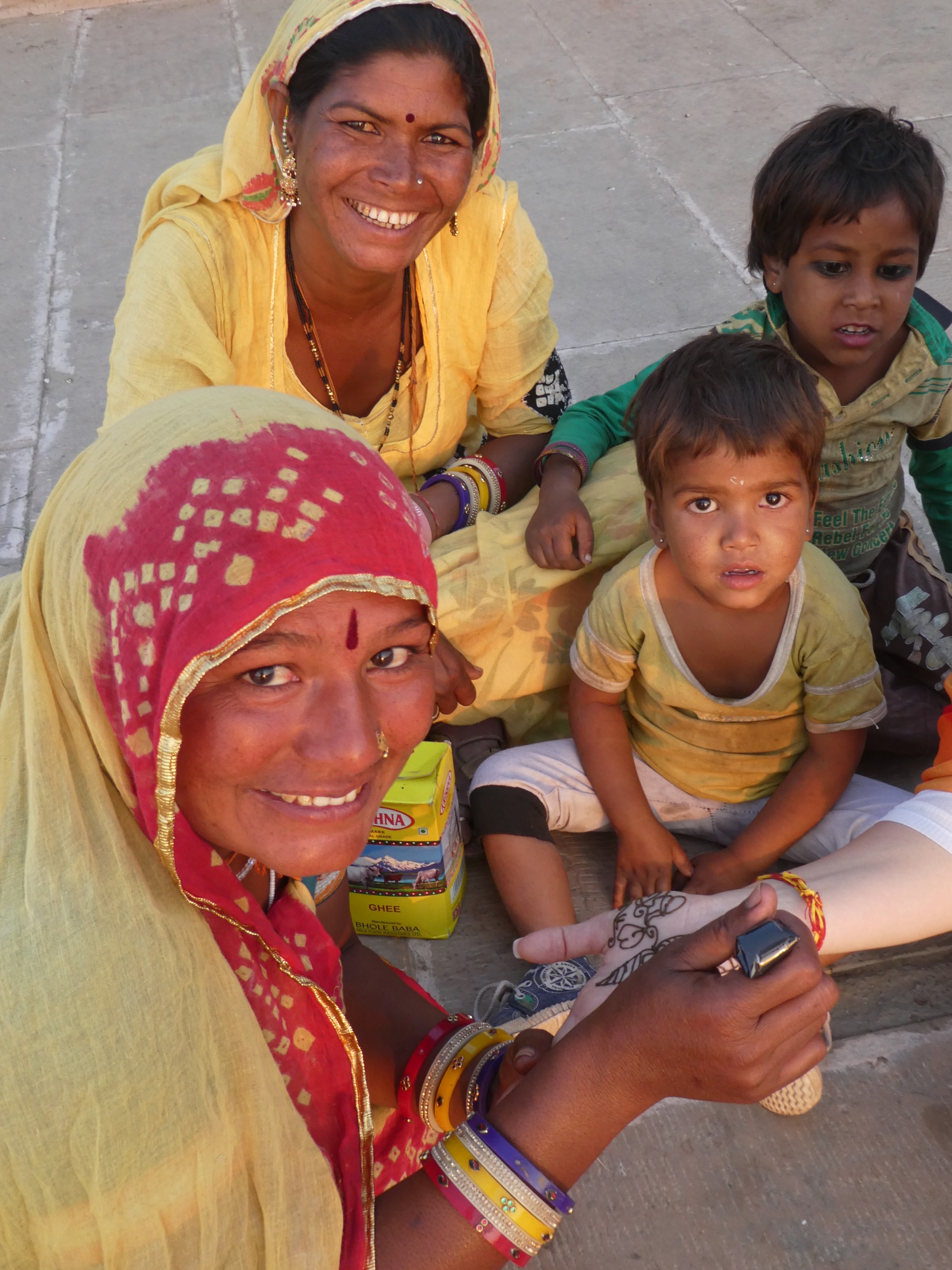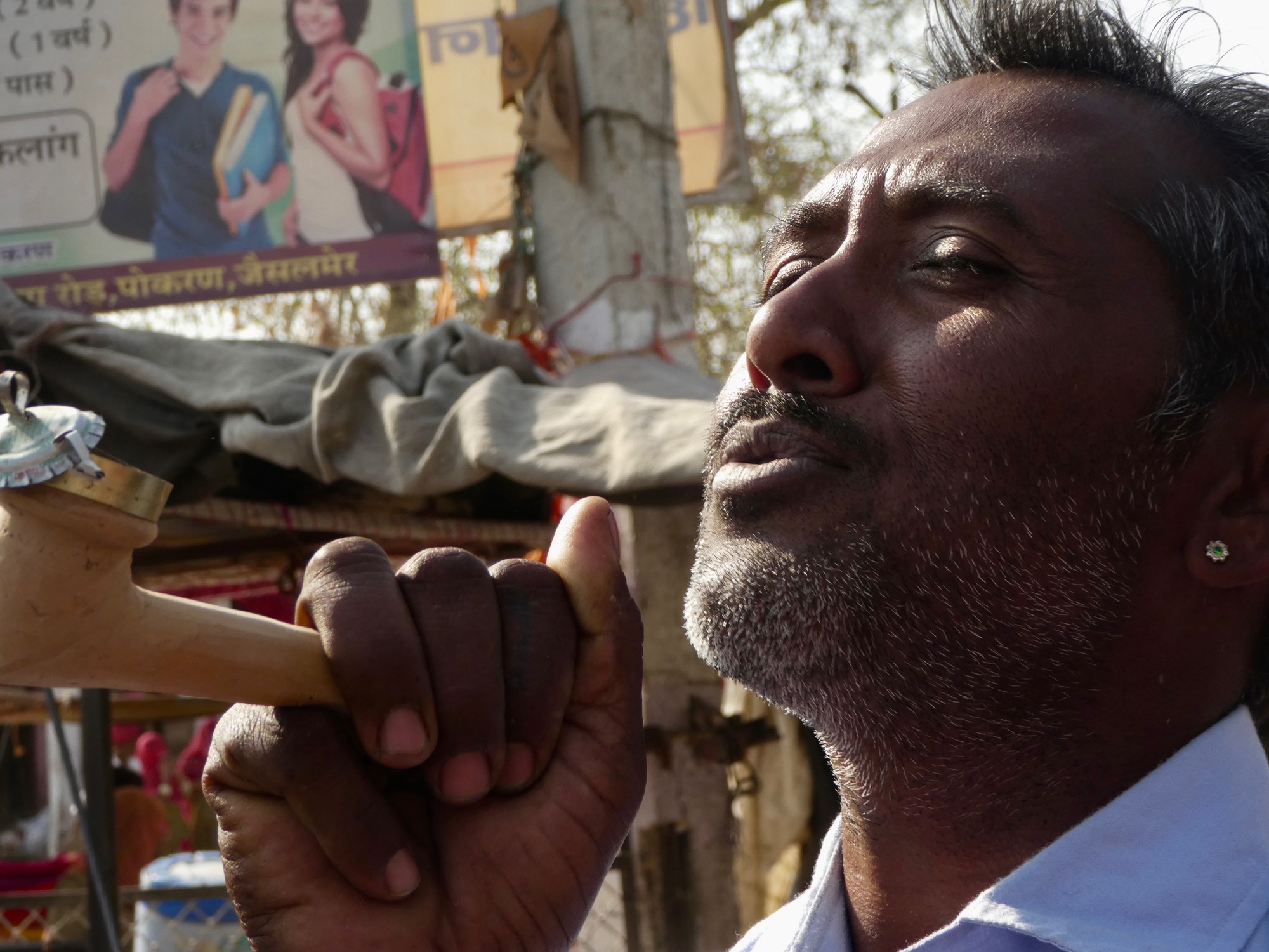 Auch beim Mittagsstopp erfreuen wir uns wieder an den Farben Rajasthans und es ist offensichtlich, dass es kaum einen Europäer hierher verschlägt. Kokosmilch statt Glühwein, fotofreudige Ehefrauen, eine Bruzzel-Show eines strahlenden Straßenhändlers, Korbflechtdemonstrationen, neugierig spickelnde Kinder aus einem Bus … und ganz viel „Hello! Namaste!“… einfach nur nett solch eine Mittagspause!!!