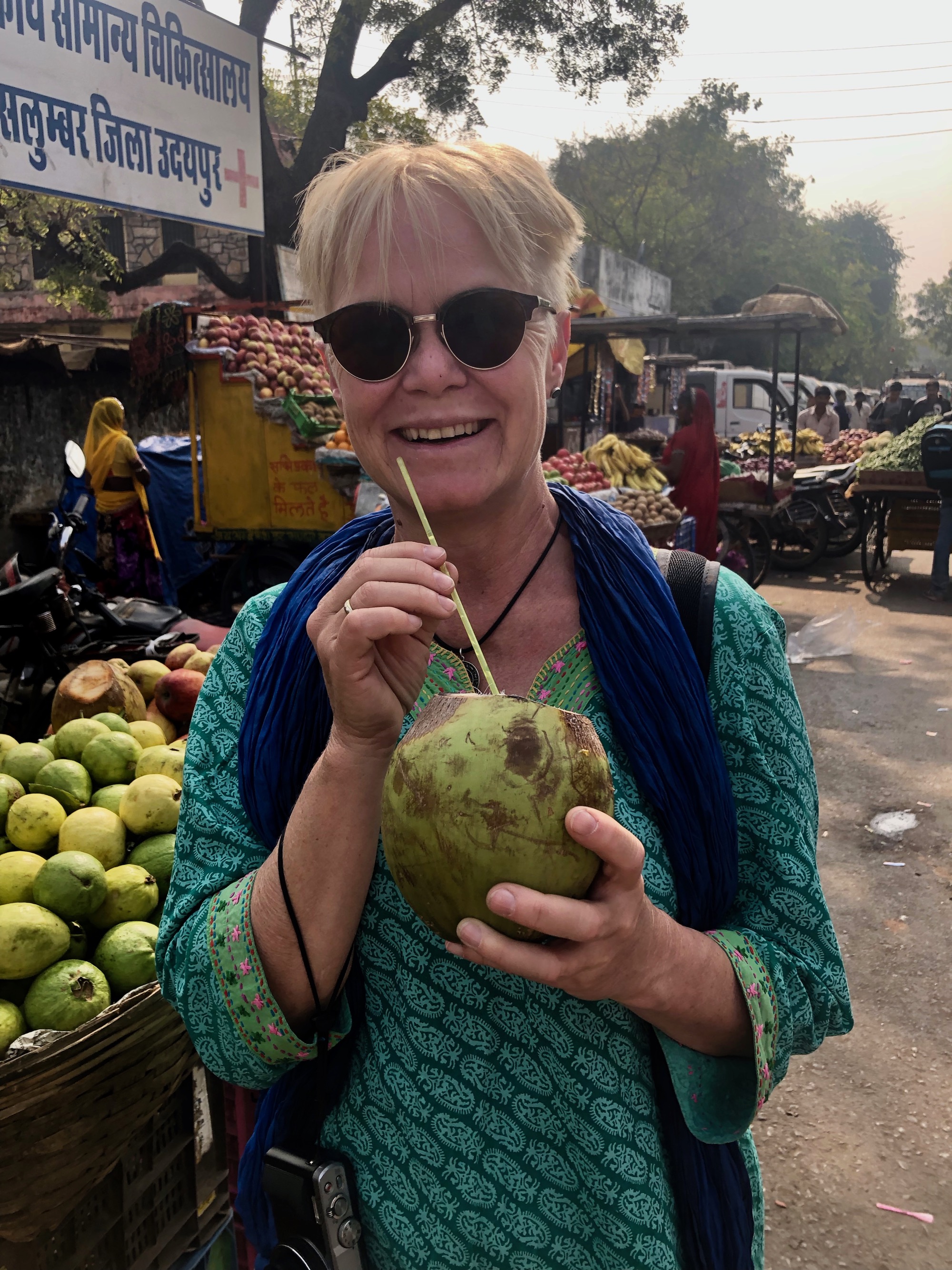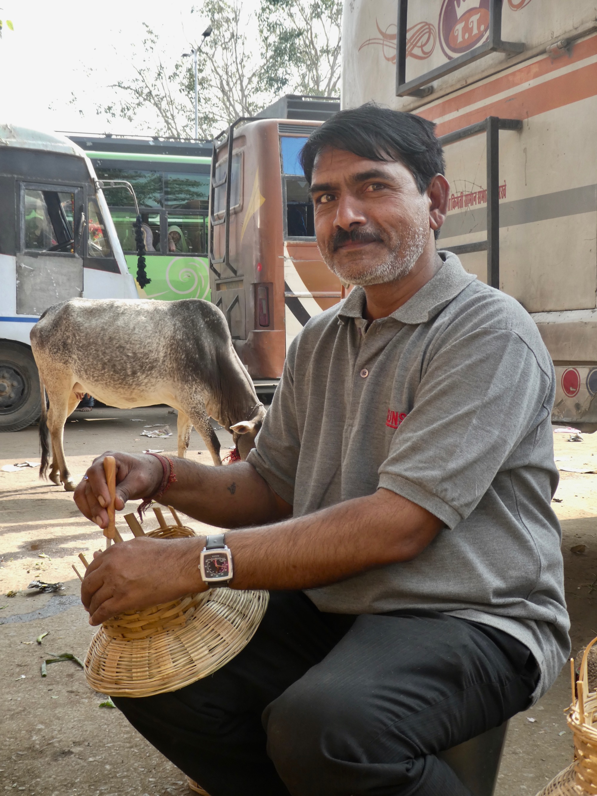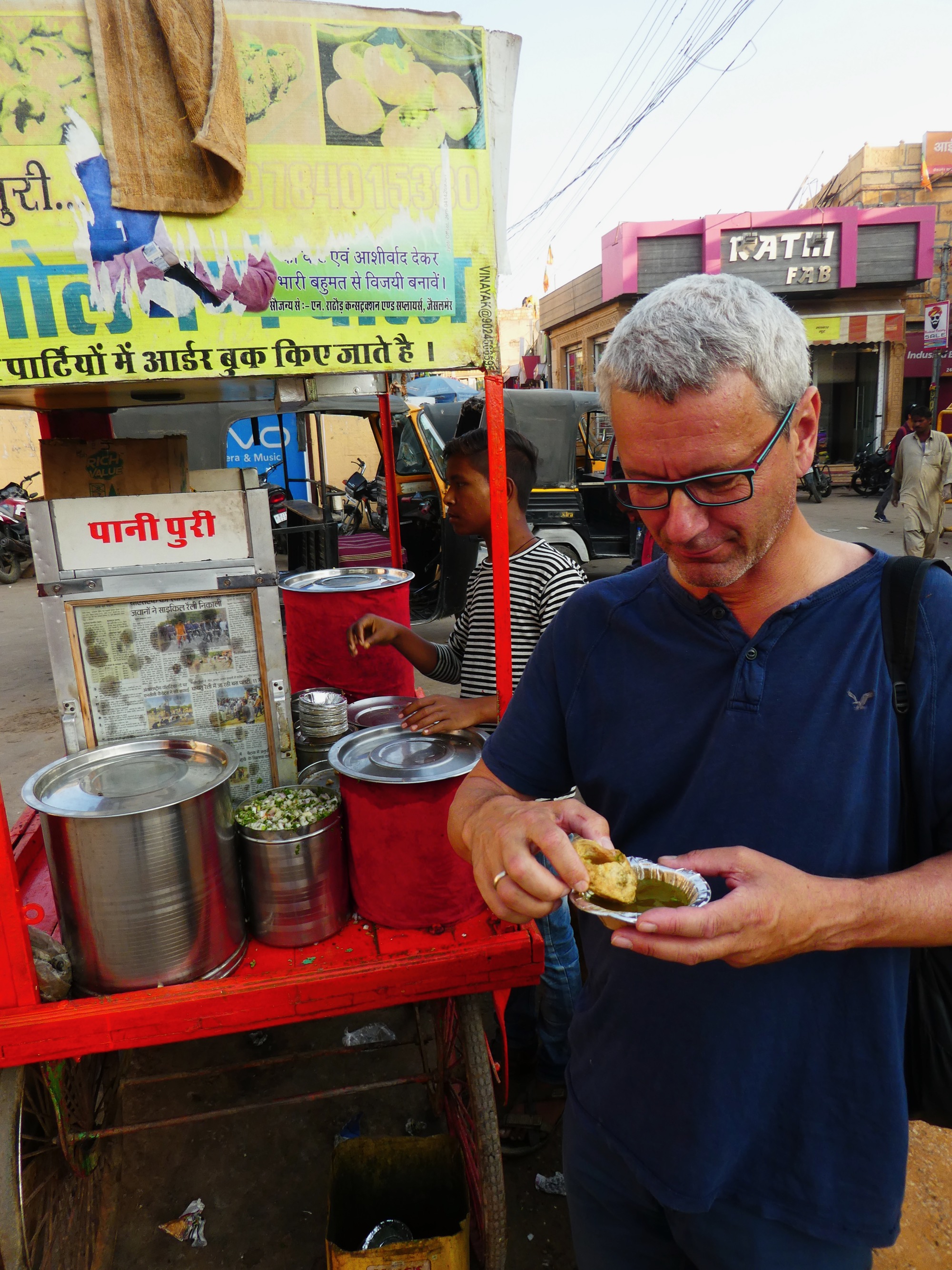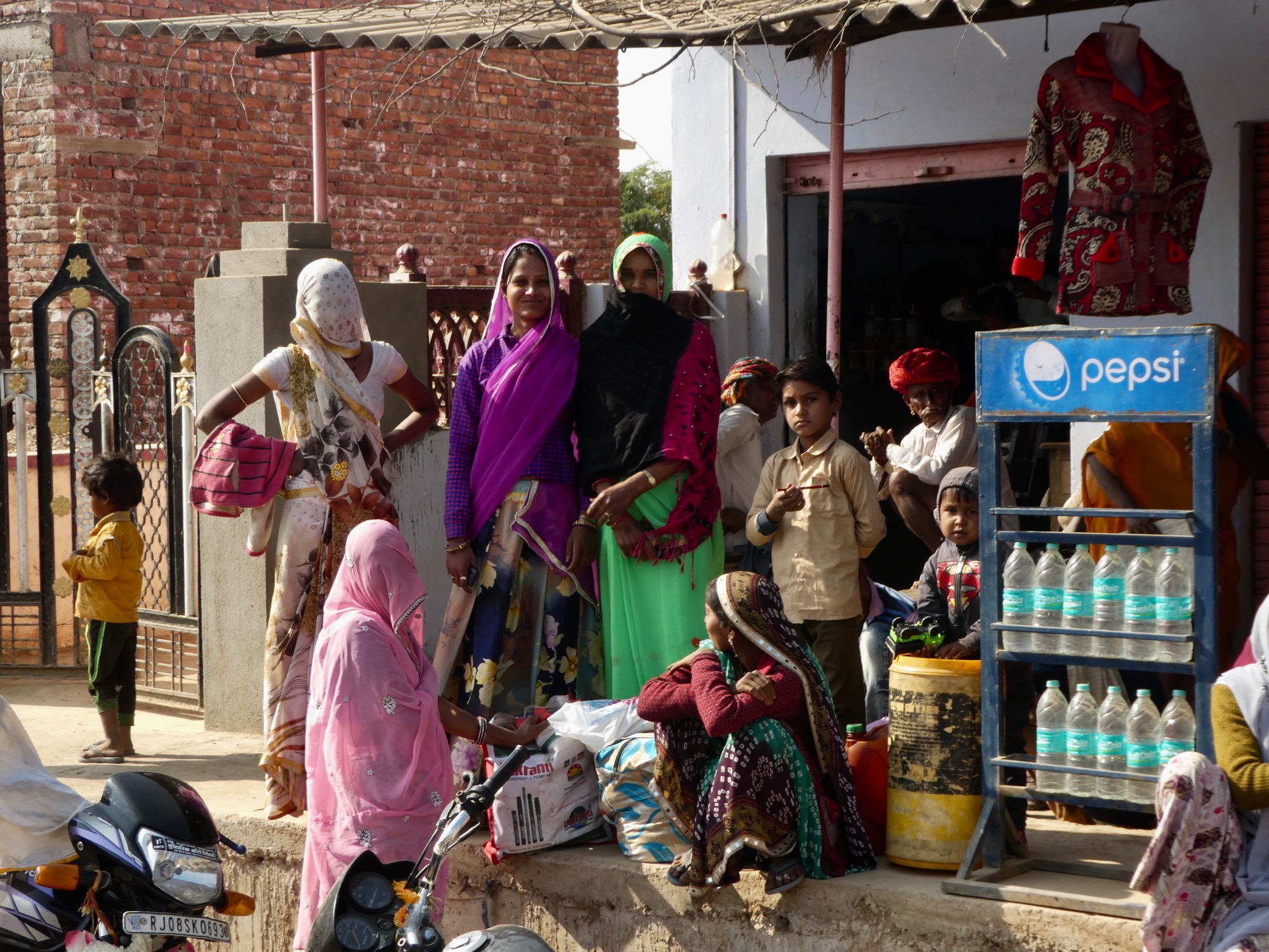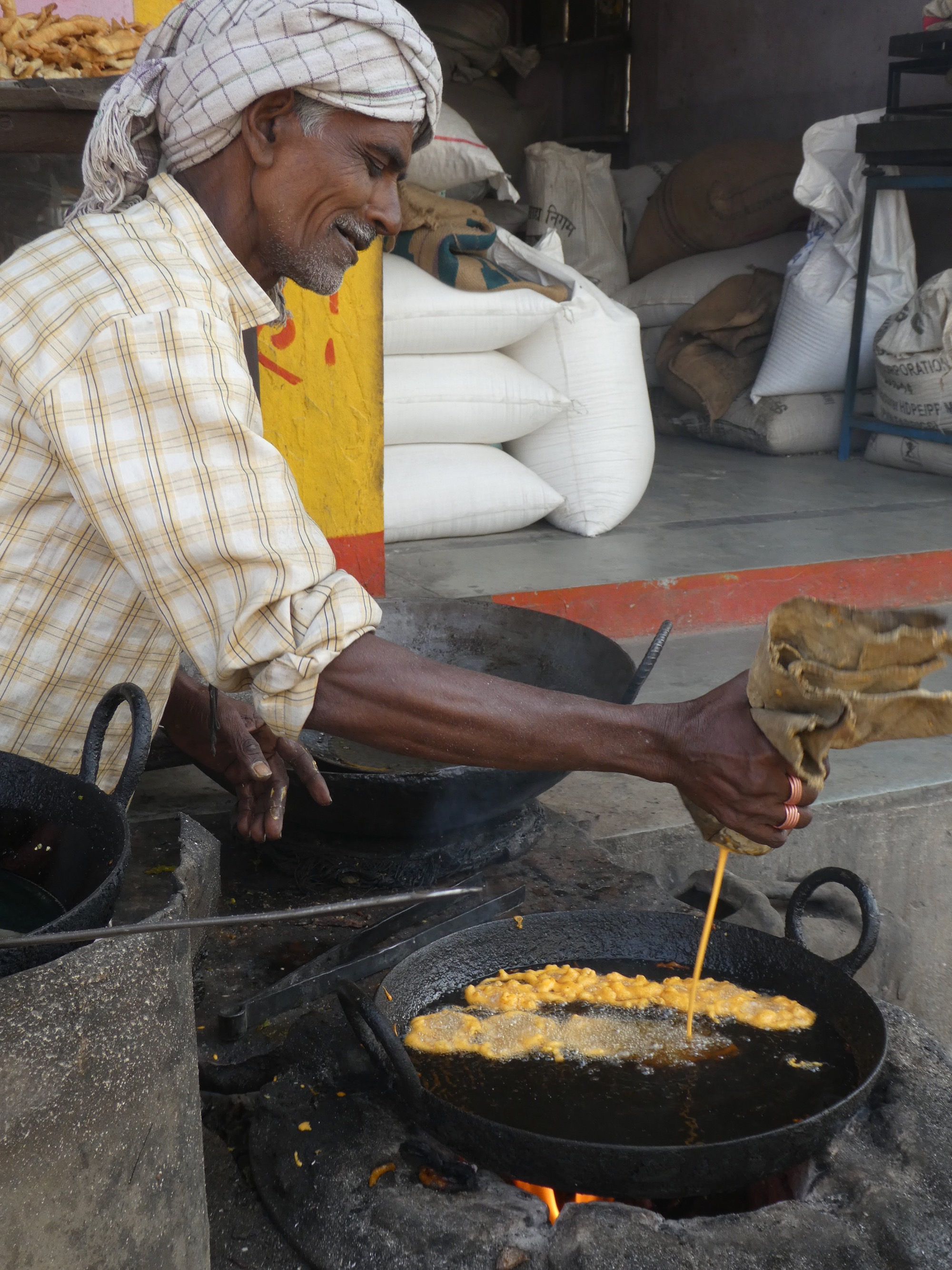 Auch beim Mittagsstopp erfreuen wir uns wieder an den Farben Rajasthans und es ist offensichtlich, dass es kaum einen Europäer hierher verschlägt. Kokosmilch statt Glühwein, fotofreudige Ehefrauen, eine Bruzzel-Show eines strahlenden Straßenhändlers, Korbflechtdemonstrationen, neugierig spickelnde Kinder aus einem Bus … und ganz viel „Hello! Namaste!“… einfach nur nett solch eine Mittagspause!!!