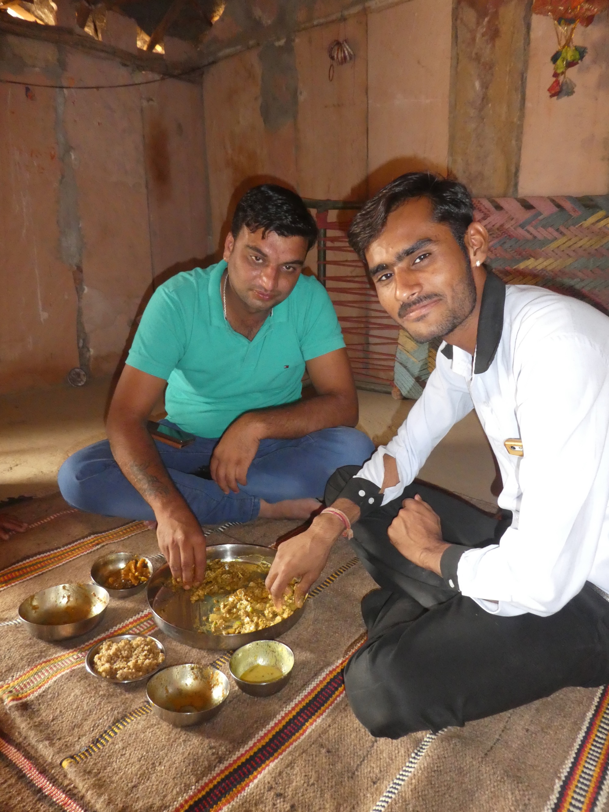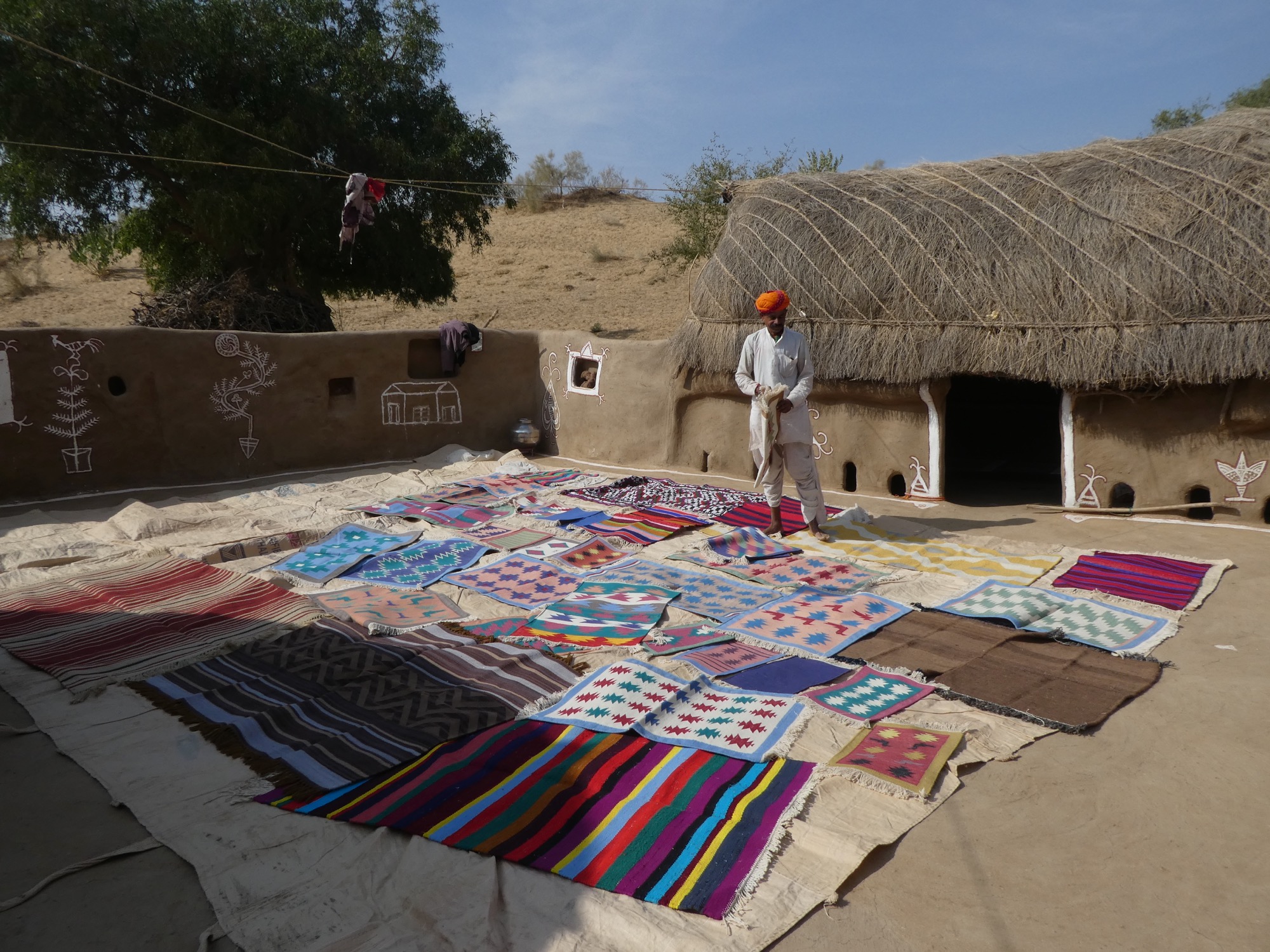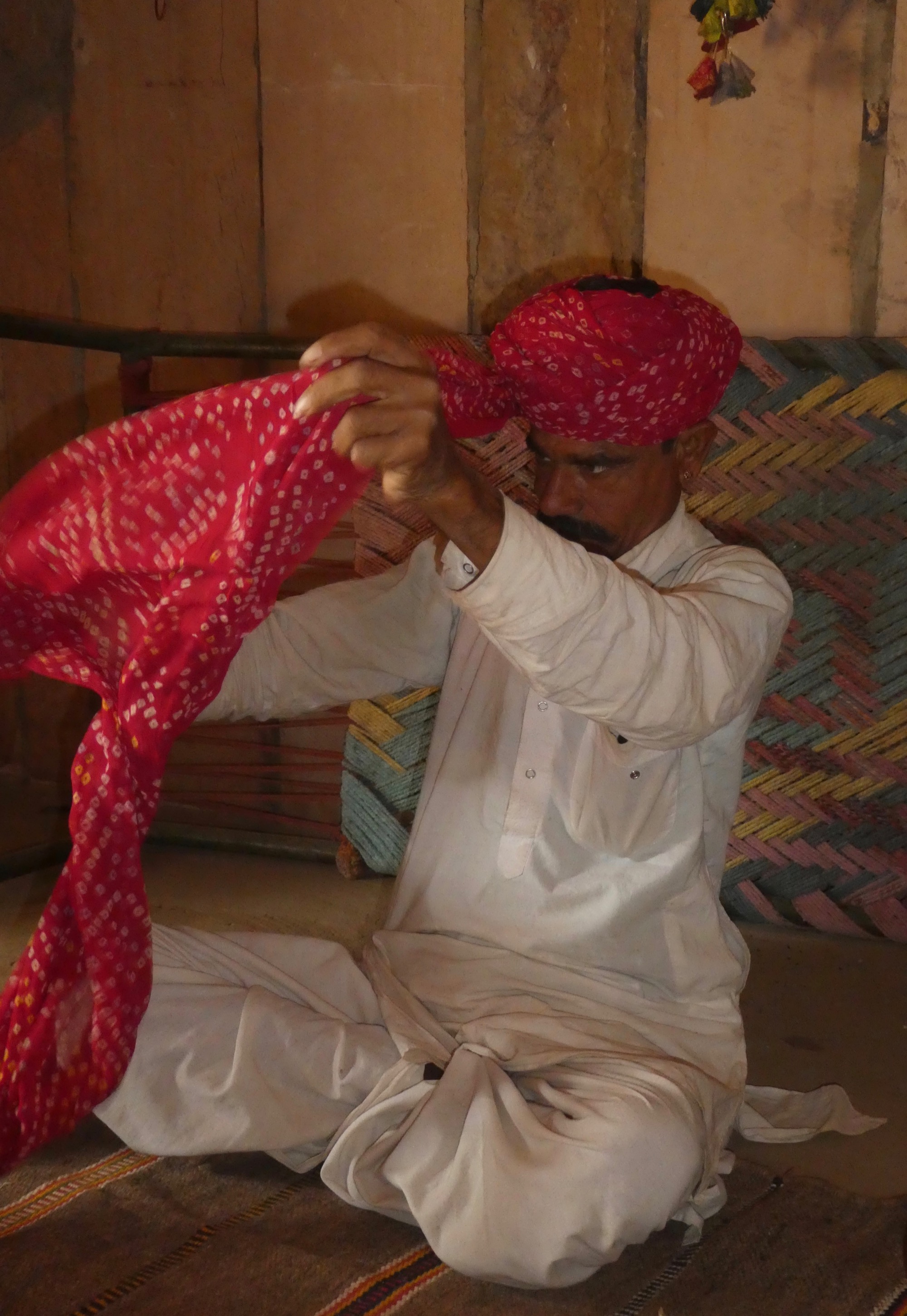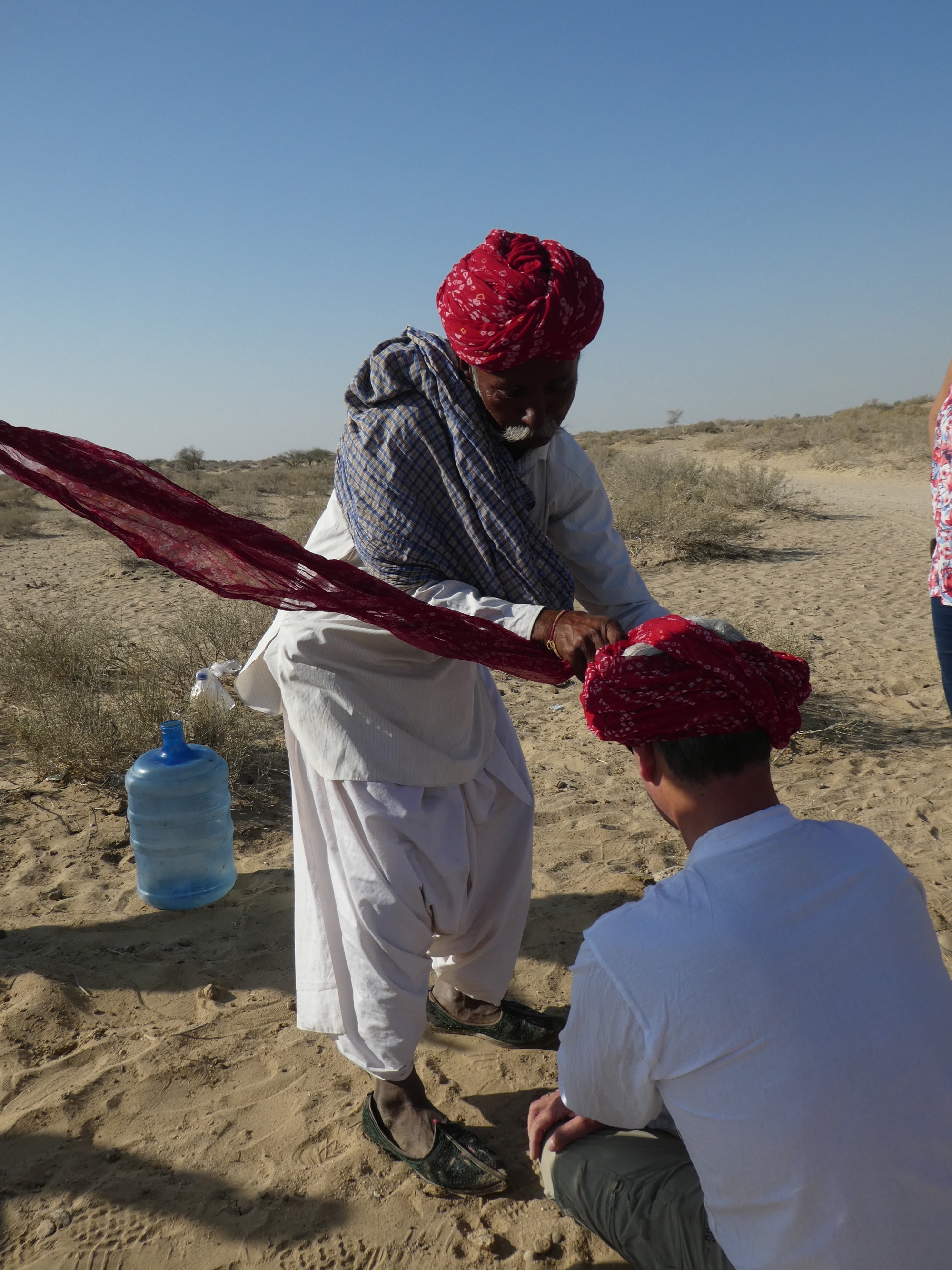 Zum Mittagessen sind wir zu Gast bei einer Familie und bewundern die mit Ornamenten geschmückten Lehmhäuschen und die selbstgewebten Teppiche. Nach einem „original rajasthanischen Wüstenessen“ bekommt Chris noch gezeigt wie man den Safa gekonnt auf dem Kopf drapiert. Und schon ist die Idee geboren „So etwas braucht Mann auch!!!“ Ich finde die Safas auch super schön wie ihr im Verlauf des Beitrags an den Fotos sehen könnt. Es sind herrliche Farbklekse in der Wüstenlandschaft Rajasthans!