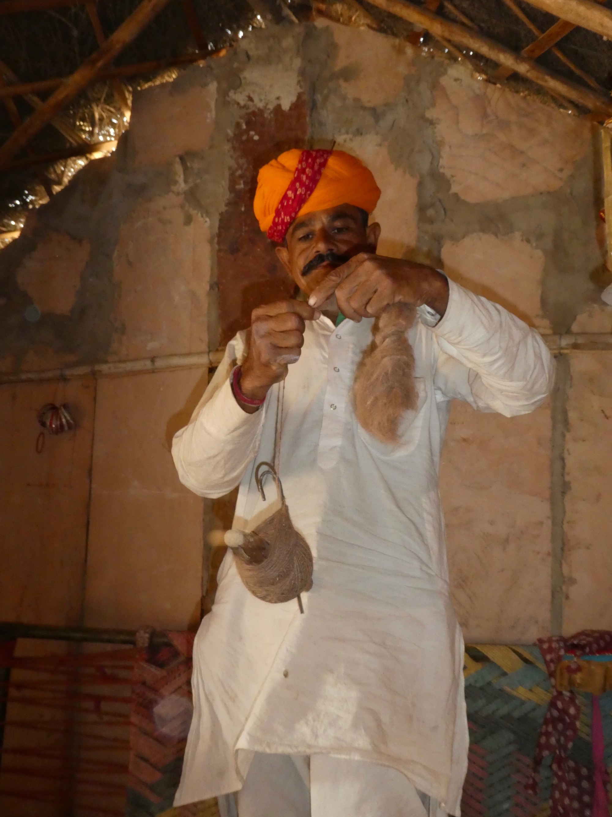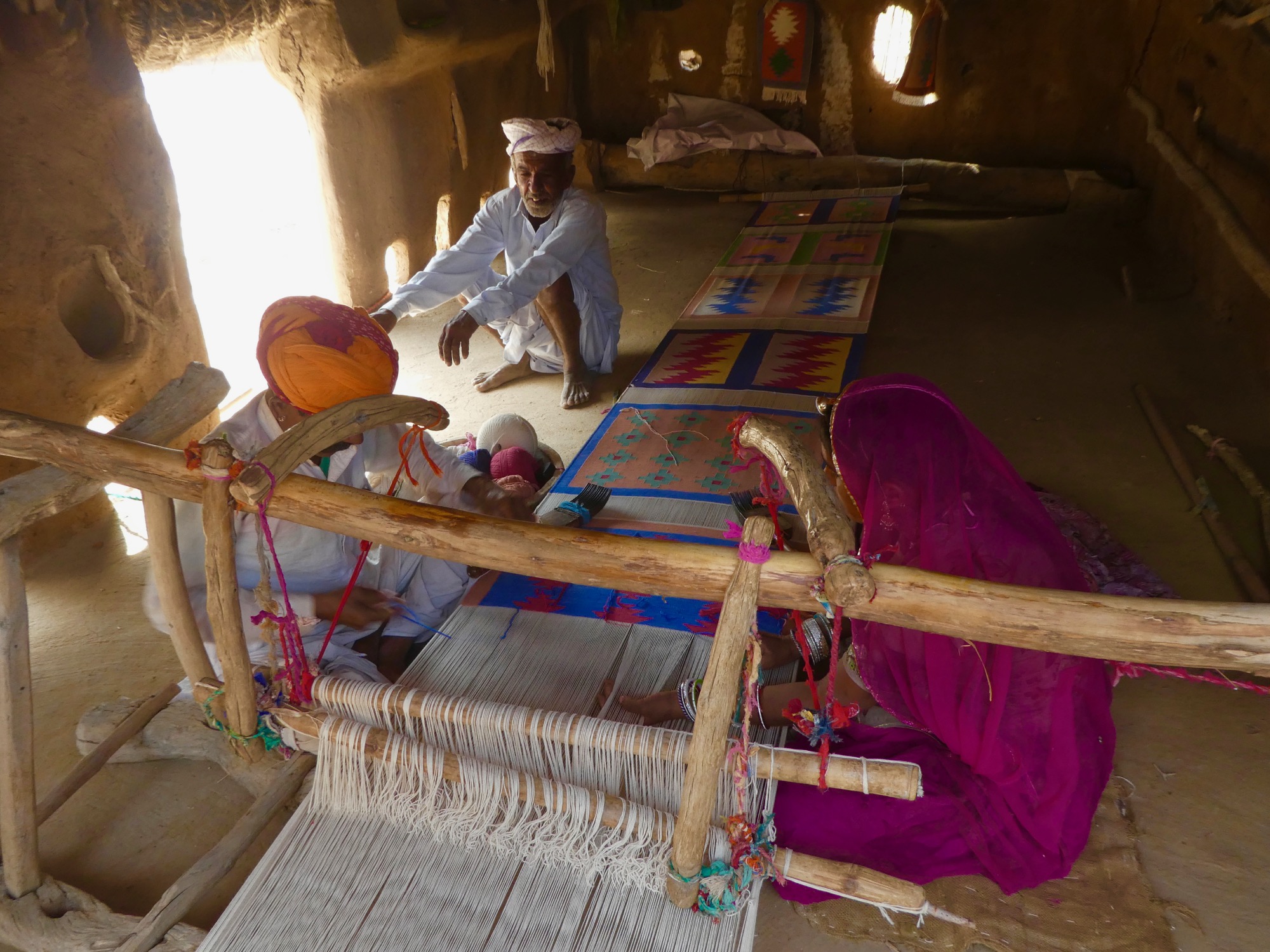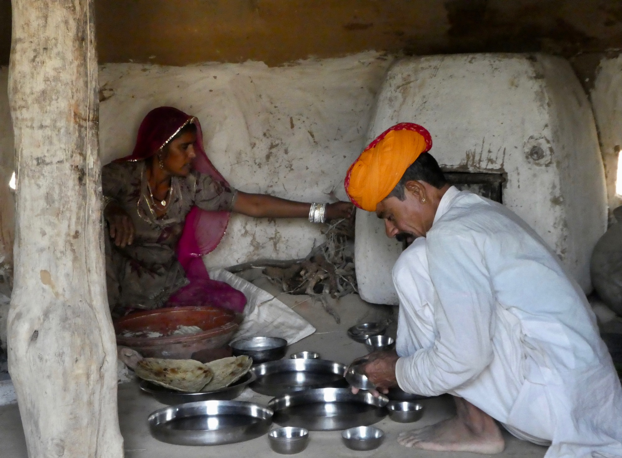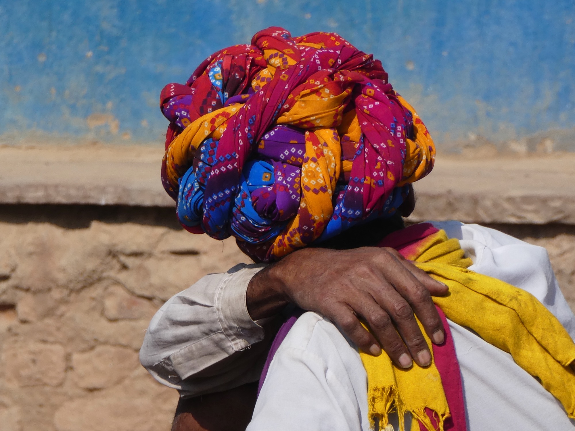 Zum Mittagessen sind wir zu Gast bei einer Familie und bewundern die mit Ornamenten geschmückten Lehmhäuschen und die selbstgewebten Teppiche. Nach einem „original rajasthanischen Wüstenessen“ bekommt Chris noch gezeigt wie man den Safa gekonnt auf dem Kopf drapiert. Und schon ist die Idee geboren „So etwas braucht Mann auch!!!“ Ich finde die Safas auch super schön wie ihr im Verlauf des Beitrags an den Fotos sehen könnt. Es sind herrliche Farbklekse in der Wüstenlandschaft Rajasthans!