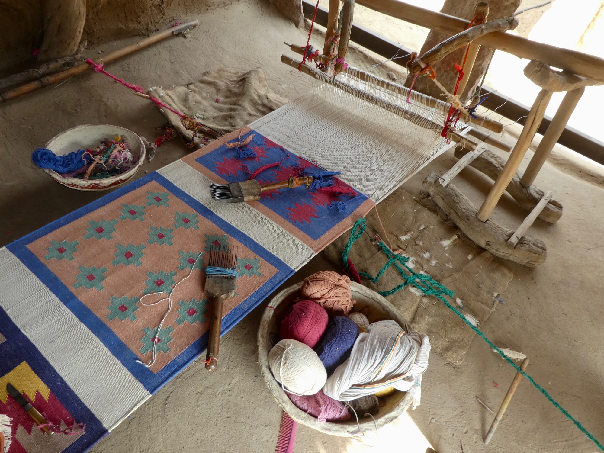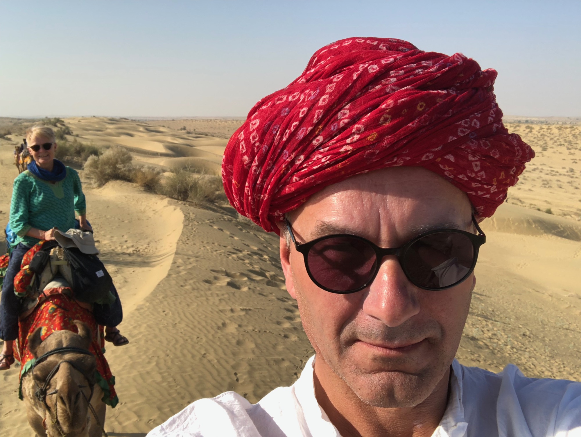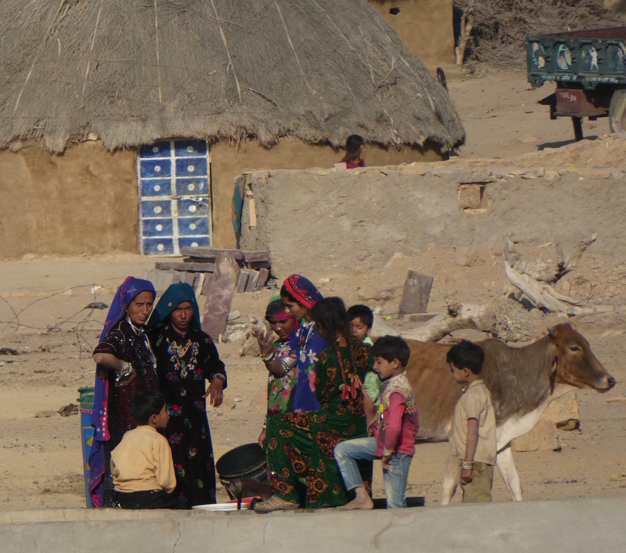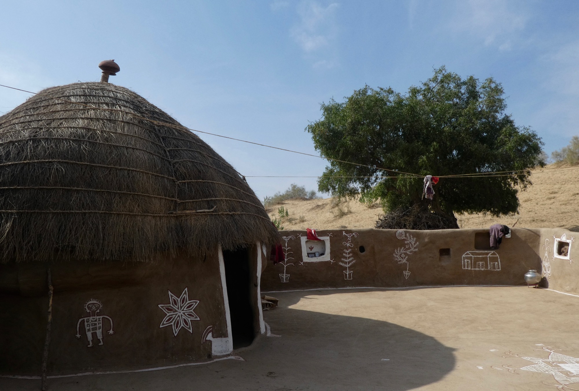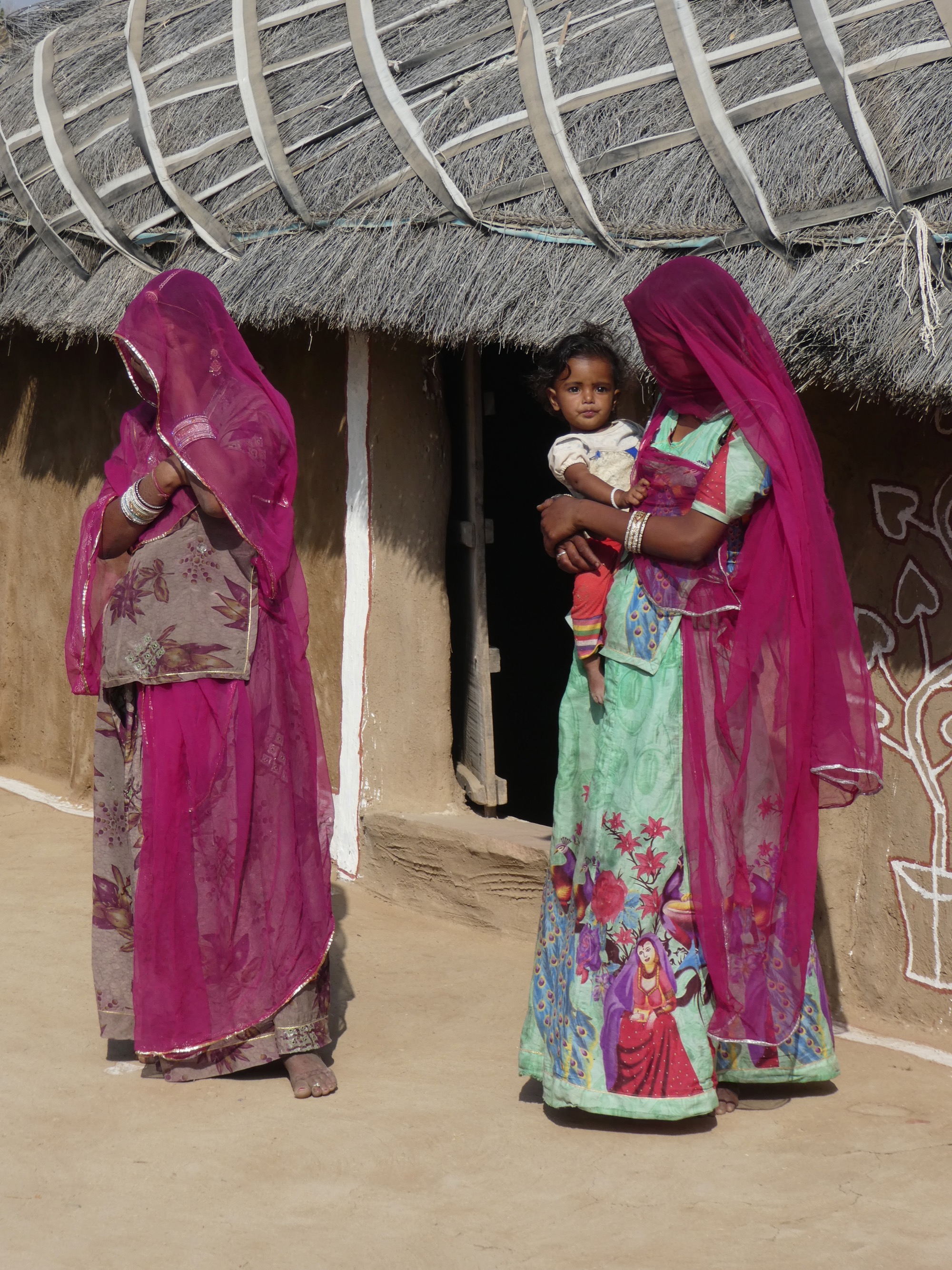 Zum Mittagessen sind wir zu Gast bei einer Familie und bewundern die mit Ornamenten geschmückten Lehmhäuschen und die selbstgewebten Teppiche. Nach einem „original rajasthanischen Wüstenessen“ bekommt Chris noch gezeigt wie man den Safa gekonnt auf dem Kopf drapiert. Und schon ist die Idee geboren „So etwas braucht Mann auch!!!“ Ich finde die Safas auch super schön wie ihr im Verlauf des Beitrags an den Fotos sehen könnt. Es sind herrliche Farbklekse in der Wüstenlandschaft Rajasthans!