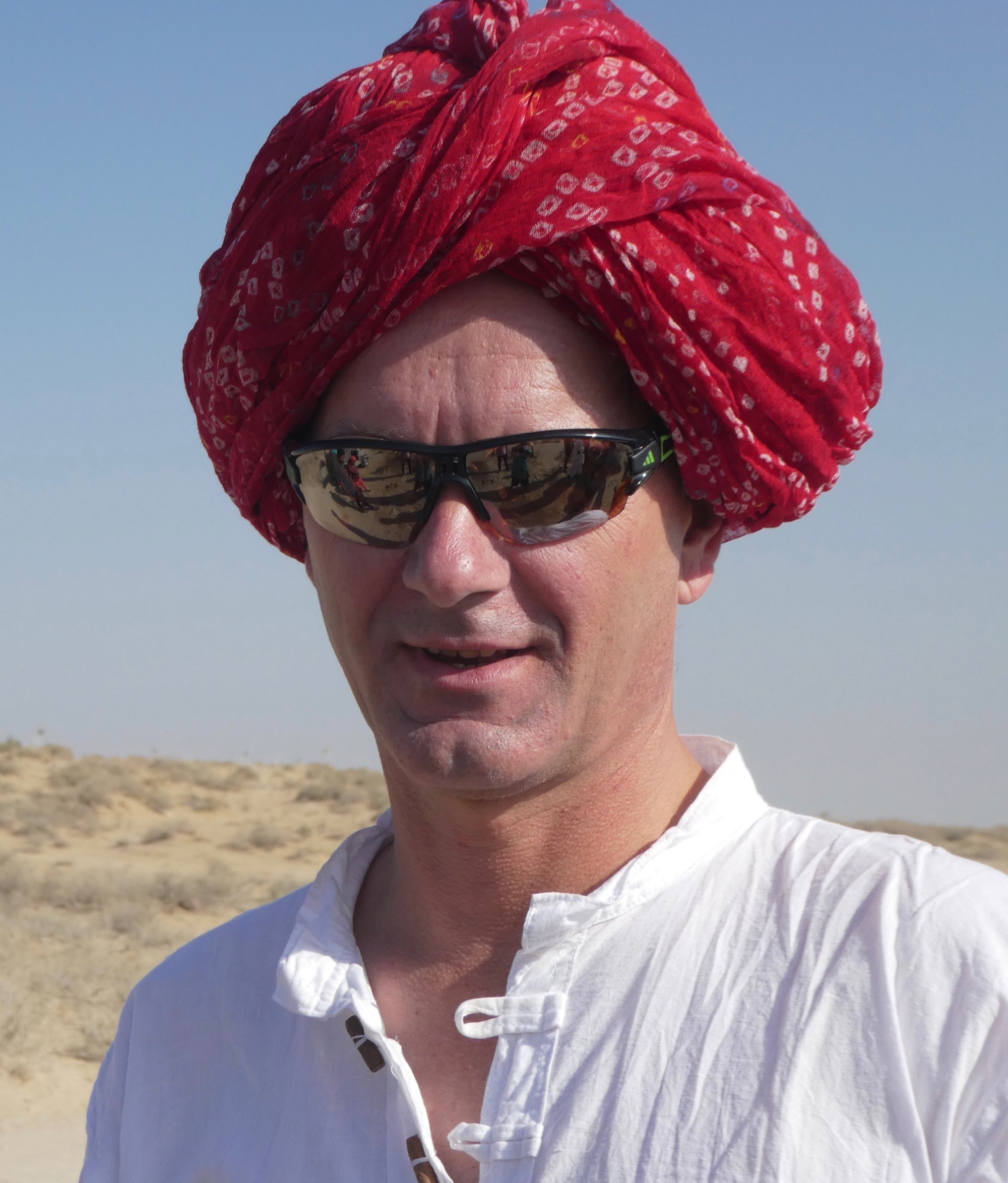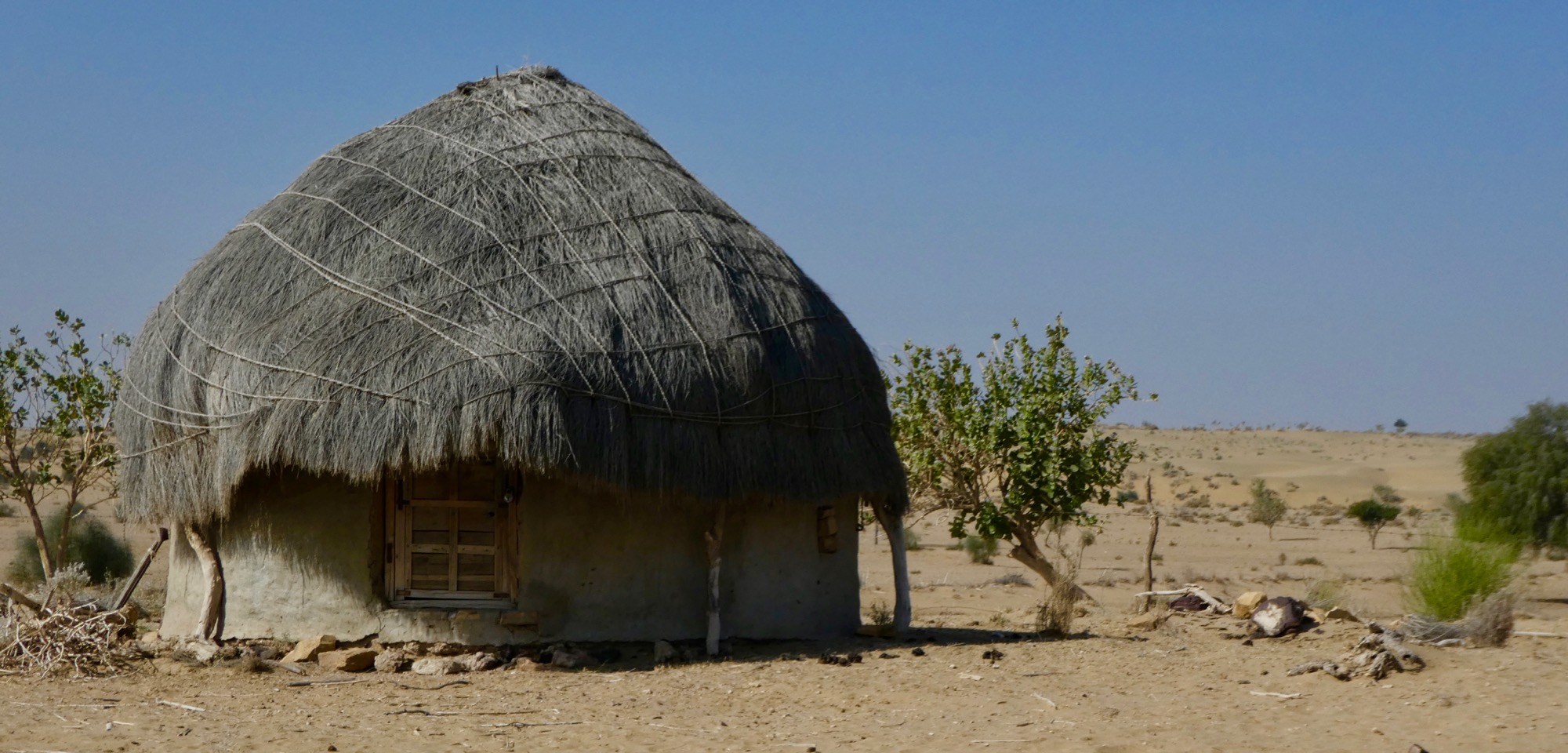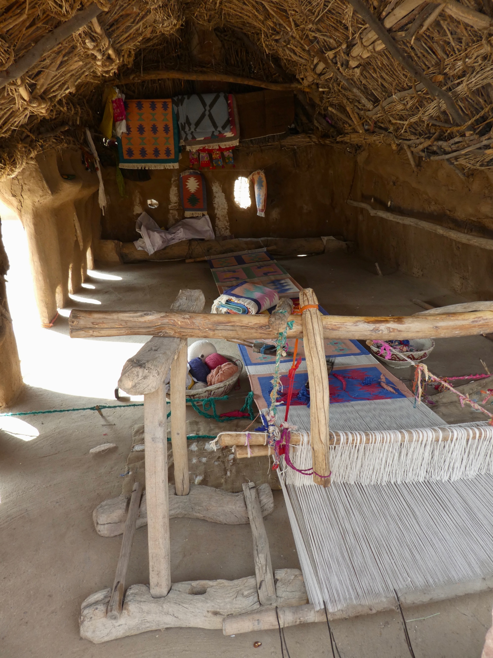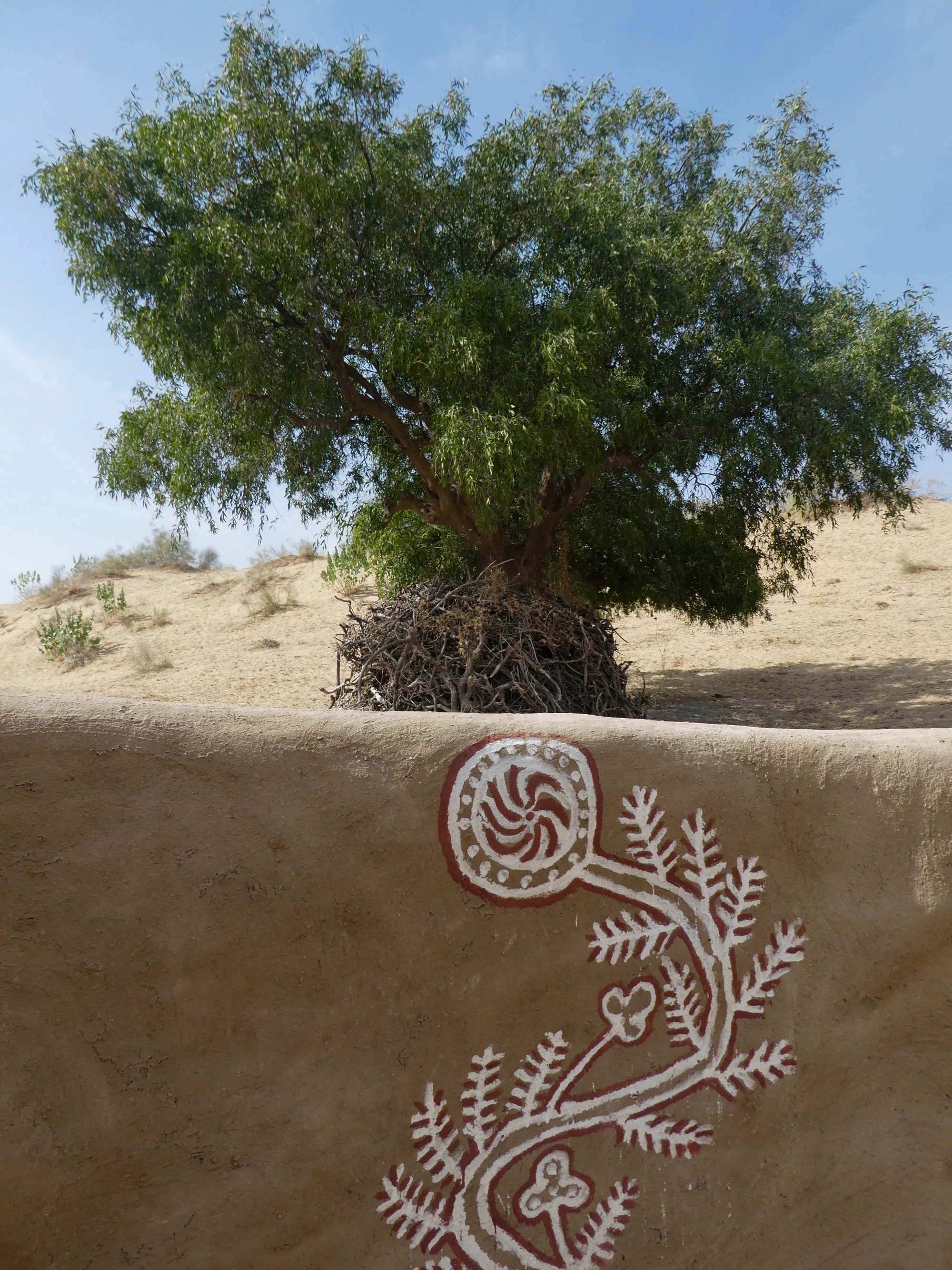 Zum Mittagessen sind wir zu Gast bei einer Familie und bewundern die mit Ornamenten geschmückten Lehmhäuschen und die selbstgewebten Teppiche. Nach einem „original rajasthanischen Wüstenessen“ bekommt Chris noch gezeigt wie man den Safa gekonnt auf dem Kopf drapiert. Und schon ist die Idee geboren „So etwas braucht Mann auch!!!“ Ich finde die Safas auch super schön wie ihr im Verlauf des Beitrags an den Fotos sehen könnt. Es sind herrliche Farbklekse in der Wüstenlandschaft Rajasthans!
