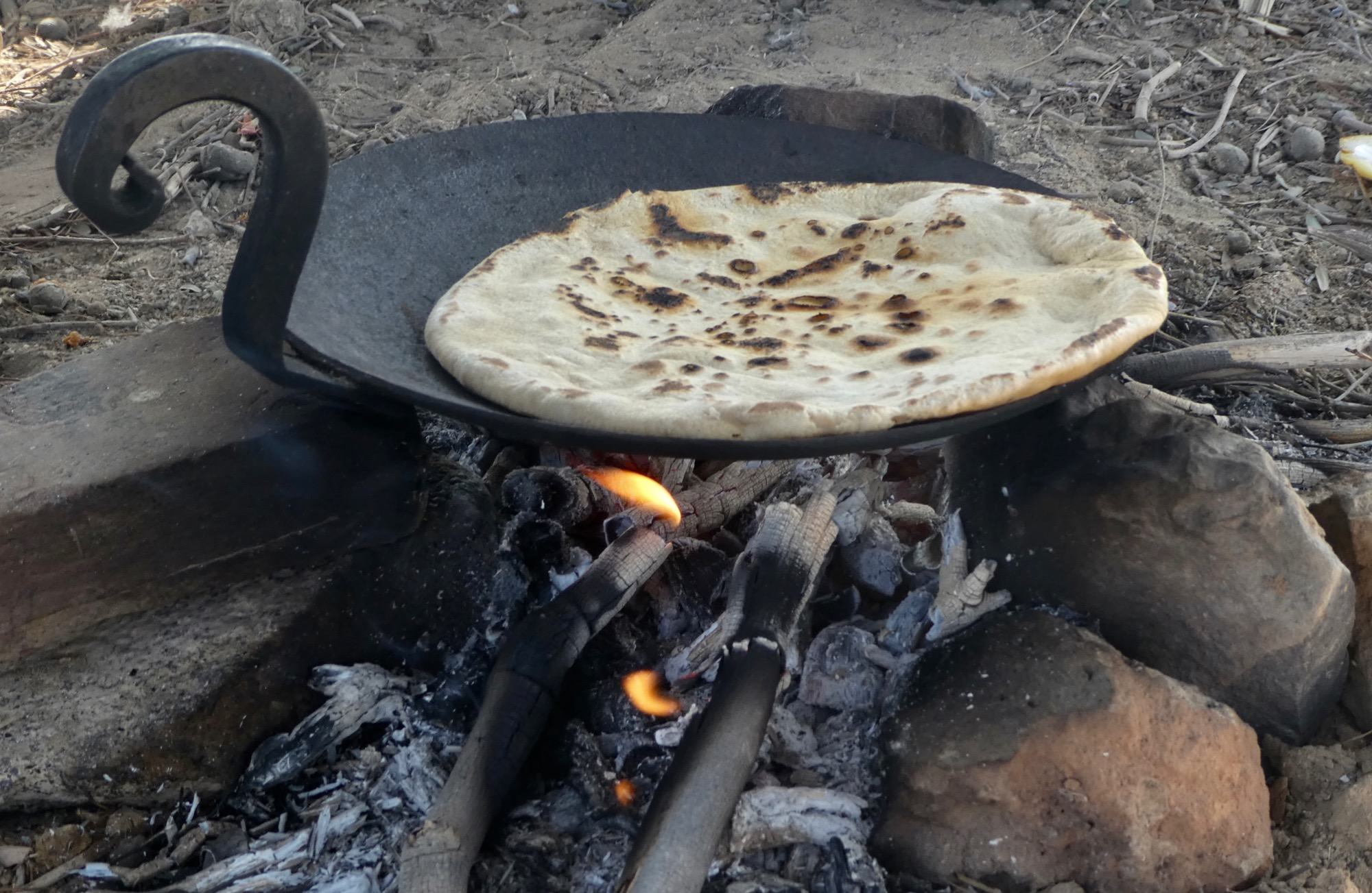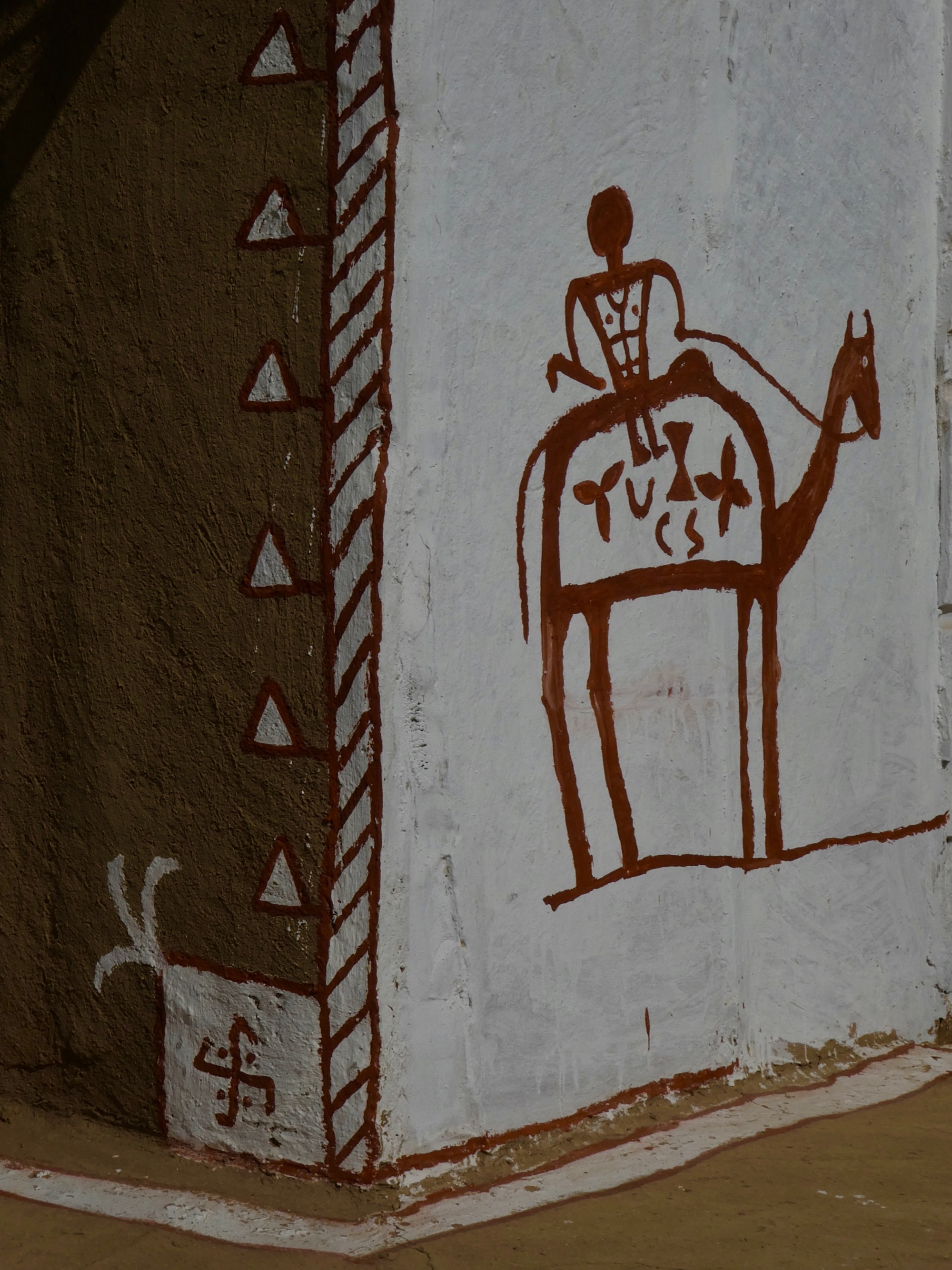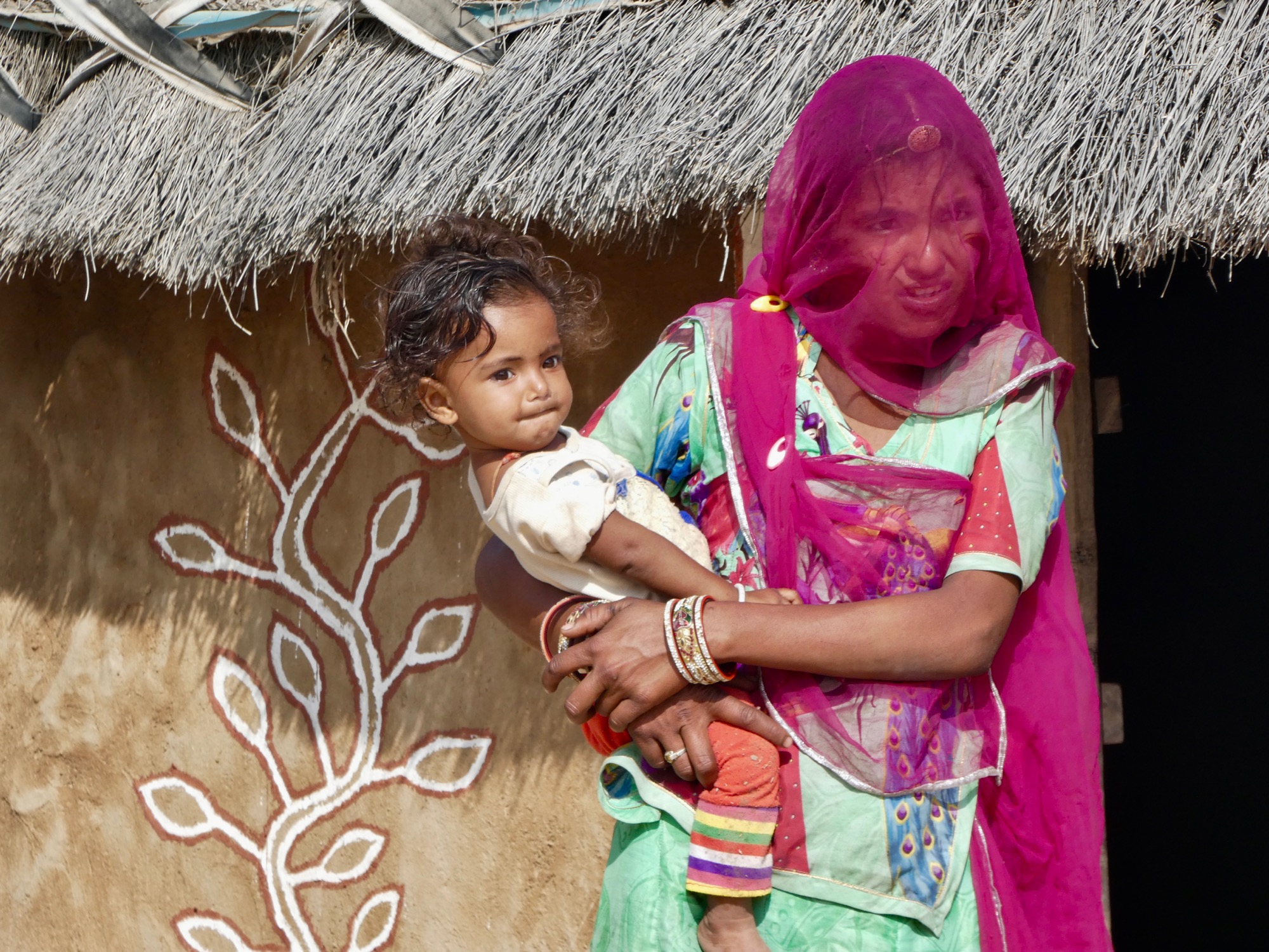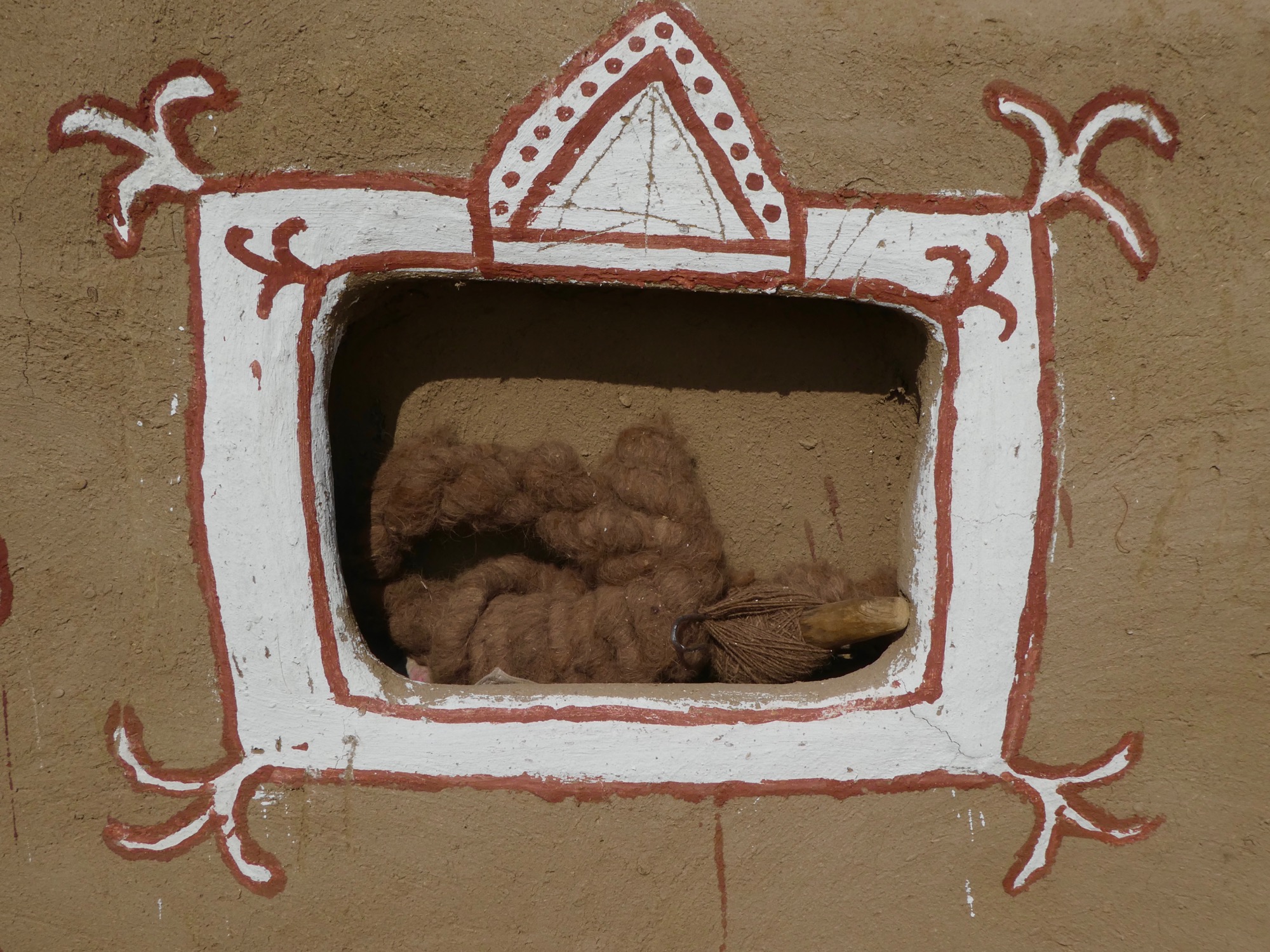 Zum Mittagessen sind wir zu Gast bei einer Familie und bewundern die mit Ornamenten geschmückten Lehmhäuschen und die selbstgewebten Teppiche. Nach einem „original rajasthanischen Wüstenessen“ bekommt Chris noch gezeigt wie man den Safa gekonnt auf dem Kopf drapiert. Und schon ist die Idee geboren „So etwas braucht Mann auch!!!“ Ich finde die Safas auch super schön wie ihr im Verlauf des Beitrags an den Fotos sehen könnt. Es sind herrliche Farbklekse in der Wüstenlandschaft Rajasthans!