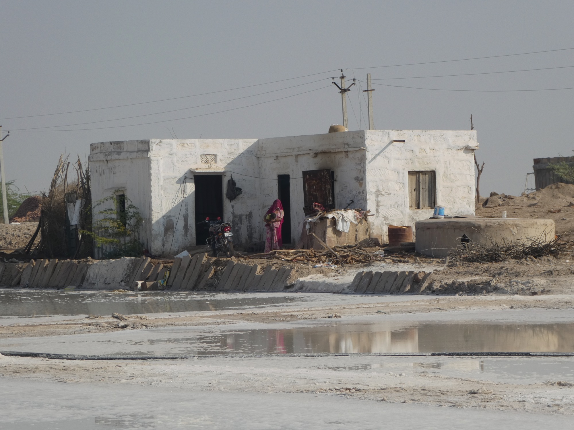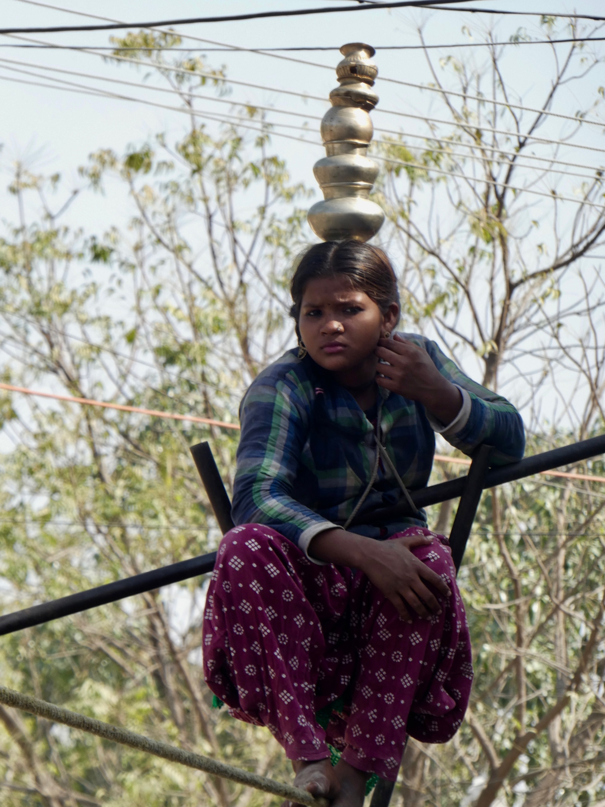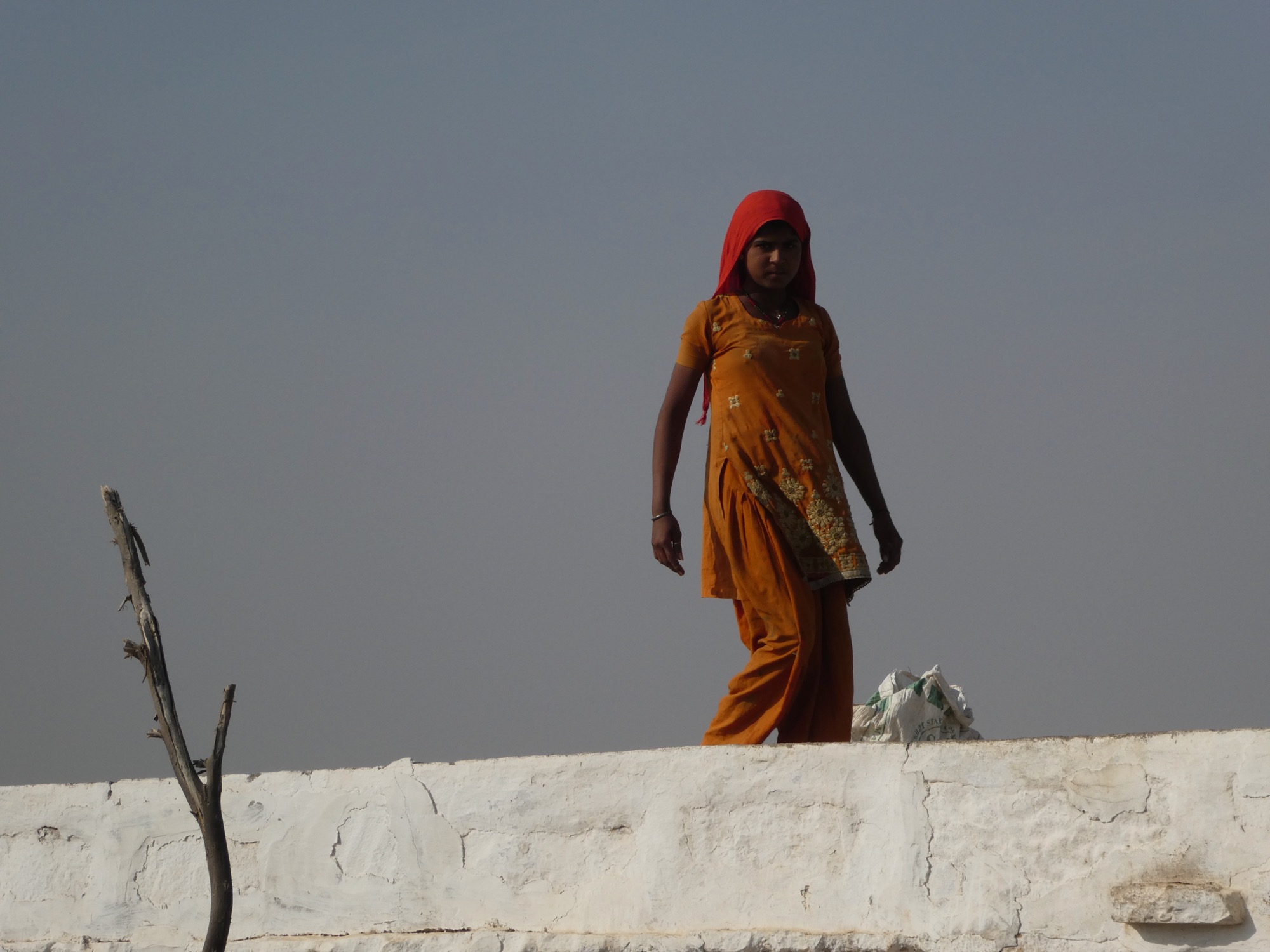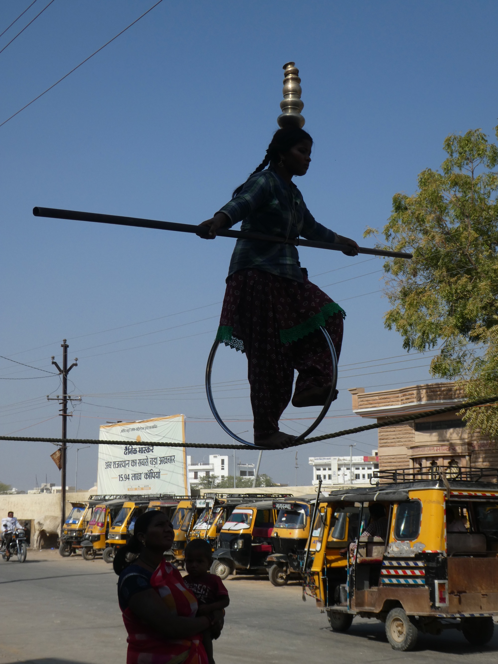 Am nächsten Tag fahren wir so richtig „über Land“ Richtung Phalodi – die Stopps unterwegs zum Beinevertreten und für einen Chai sind immer ein Erlebnis. Gleich beim ersten Stopp können wir ein Mädchen bei Akrobatik auf dem Hochseil beobachten – sooo cool!