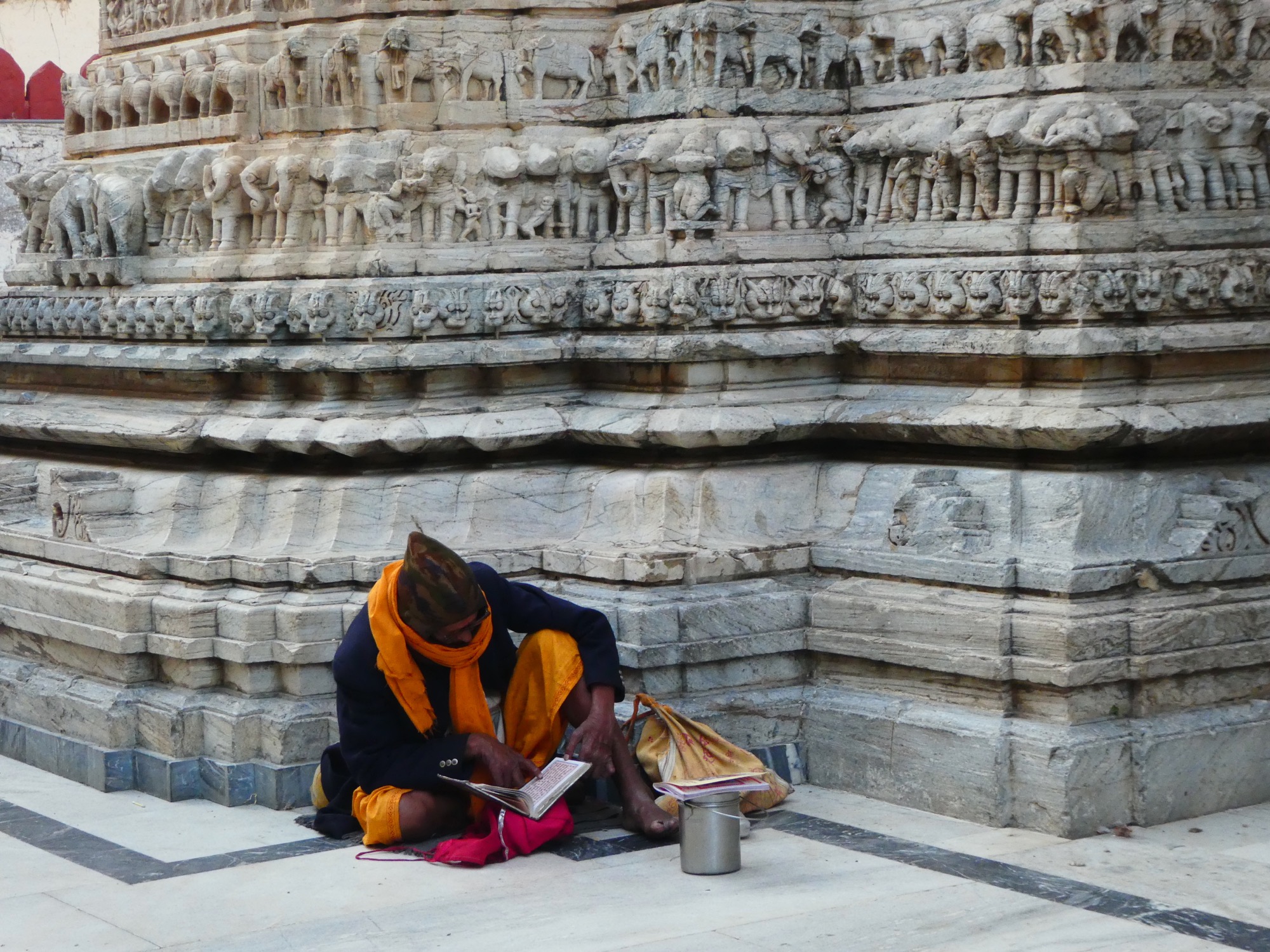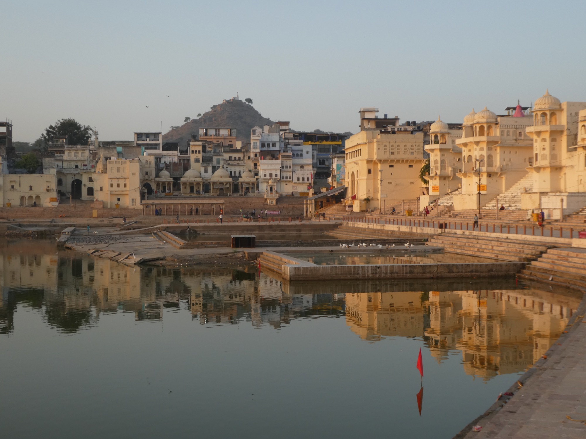 Heute geht es weiter nach Pushkar, bekannt für seine Ghats an einem kleinen See in der Stadtmitte. Pushkar ist einer der wenigen heiligen Orte für den Gott Brahman – als ihm eine Lotusblüte herunterfiel entstand der See mitten in der Wüste … Auf dem Weg nach Pushkar bewundern wir an einem weiteren See noch Unmengen von Pelikanen – mit denen hätte ich in Indien irgendwie nicht gerechnet … In Pushkar werden wir gleich mal zum nächsten Ghat am See gelotst: Echt ein netter Trick – jemand drückt dir freundlich eine Handvoll Blüten mehr oder minder im Vorbeifahren in die Hand. Die Blüten sollen wir schnell noch in den See werfen … sind NUR heute wirksam zum Wohle der ganzen Familie … oder was du dir sonst so wünscht. Na ja, kann ja nicht schaden – und so einen ersten Blick auf den See wollen wir gerne werfen. Dort empfangen uns zwei freundliche „Priester“ und zelebrieren mit jedem von uns eine kleine Puja … Vorsagen, Nachsprechen (… was ich da auch immer auf Hindi vor mich hinmurmel … innerlich schon fluchend: „WIE LANGE sind wir jetzt in Indien, um immer noch auf so Aktionen reinzufallen????!!!!“) Und prompt am Ende die Aufforderung vööööllig freiwillig 10$ oder so zu spenden – natürlich direkt an den Priester und jaaa nicht in die mit einem Schloss verriegelte Spendenbox. Über deren Schlitz wird im Vorbeigehen schnell eine Zeitung drapiert … die kann ich aber elegant zur Seite schieben und a bissle hätten wir ja für die Aktion schon gespendet. Aber nein, es gibt weiterhin Einwände … inzwischen wird der Priestertonfall etwas unpriesterlich … ok, wir können auch anders – und gehen ungerührt zurück zum Motorrad und suchen dann mal unser Hotel. Dort ist die Masche schon bekannt und wir erfahren, dass wir uns genau richtig verhalten haben. YES!!! (… doch schon was gelernt …)