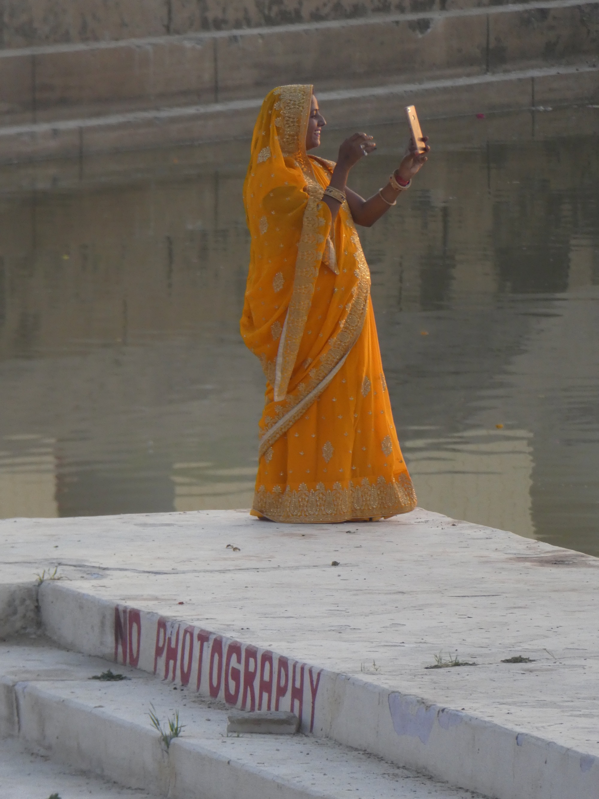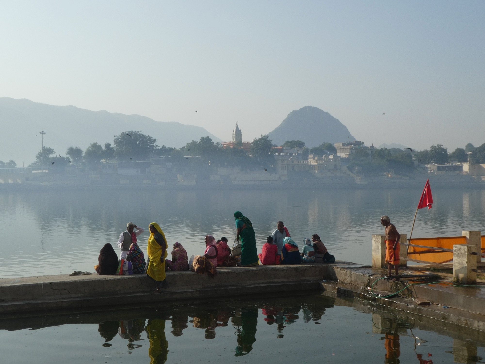 Wir genießen am Abend einen Bummel um den See herum und schauen dem heiligen Treiben dort zu … jede Menge Sadhus in Aktion, eine große Puja wird für viele Menschen zelebriert … hier und da zeigen sich alte Hippies, die sich wie in Trance zu indischer Trommelmusik im Kreise drehen … am Morgen beobachten wir wiederum die Waschrituale an den Ghats – es ist für mich immer noch etwas verwunderlich, wie frei die Menschen sich dort in aller Öffentlichkeit entkleiden und waschen, während an anderer Stelle die Frauen sich nicht in den Swimmingpool trauen oder nur im Sari baden gehen … wir halten uns dementsprechend bei unserem Morgenspaziergang auch lieber etwas im Hintergrund.