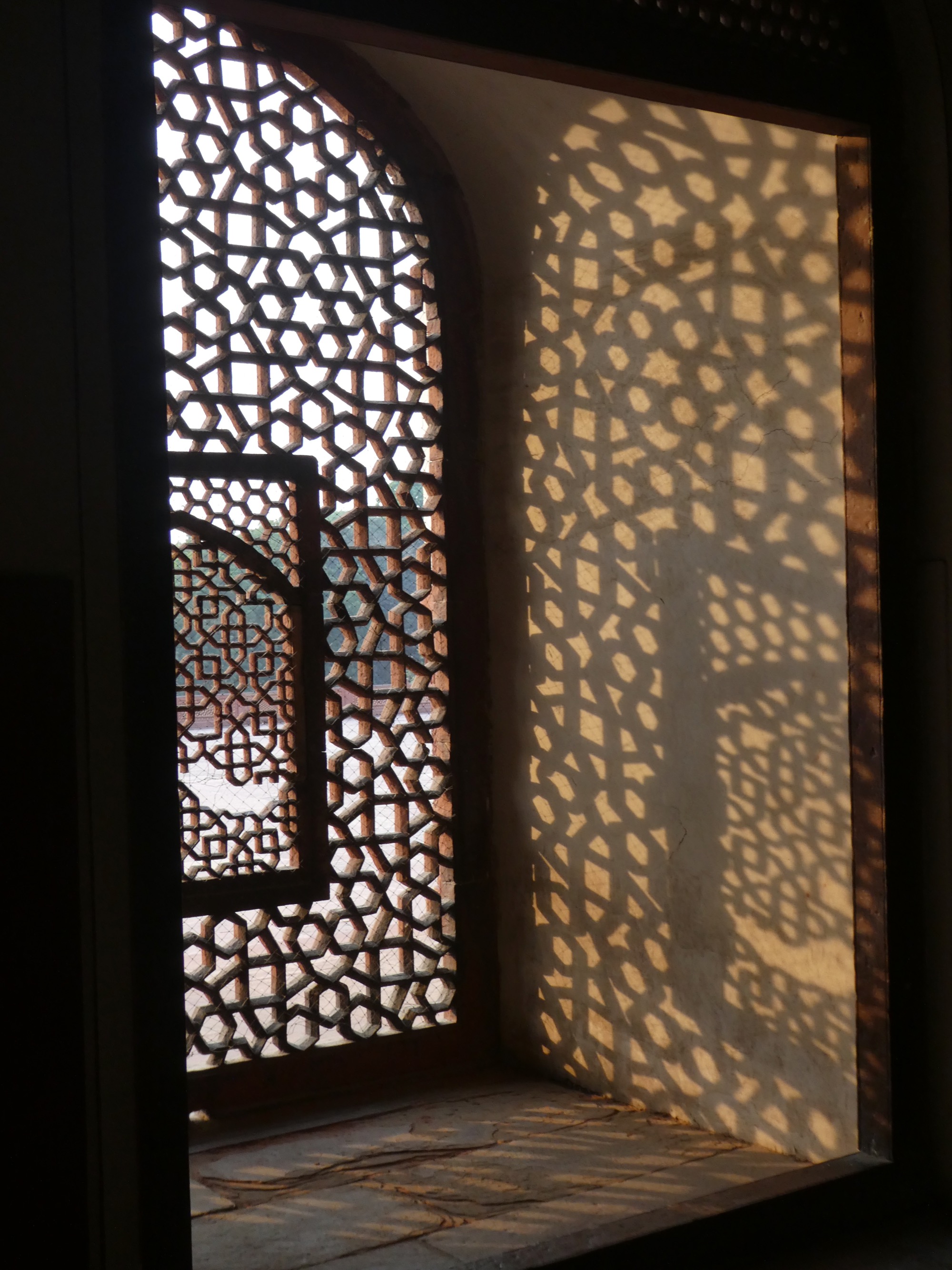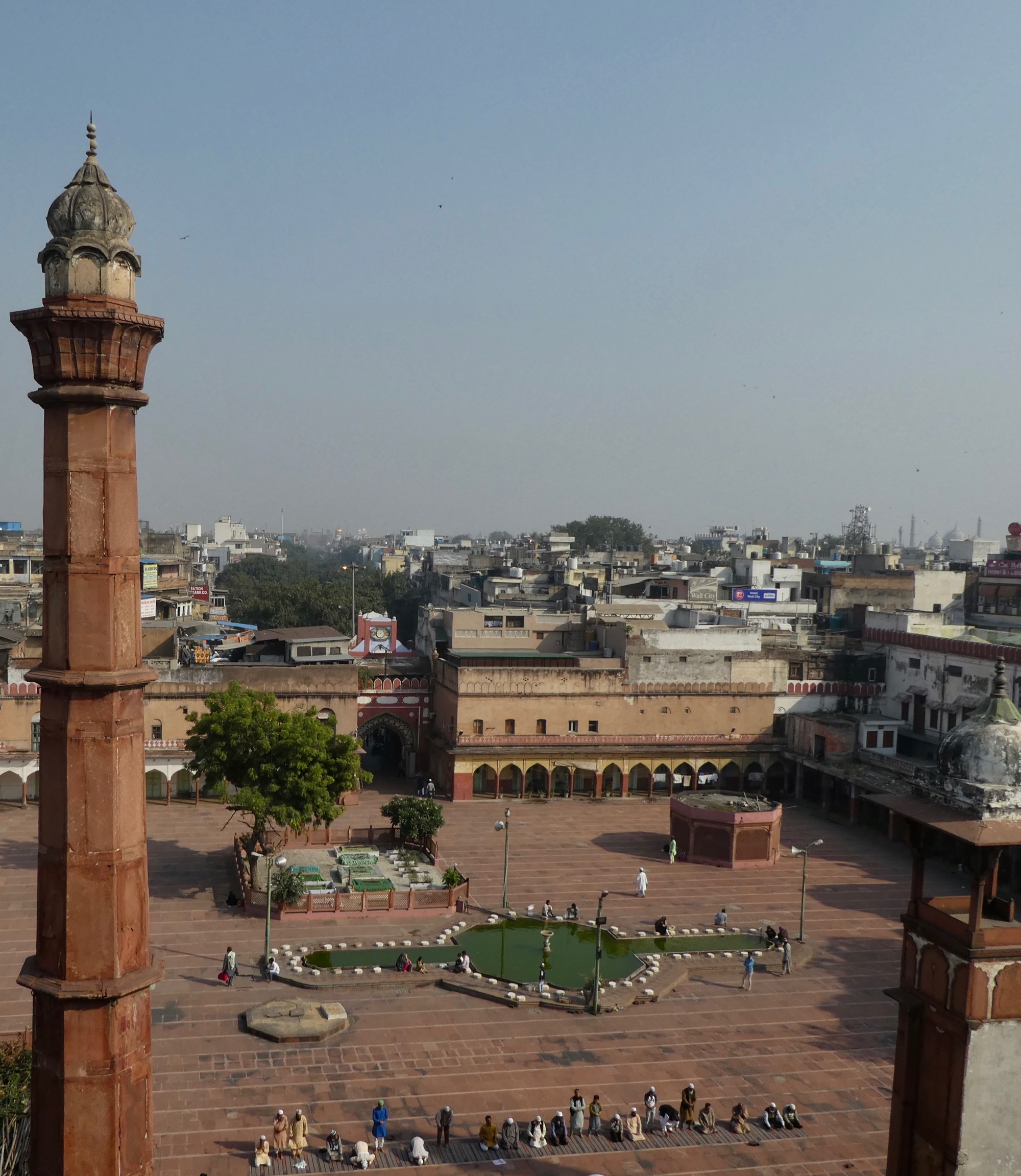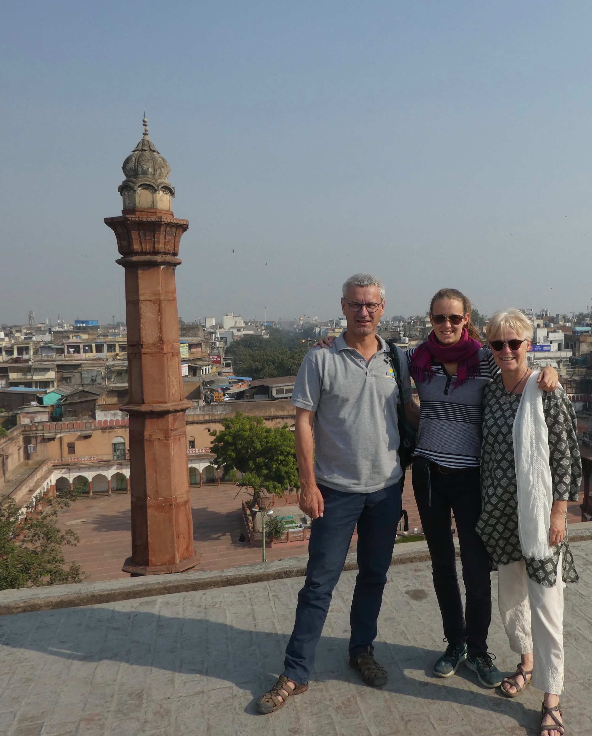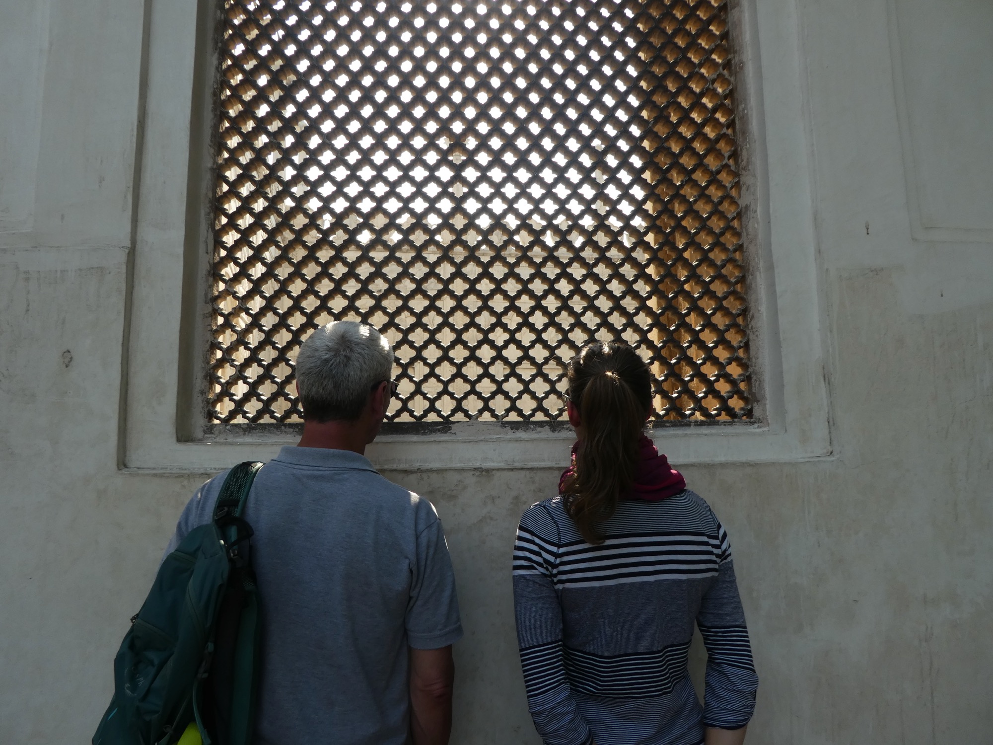 Gemeinsam Delhi zu entdecken macht Spaß! Im Roten Fort bestaunen wir hauptsächlich die indischen Touristen … und die riesige Mauer… Vieles ist vor unseren neugierigen Blicken verborgen – und manches nur auf Zehenspitzen durch Marmor“fenster“ zu erspickeln. Mehr Spaß haben wir dann bei einer Fahrrad-Rikschatour durch Old Delhi – wir schnüffeln uns durch den Gewürzmarkt und unser Fahrer schleust uns durch die Hinterhöfe auf ein Hausdach … das eröffnet uns den Blick in den Innenhof einer Moschee und wir können die Nachbarn bei Drachensteigenlassen beobachten. Das ist hier immer noch üblich und es gibt sogar ein Festival, wo sich die Menschen im Wettbewerb die Drachen abjagen, indem durch gekonnte Flugmanöver gegenseitig die Drachenschnüre gekappt werden.