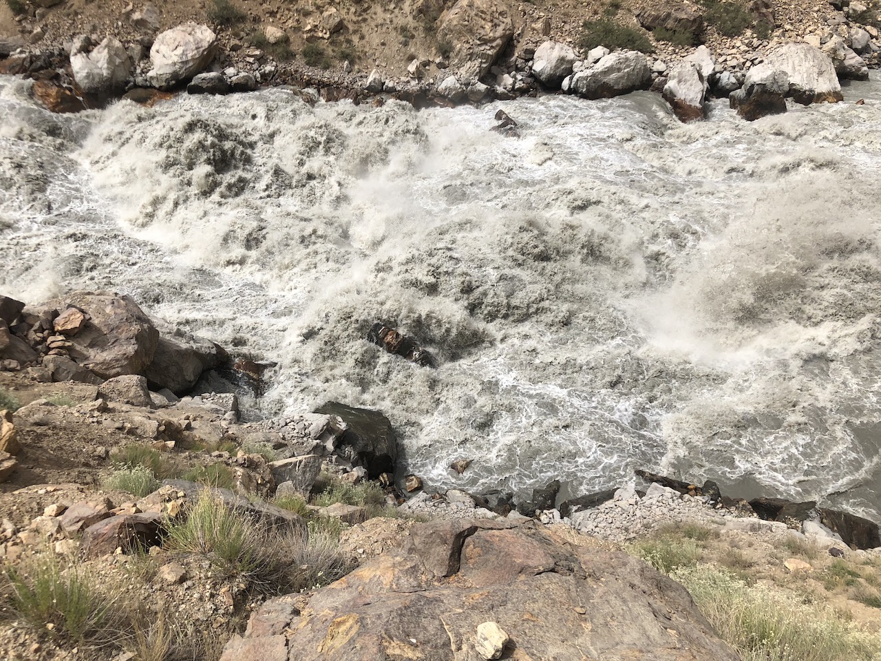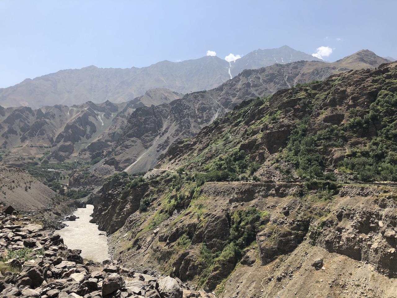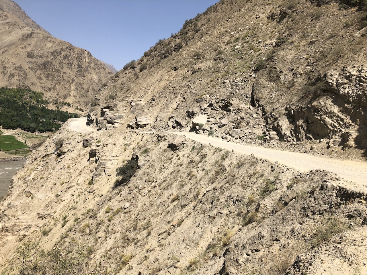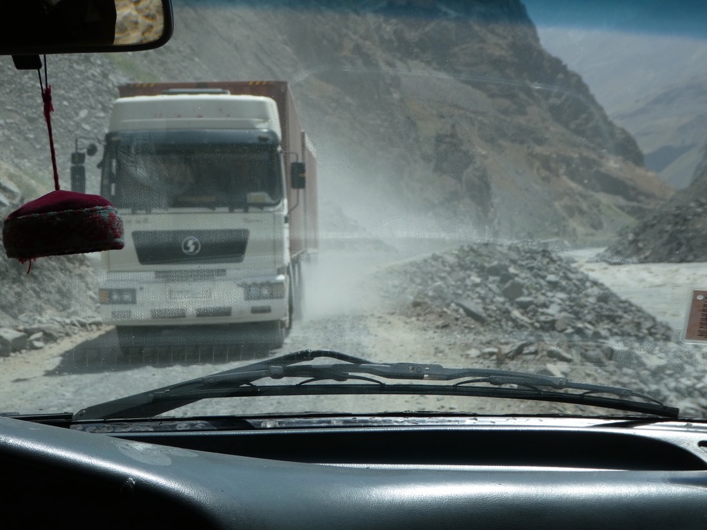Über Tage sind wir Hunderte von Kilometern der afghanischen Grenze entlang gefahren. Der Panj River stellt die Grenze dar und ist oft ein reißender Fluss, tief eingeschnitten zwischen Felswänden. Daneben führt die Straße entlang – zum Glück fahren die Lastwagen vorwiegend nachts!