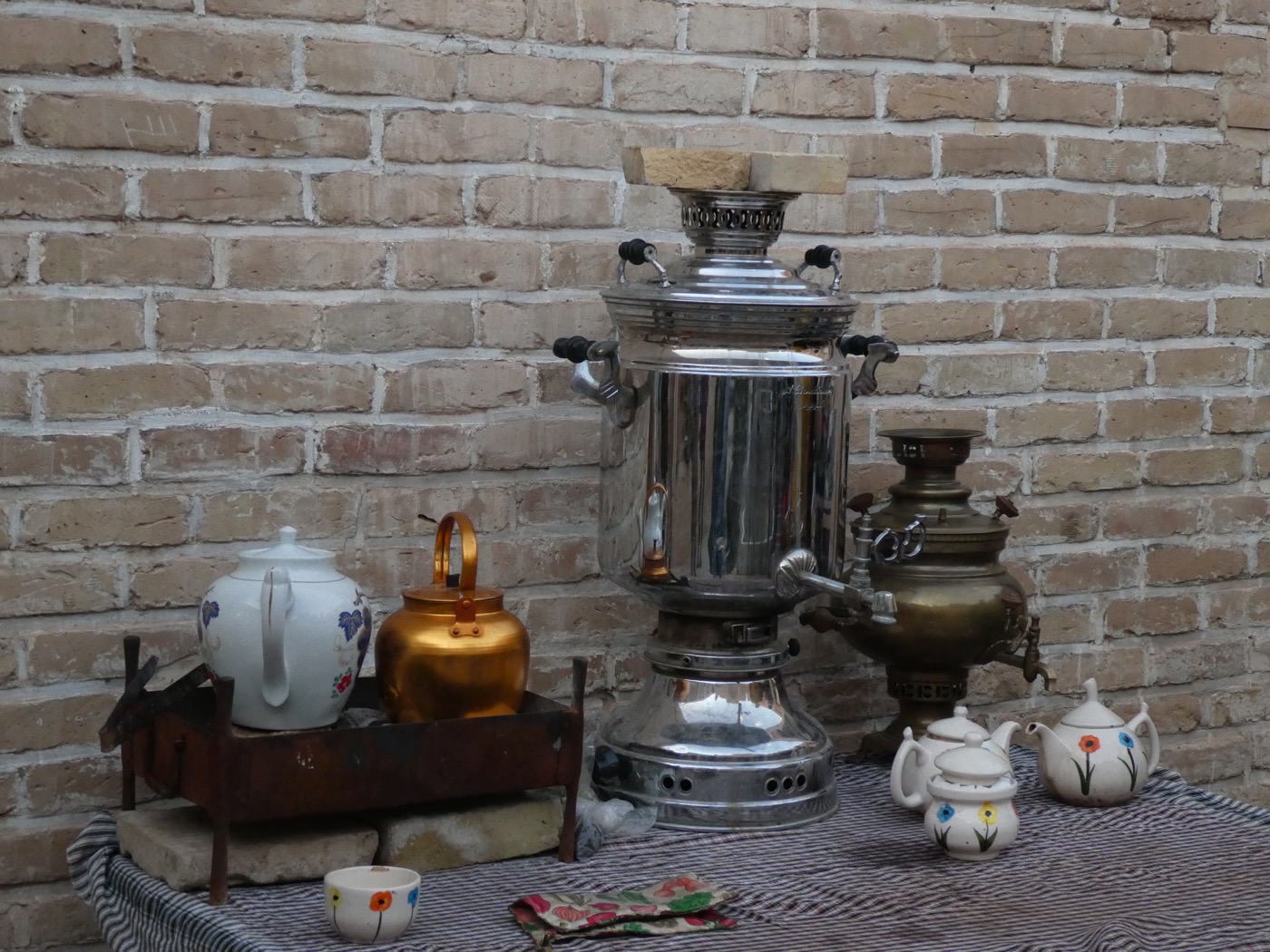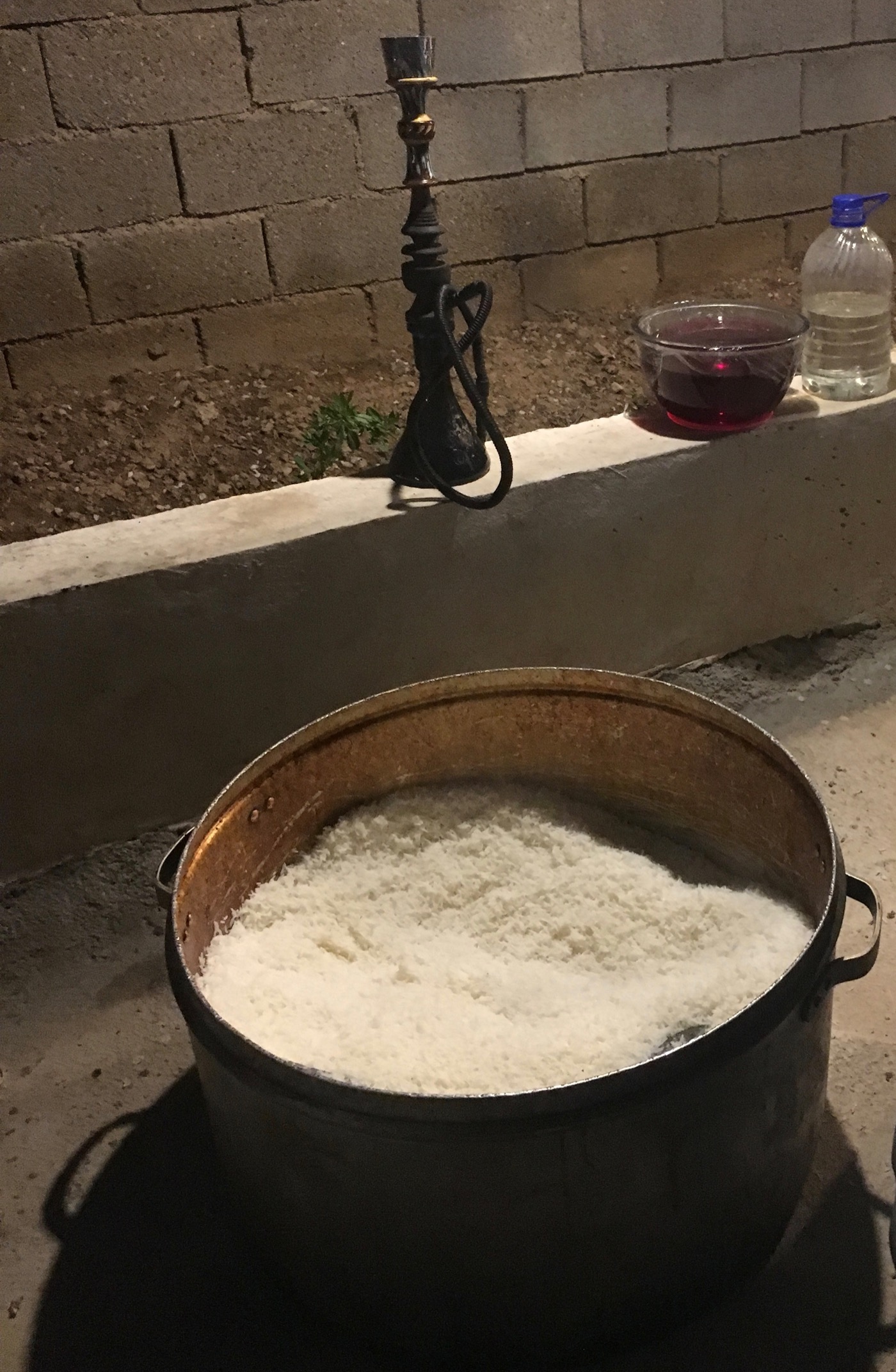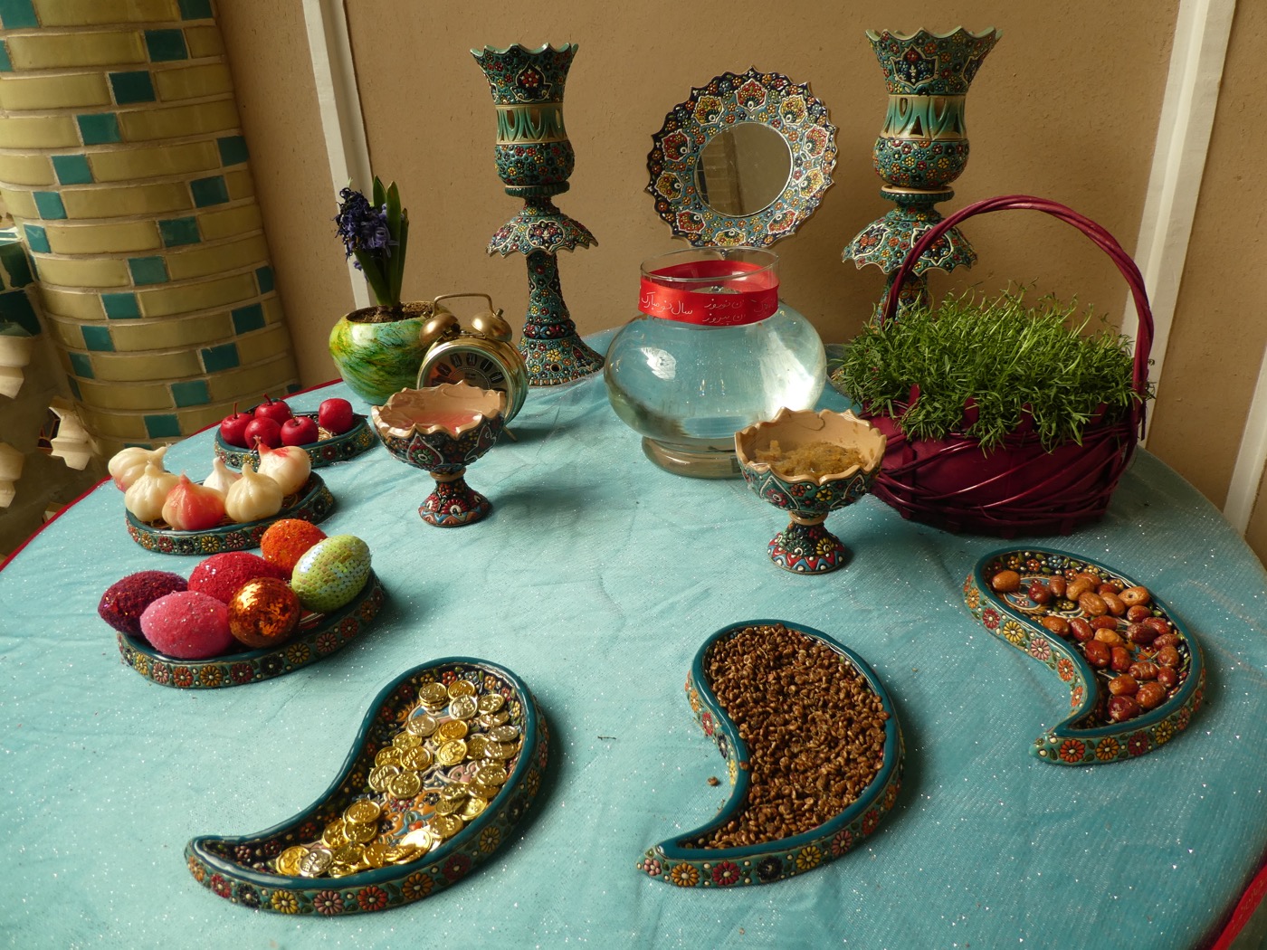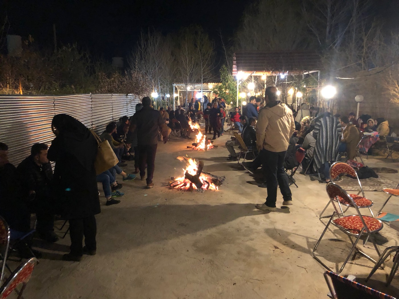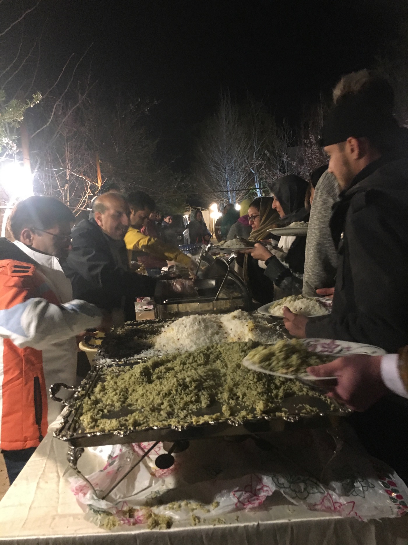 Zuhause wird dann im Wohnzimmer der Haft Sin gedeckt – eine Tradition zu Nowruz, auf die wir in den kommenden Wochen in jedem Haus treffen werden. Auf einem Tisch werden sieben (haft) Gegenstände dekoriert, die in Farsi mit dem Buchstaben „S“ beginnen und im neuen Jahr Glück bringen sollen – Äpfel, Knoblauch, Essig, Geldmünzen, Gras usw … Abends geht es auf zur Gartenparty mit großer Mannschaft – Schwester, Bruder, Mutter, Freunde, Schulkamerad – wir sind bestimmt 20 Leute! Das Gelände liegt außerhalb der Stadt. Hier reihen sich die typischen iranische „Datschas“ aneinander – viel des privaten Lebens der iranischen Mittelklasse findet hinter hohen Mauern statt. Die Gäste sitzen in Gruppen um offene Feuer, eine Band spielt auf und es wird viel getanzt … selbstgebrannter Alkohol steht unter etlichen Tischen. Wir sind dann doch überrascht, wie ausgelassen und fröhlich hier gefeiert wird – derart hatten wir das noch nirgends auf unserer Reise erlebt und das im Iran !!!