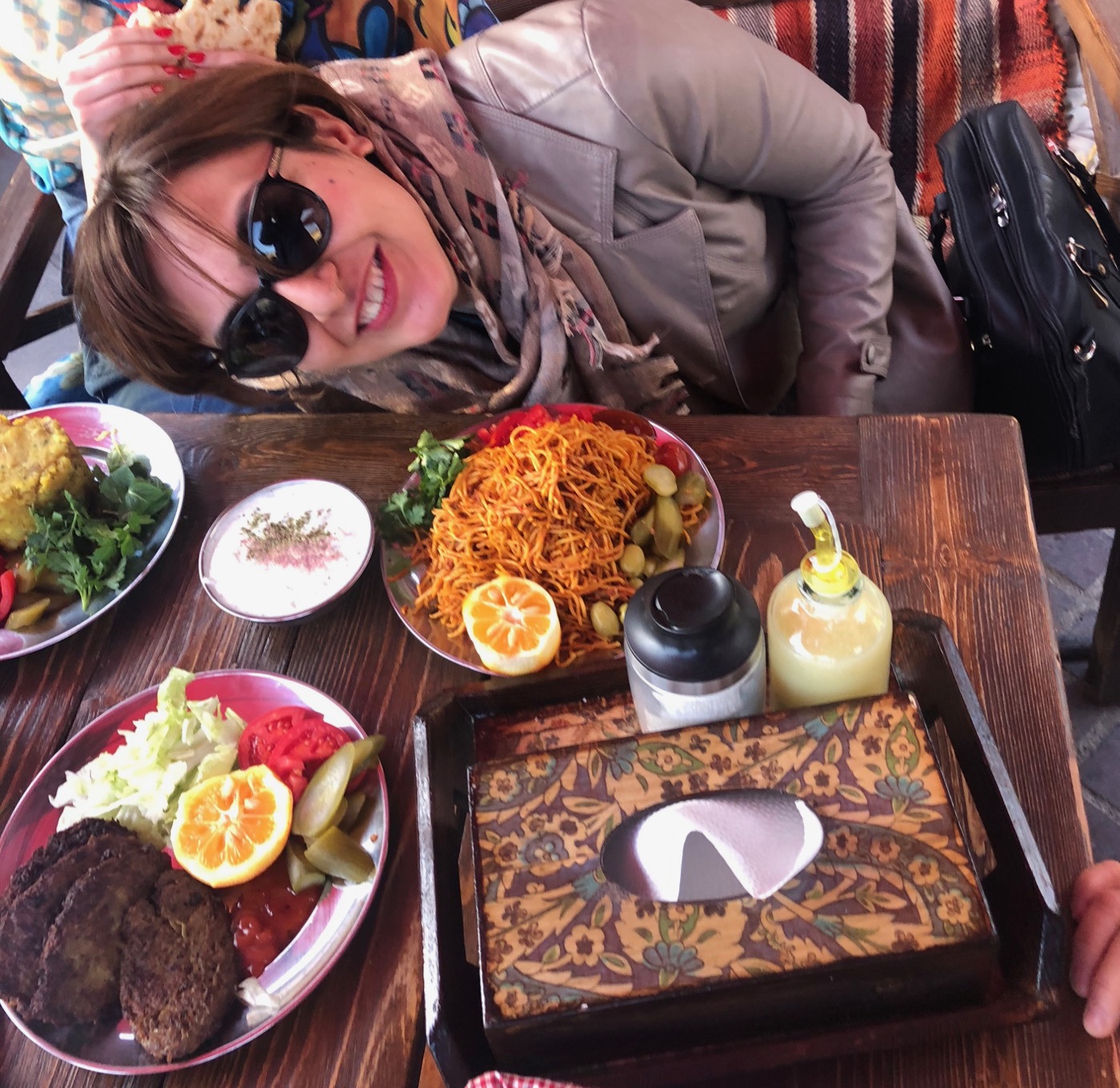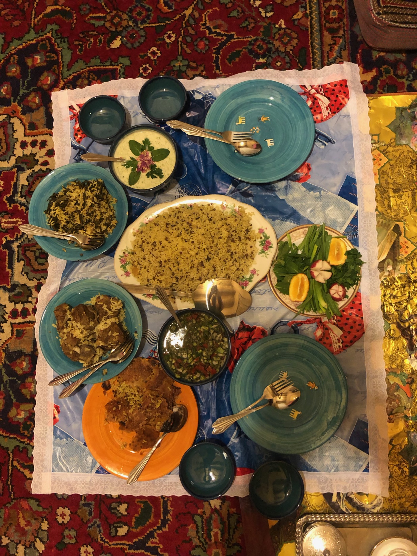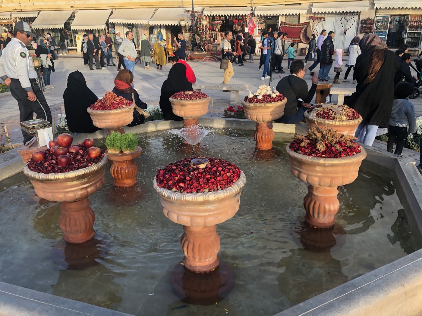 Den kommenden Tag verbringen wir erst einmal mit ein wenig Sightseeing – Aramgah-e Hafez, das Grab des Nationaldichters, Jahan Nama Garden und Qoran Gate stehen auf dem Programm. Zum eigentlichen Nowruz – dem Beginn des neuen Jahres – trifft man sich dann im engsten Familienkreis bei Hoomans Eltern nachts um 1:30 Uhr. Wer diese Uhrzeit vorgibt, ist nicht ganz klar herauszufinden – es ist aber dieses Jahr der Start des neuen Jahres. Alle erscheinen sehr offiziell gekleidet und mit unserem Reiseoutfit sind wir total „underdressed“. Der nächste Tag fühlt sich ein bisschen wie unser Neujahrstag an – wir machen einen Ausflug nach Galhat, ein kleines Bergdörfchen vor den Toren von Shiraz. Dort gibt es diverse Wasserfälle und den Blick hoch in die noch verschneiten Berge und jede Menge Restaurants. Ausflüge macht man hier scheinbar immer zum Essen: Picknick oder Restaurant? – das ist die entscheidende Frage! Wir schaffen es dennoch eine kleine Wanderung zu initiieren und sind froh über ein bisschen Bewegung vor einem „kleinen Mittagssnack“ an den „Shirazer Wasserfällen“ – jaaaa, die Atmosphäre erinnert tatsächlich an Triberg! Zum Abend trifft man sich natürlich wieder im Familienkreis – und: Zum Essen! Wir lernen Sara und Falk, ein iranisch-deutsches Paar aus Stuttgart, kennen und tauschen uns angeregt über unsere jeweiligen Erfahrungen aus.