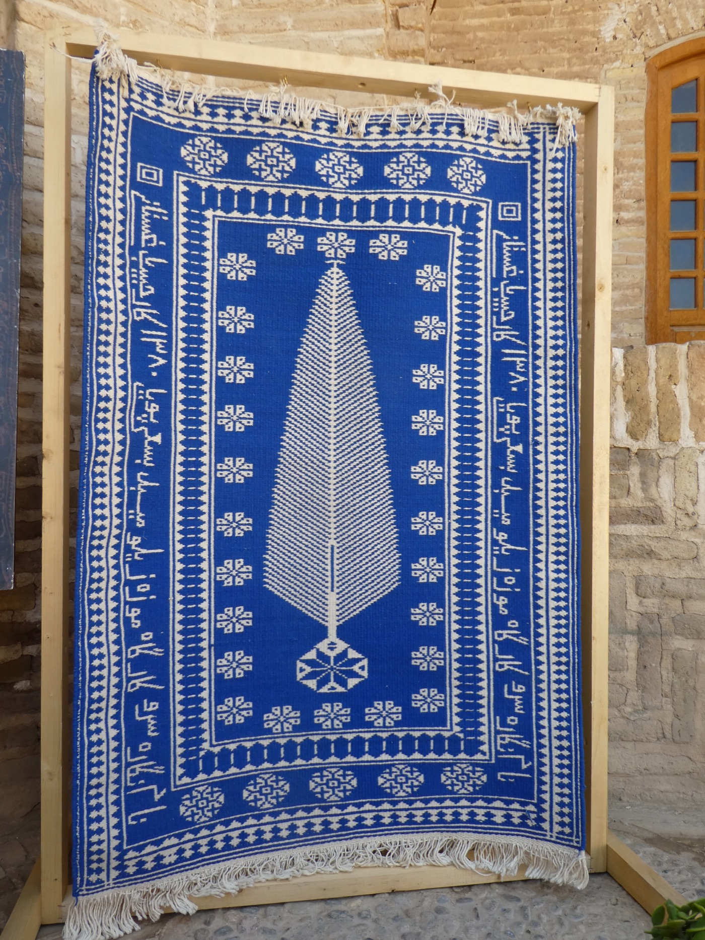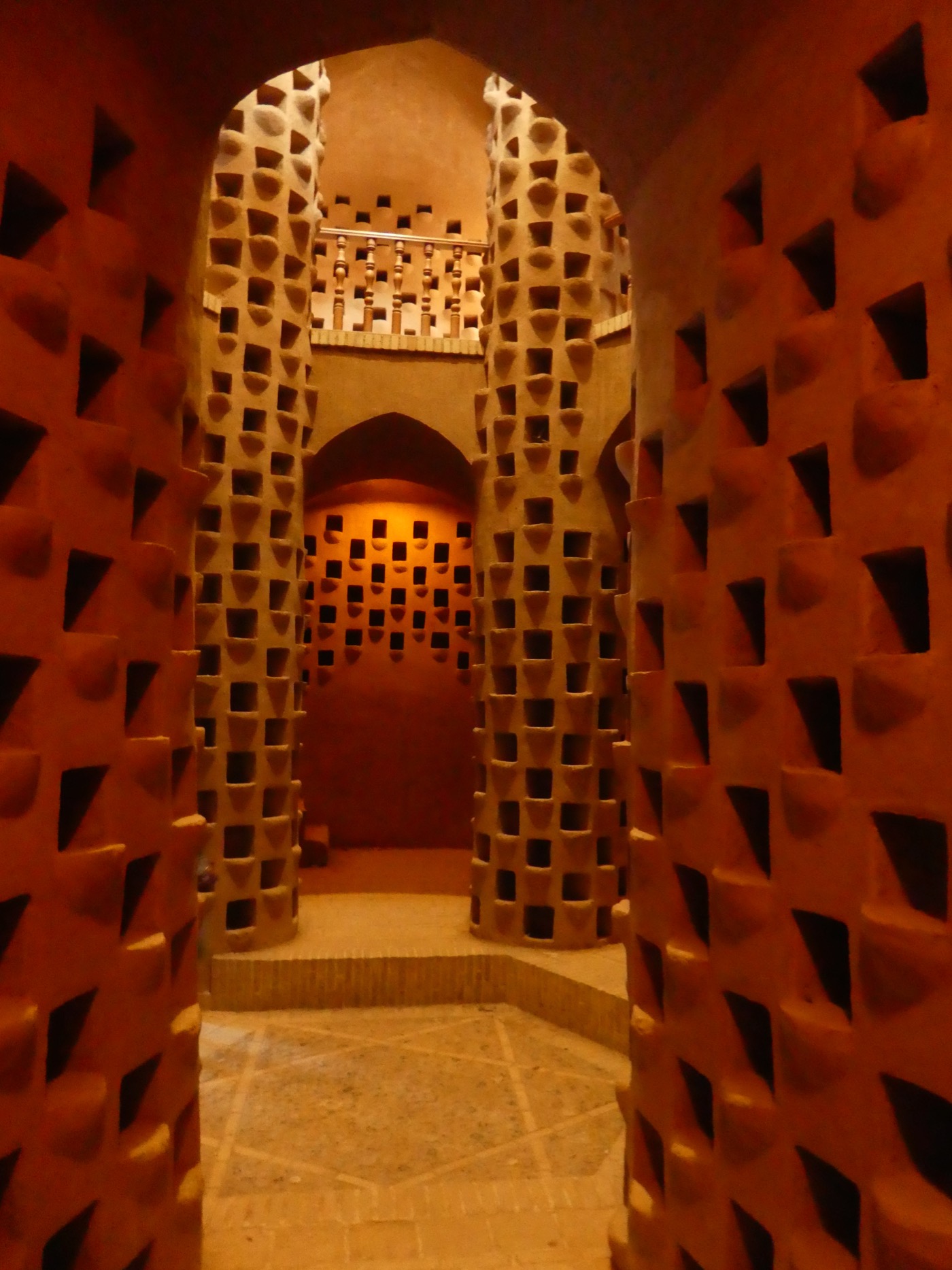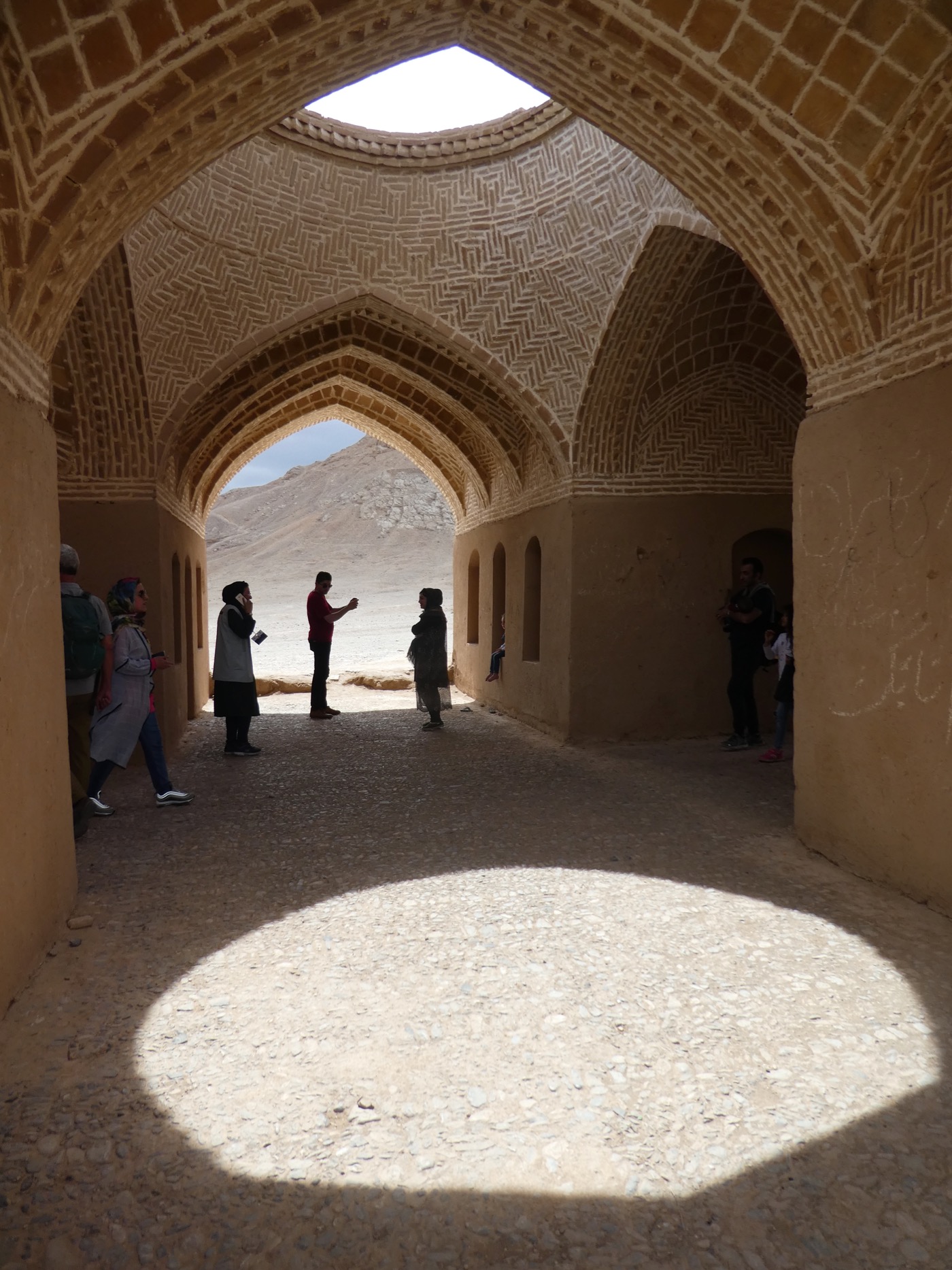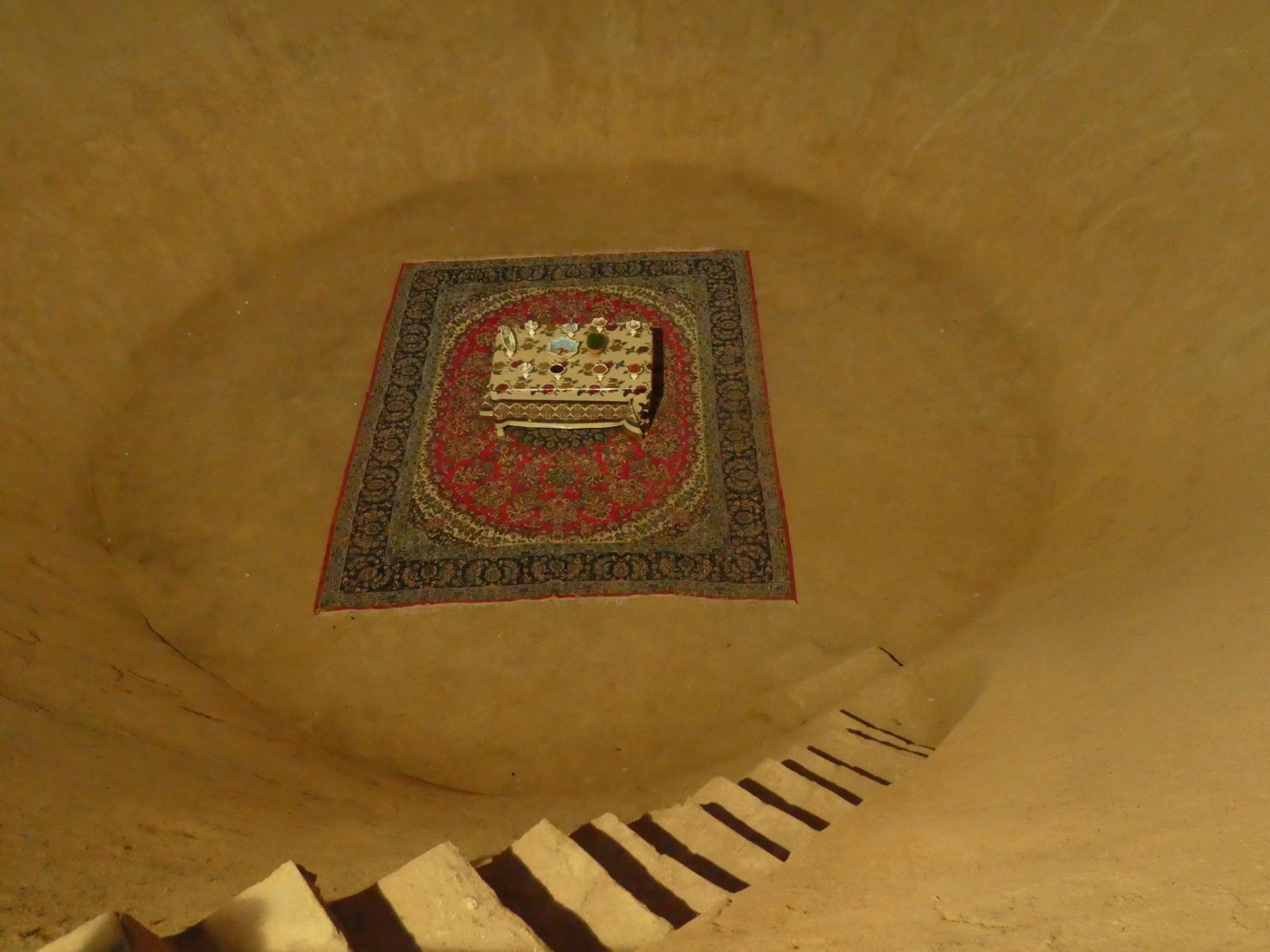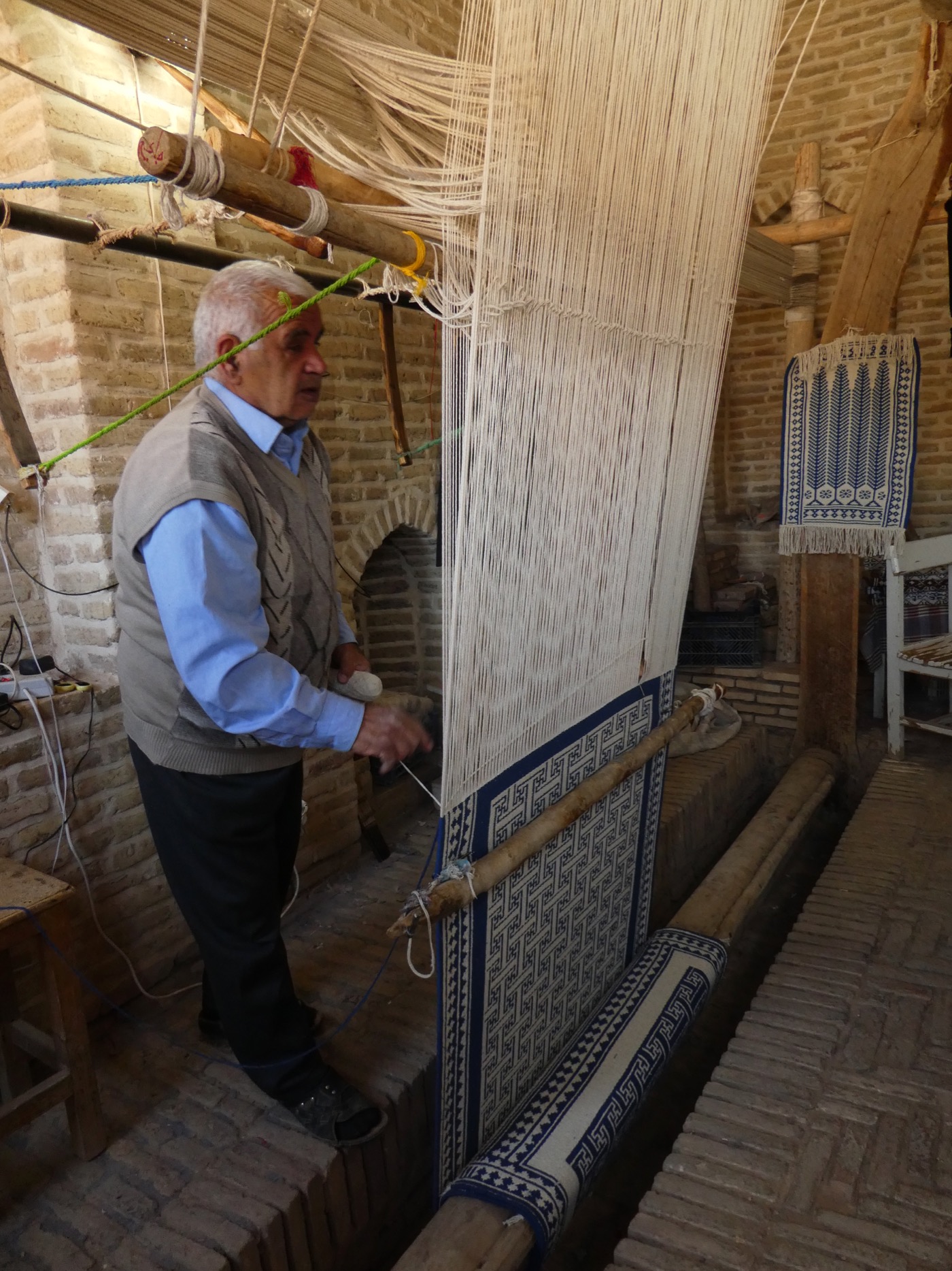 In Meybod beeindruckt uns der Taubenturm, in dem mehrere tausend Tauben zur Düngerproduktion gehalten wurden. Die Eisproduktion in der Wüste ist auch sehr interessant … in Becken wurde im Winter das Regenwasser gesammelt und gefroren. Dann in Blöcke gehauen und im Eisturm gelagert … heute liegt am Boden nur noch ein dekorativer bunter Teppich. Apropos Teppich – auch in Meybod in einer alten Karawanserei gibt es ein Teppichmuseum und wir schauen einer alten Dame beim Weben zu. Die Wendeteppiche aus Baumwolle haben es mir angetan – schade, dass das Fluggepäck so begrenzt ist.