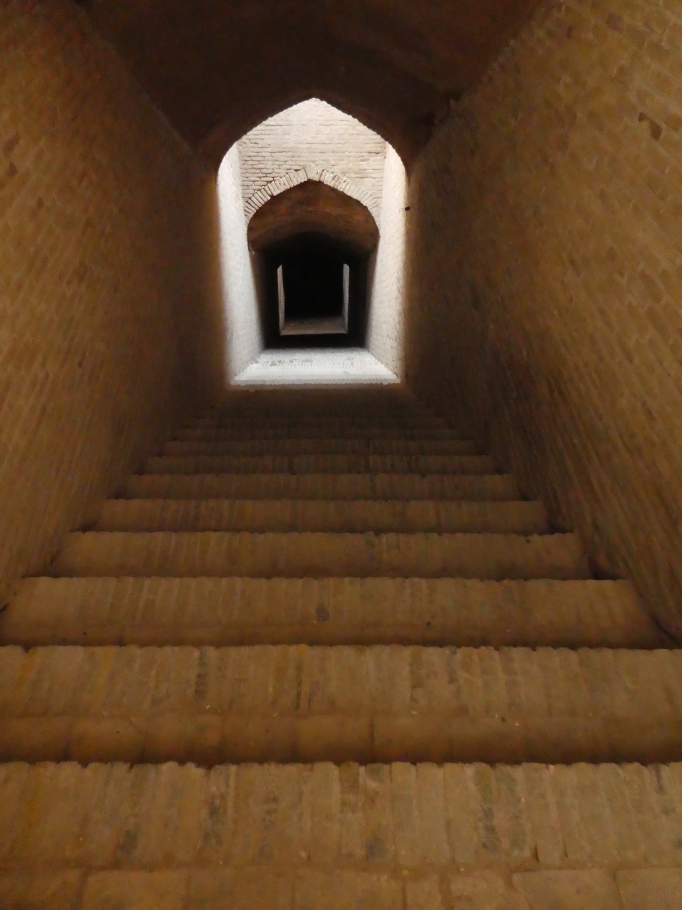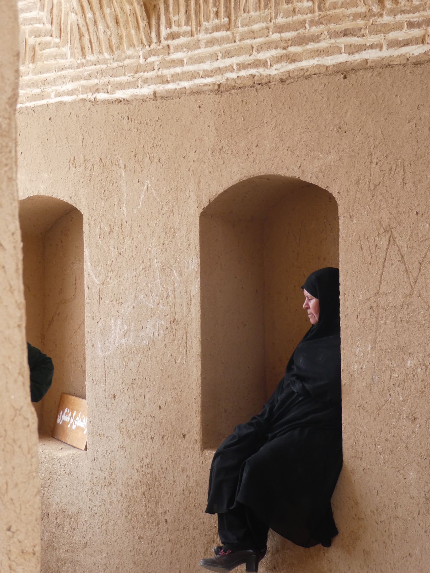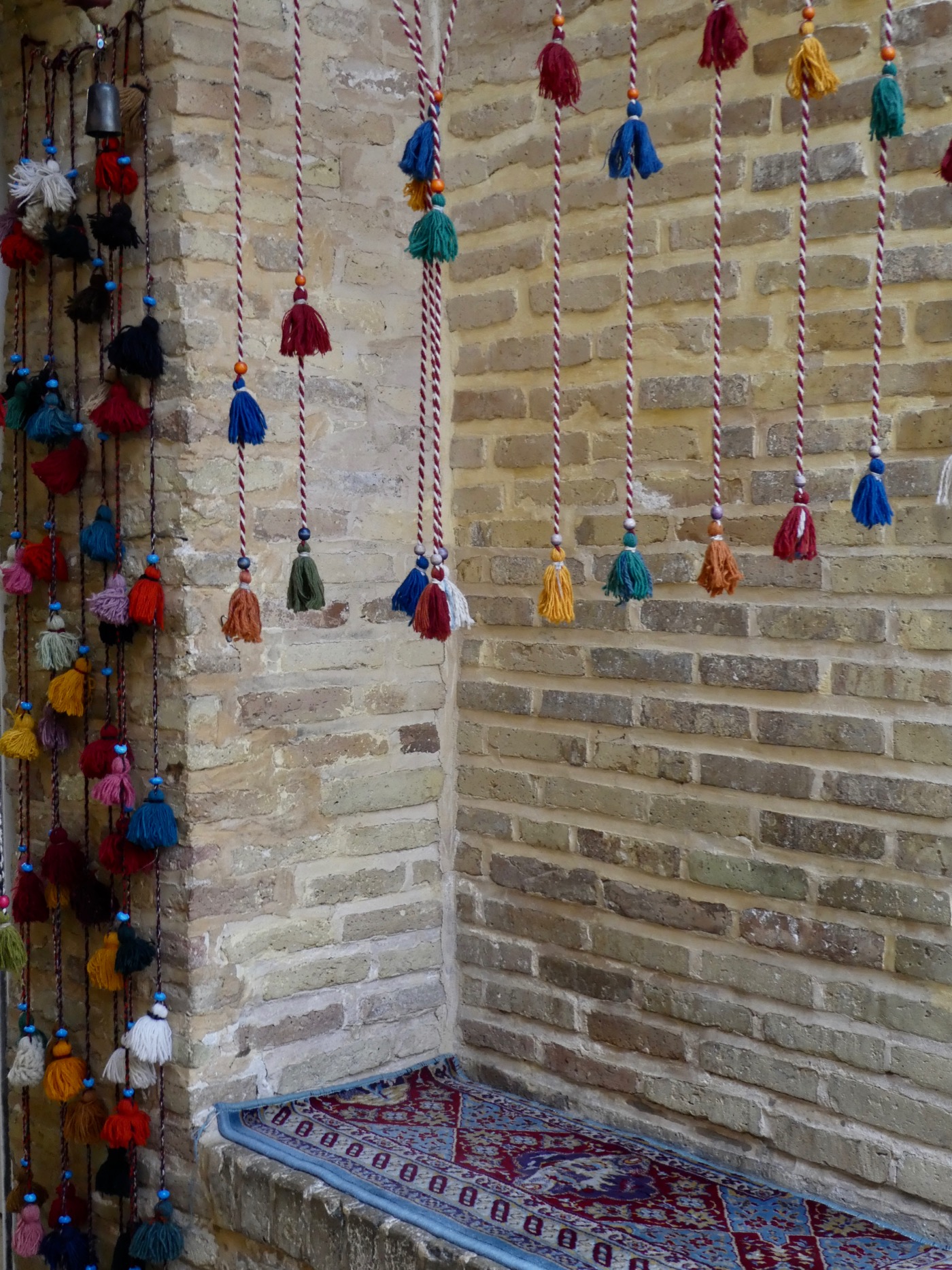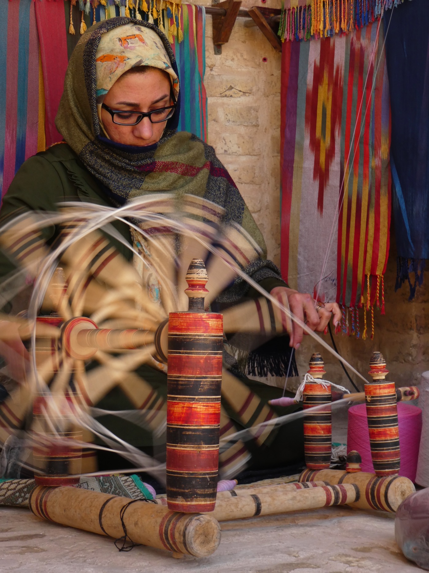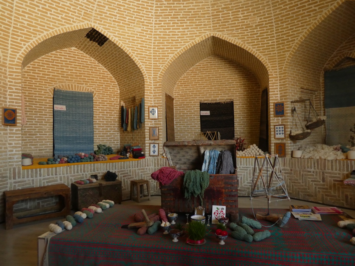 In Meybod beeindruckt uns der Taubenturm, in dem mehrere tausend Tauben zur Düngerproduktion gehalten wurden. Die Eisproduktion in der Wüste ist auch sehr interessant … in Becken wurde im Winter das Regenwasser gesammelt und gefroren. Dann in Blöcke gehauen und im Eisturm gelagert … heute liegt am Boden nur noch ein dekorativer bunter Teppich. Apropos Teppich – auch in Meybod in einer alten Karawanserei gibt es ein Teppichmuseum und wir schauen einer alten Dame beim Weben zu. Die Wendeteppiche aus Baumwolle haben es mir angetan – schade, dass das Fluggepäck so begrenzt ist.
