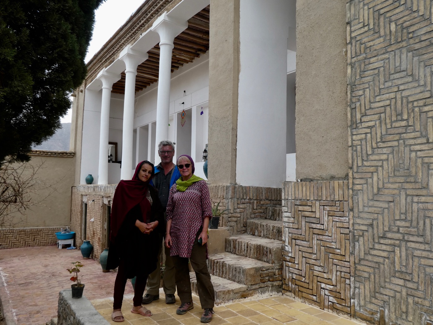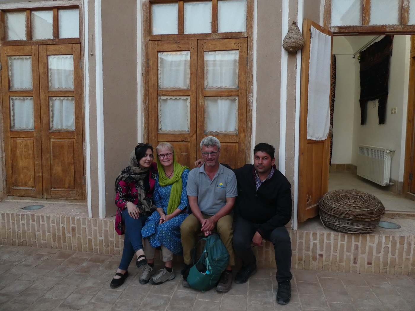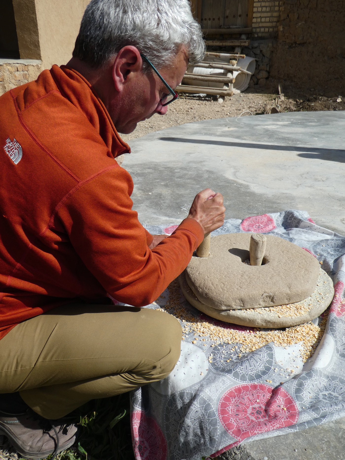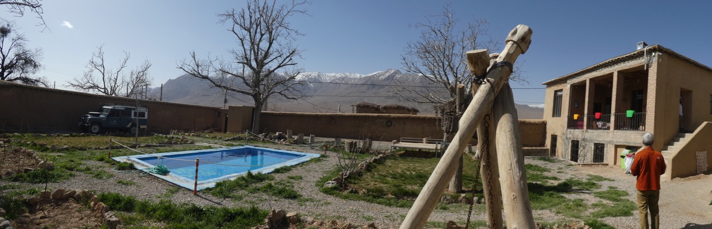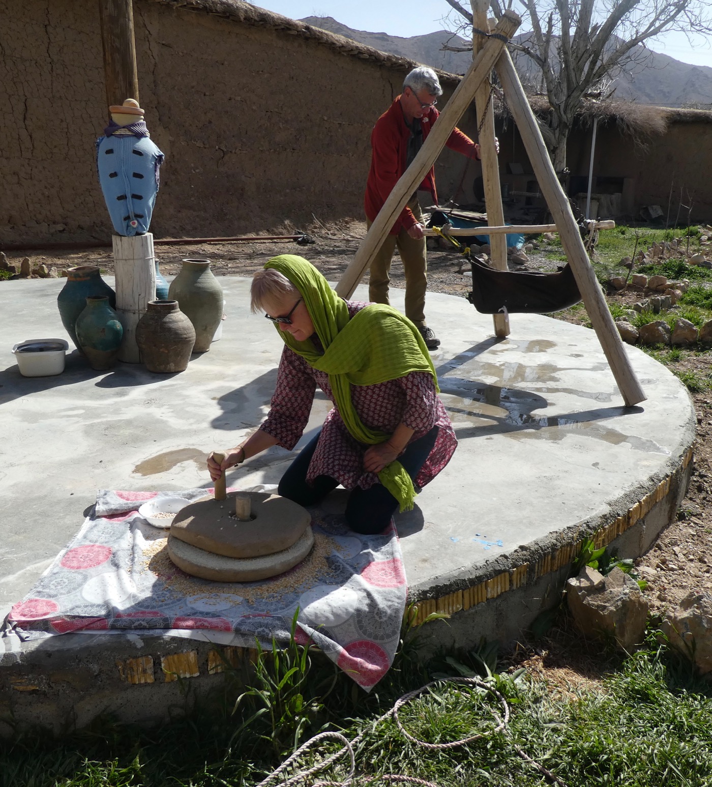 Zum Übernachten organisiert Hooman uns ein Homestay in Jafar Abad Sofia – es liegt in einem Tal zwischen Zagrosgebirge im Süden und der Wüste im Norden. Aufgrund der Sanktionen gegen den Iran sind booking.com, Airbnb etc. hier nicht aktiv und unsere üblichen „Tools“ taugen nichts. Iranische Websites in Farsi sind wenig hilfreich, so sind wir wegen Unterkunft meist auf Hilfe angewiesen. Das Homestay wird von Kamis liebevoll betrieben, er hat Wirtschaft studiert und seine Frau ist Ärztin in Shiraz. Kamis erzählt von seiner Bergsteigervergangenheit und bietet uns für den nächsten Tag an mit uns in den umliegenden Bergen zu wandern – wir bleiben also noch eine weitere Nacht. Am Morgen dürfen wir zunächst noch mit einer alten Steinmühle Getreide malen und im Ziegenlederbeutel Yoghurt schütteln. Schmunzelnd beobachten uns die Hausangestellten … Aber nun wollen wir mit Kamis auf den nächstgelegenen Berg – er sagt, es sei ein 4000er (was ich bezweifle und die Karten geben auch nicht viel her). Auf dem Berg liegt noch deutlich Schnee, also gut – wer wird da zweifelnd schauen! Nach zwei Stunden Anstieg zeigt sich allerdings (vöööööllig unerwartet), dass das Unternehmen zumindest ohne Steigeisen und Pickel nicht zu machen ist und zudem Kamis Kondition auch nicht mehr zum Besten steht. Innerlich kopfschüttelnd ermöglichen wir Kamis einen möglichst gesichtswahrenden Rückzug … zu Tee&Kebab. Die anschließende (Auto-) Tour durch die Dörfer ist auch ganz schön – viel Landschaft, ein zerfallenes Lehmdorf und ein weiteres nett renoviertes Guesthouse. Diese Projekte von meist jungen Paaren sind der neuste Trend und auch die Teheraner genießen die gemütlichen traditionellen Unterkünfte – nur zu finden sind sie noch schwer. Wir tragen unseren Teil zum Marketing bei und setzen eifrig Markierungen auf Maps.me und iOverlander. Ein abwechslungsreicher Tag – allerdings kann Kamis am nächsten Tag kaum laufen wegen seinem Muskelkater …