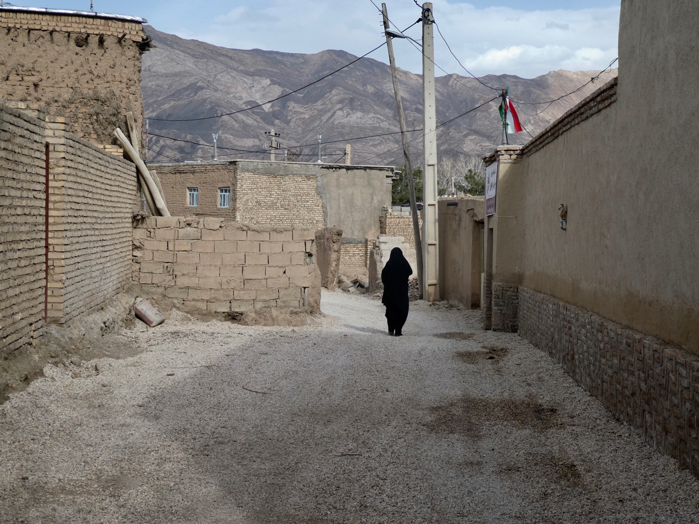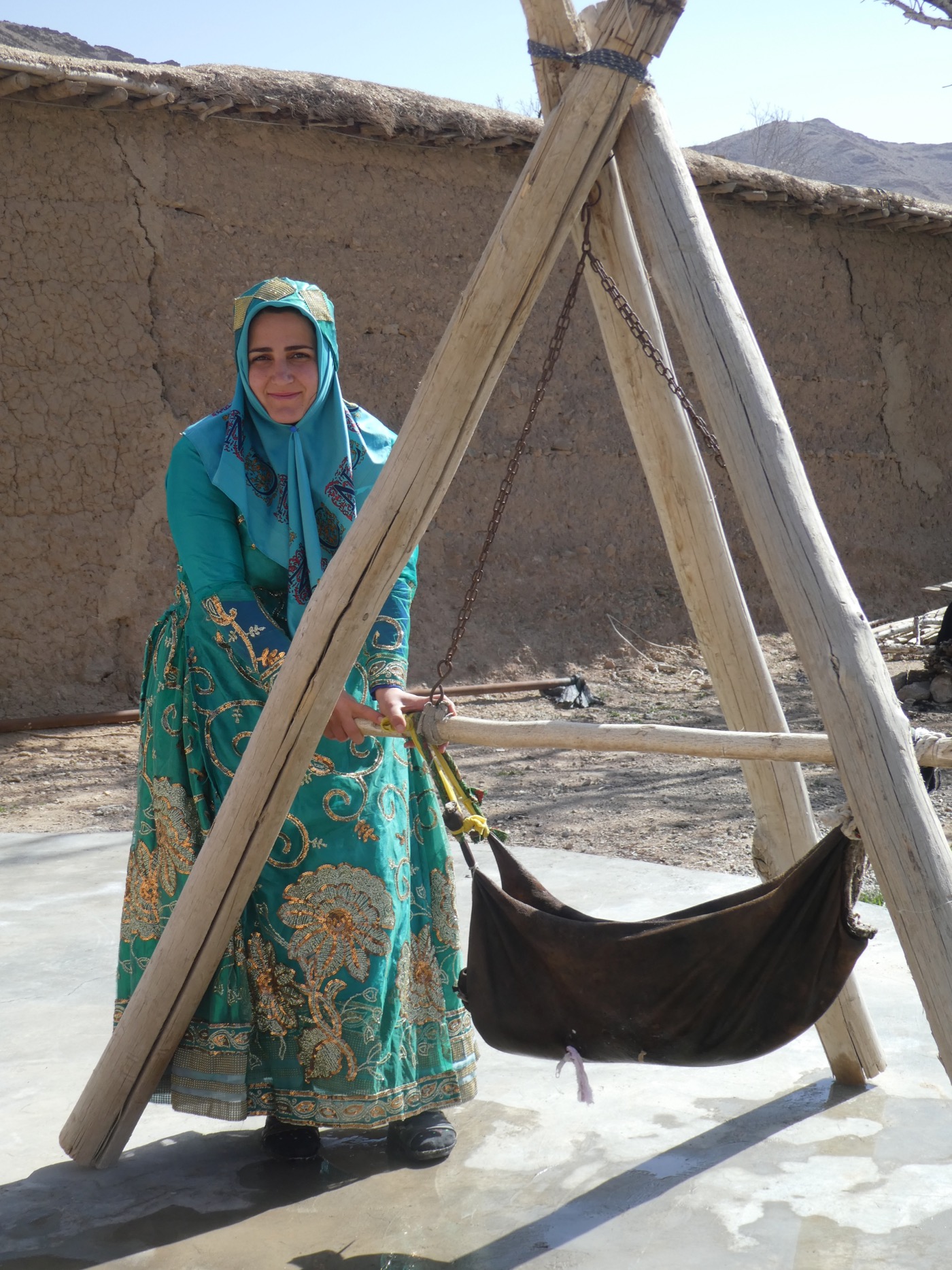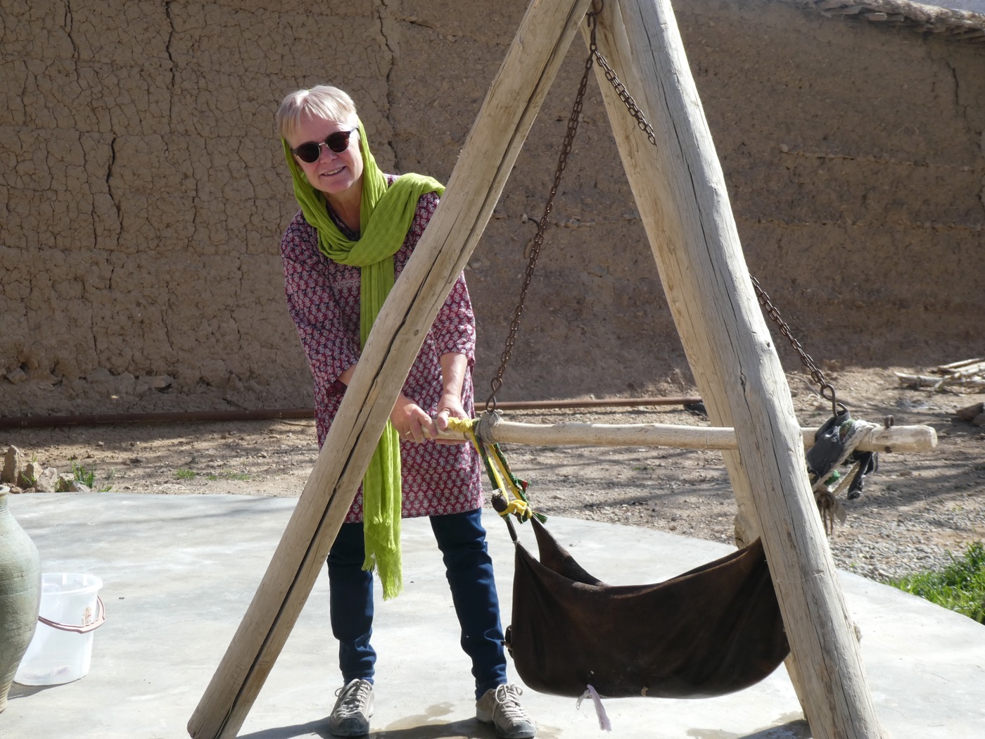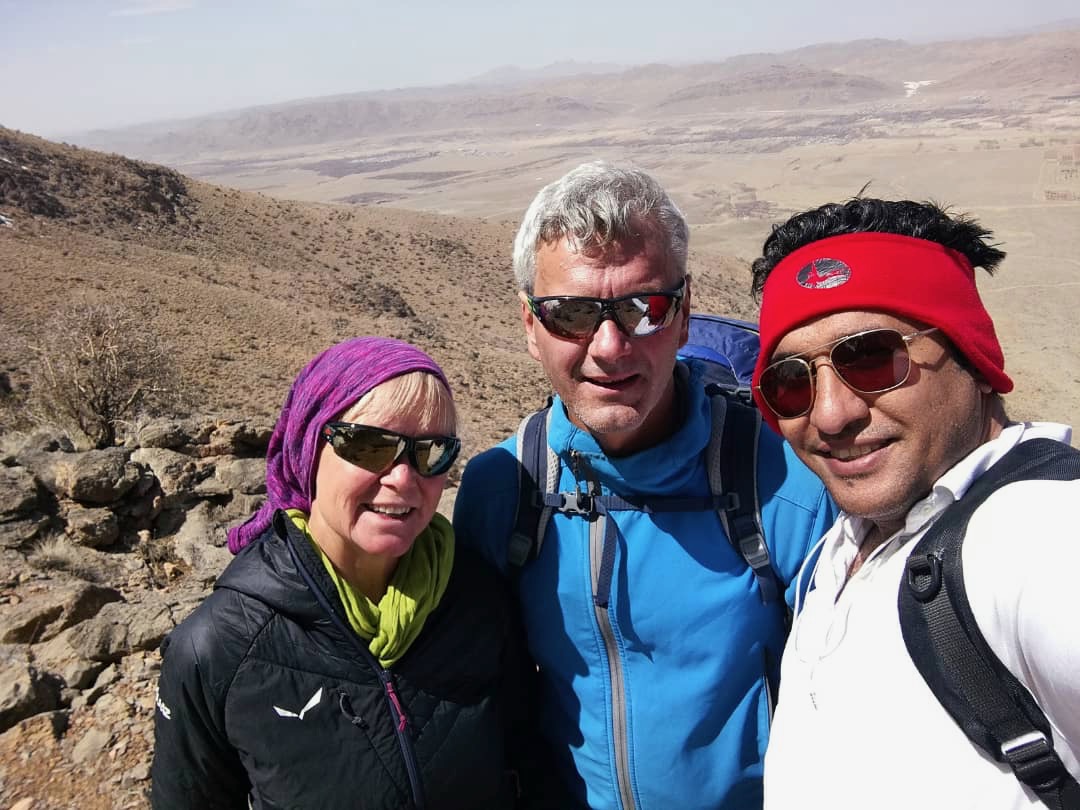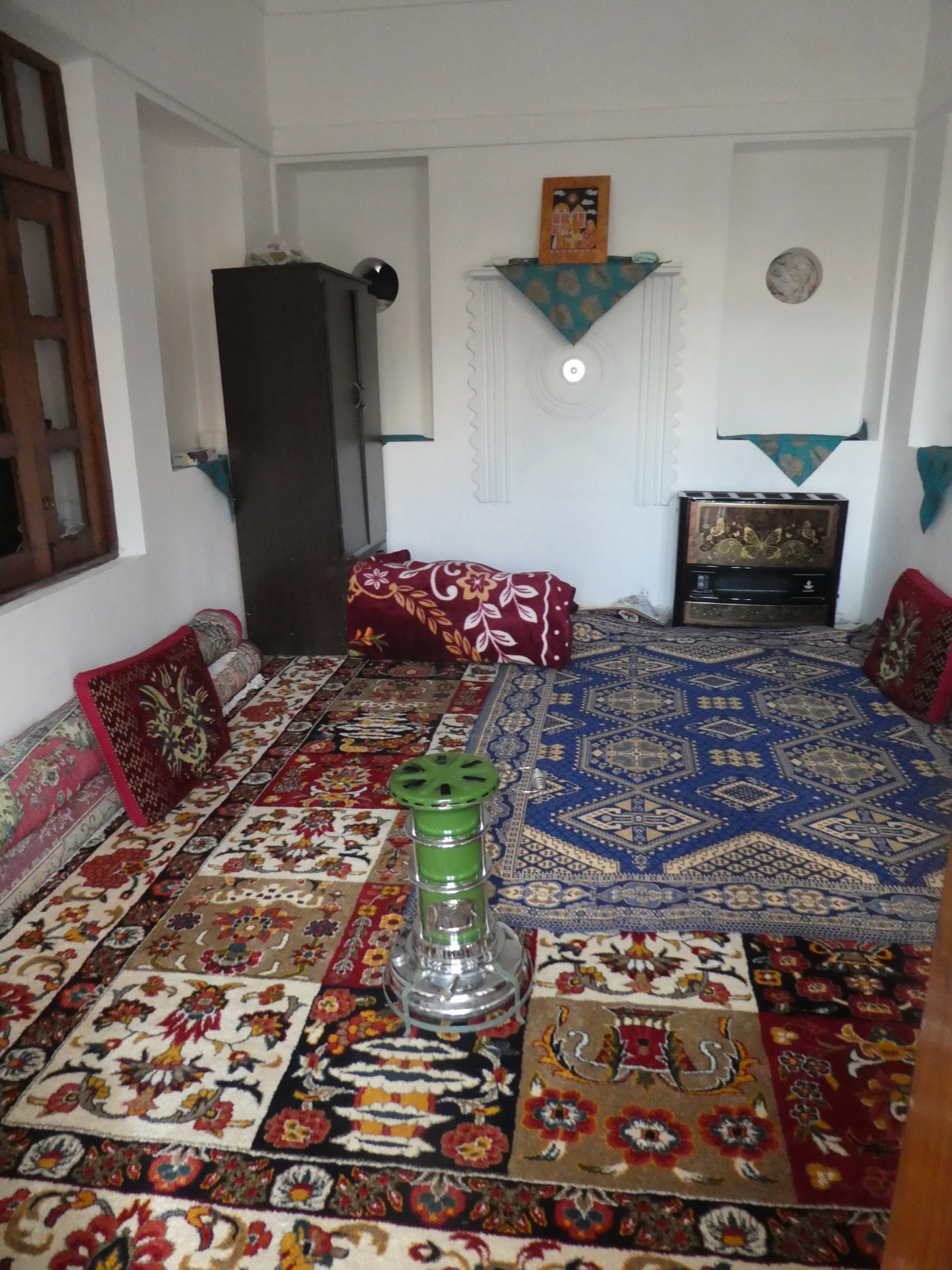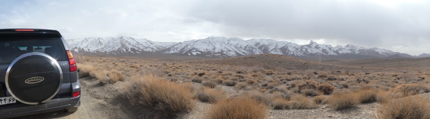 Zum Übernachten organisiert Hooman uns ein Homestay in Jafar Abad Sofia – es liegt in einem Tal zwischen Zagrosgebirge im Süden und der Wüste im Norden. Aufgrund der Sanktionen gegen den Iran sind booking.com, Airbnb etc. hier nicht aktiv und unsere üblichen „Tools“ taugen nichts. Iranische Websites in Farsi sind wenig hilfreich, so sind wir wegen Unterkunft meist auf Hilfe angewiesen. Das Homestay wird von Kamis liebevoll betrieben, er hat Wirtschaft studiert und seine Frau ist Ärztin in Shiraz. Kamis erzählt von seiner Bergsteigervergangenheit und bietet uns für den nächsten Tag an mit uns in den umliegenden Bergen zu wandern – wir bleiben also noch eine weitere Nacht. Am Morgen dürfen wir zunächst noch mit einer alten Steinmühle Getreide malen und im Ziegenlederbeutel Yoghurt schütteln. Schmunzelnd beobachten uns die Hausangestellten … Aber nun wollen wir mit Kamis auf den nächstgelegenen Berg – er sagt, es sei ein 4000er (was ich bezweifle und die Karten geben auch nicht viel her). Auf dem Berg liegt noch deutlich Schnee, also gut – wer wird da zweifelnd schauen! Nach zwei Stunden Anstieg zeigt sich allerdings (vöööööllig unerwartet), dass das Unternehmen zumindest ohne Steigeisen und Pickel nicht zu machen ist und zudem Kamis Kondition auch nicht mehr zum Besten steht. Innerlich kopfschüttelnd ermöglichen wir Kamis einen möglichst gesichtswahrenden Rückzug … zu Tee&Kebab. Die anschließende (Auto-) Tour durch die Dörfer ist auch ganz schön – viel Landschaft, ein zerfallenes Lehmdorf und ein weiteres nett renoviertes Guesthouse. Diese Projekte von meist jungen Paaren sind der neuste Trend und auch die Teheraner genießen die gemütlichen traditionellen Unterkünfte – nur zu finden sind sie noch schwer. Wir tragen unseren Teil zum Marketing bei und setzen eifrig Markierungen auf Maps.me und iOverlander. Ein abwechslungsreicher Tag – allerdings kann Kamis am nächsten Tag kaum laufen wegen seinem Muskelkater …
