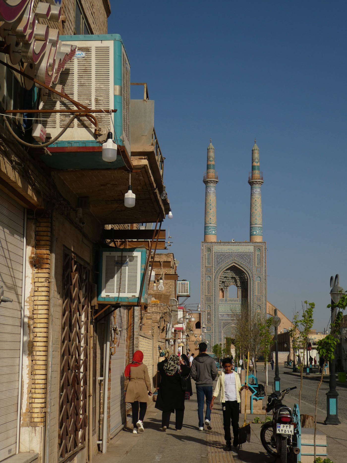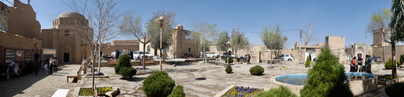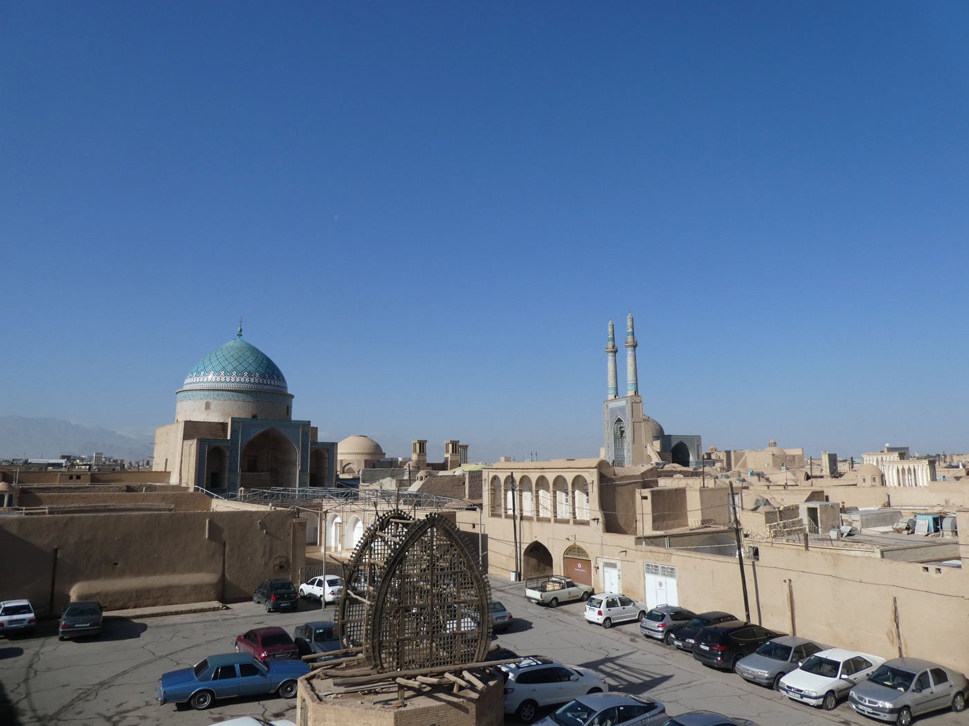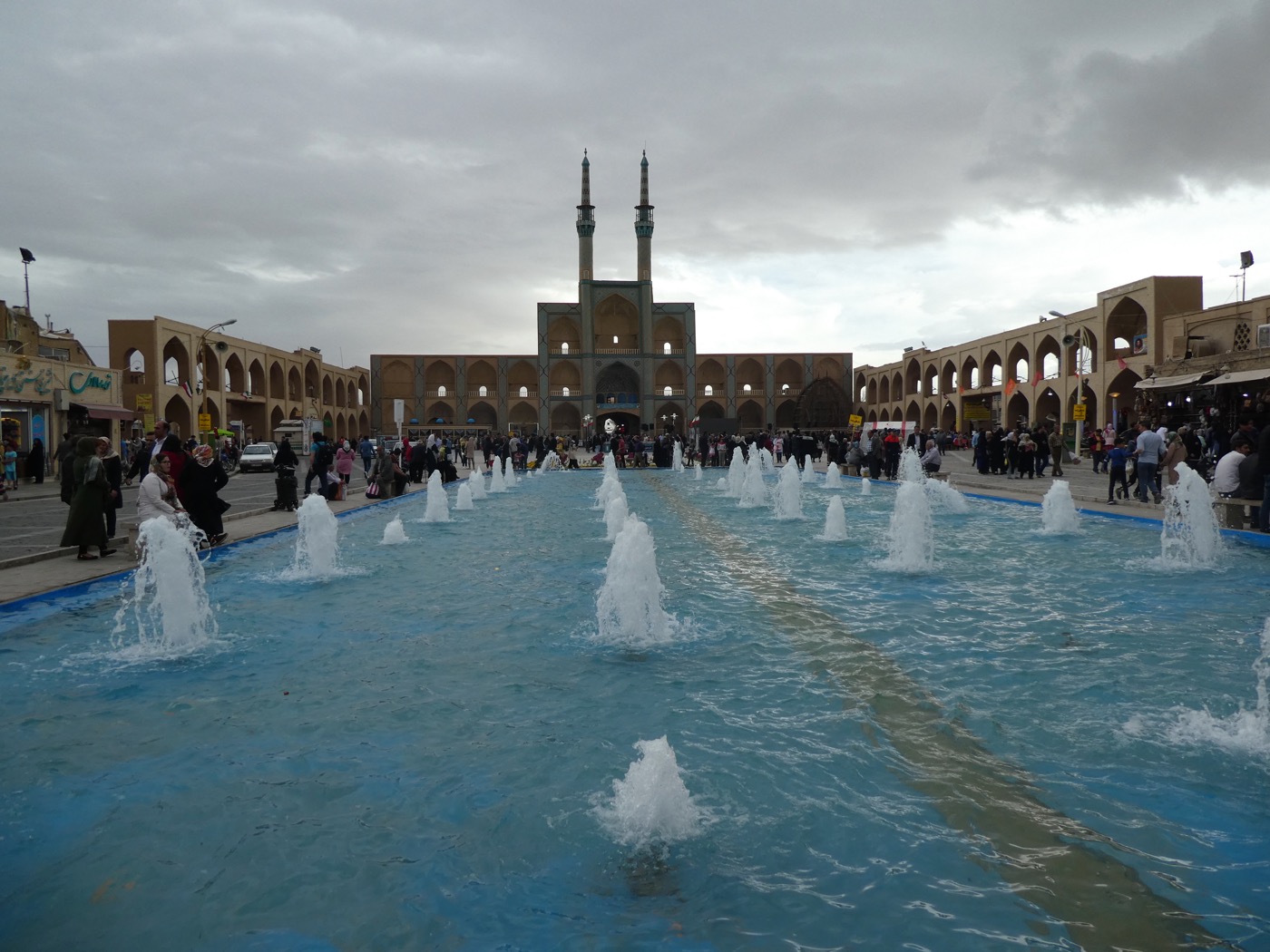 Für uns geht es weiter nach Yazd. Die Stadt gefällt uns auf Anhieb total gut – der große alte Ortskern mit unzähligen Lehmbauten, nette Cafés und Ferienstimmung überall. Nur das Wetter will nicht so richtig, es ist regnerisch – wirklich schade für die vielen Fotomotive. Die Jame Moschee ist dennoch beeindruckend – nett auch die Atmosphäre: Auf den Teppichen sitzen viele Großfamilien und genießen plaudernd einen Tee. Picknickatmophäre im Gebetsraum!