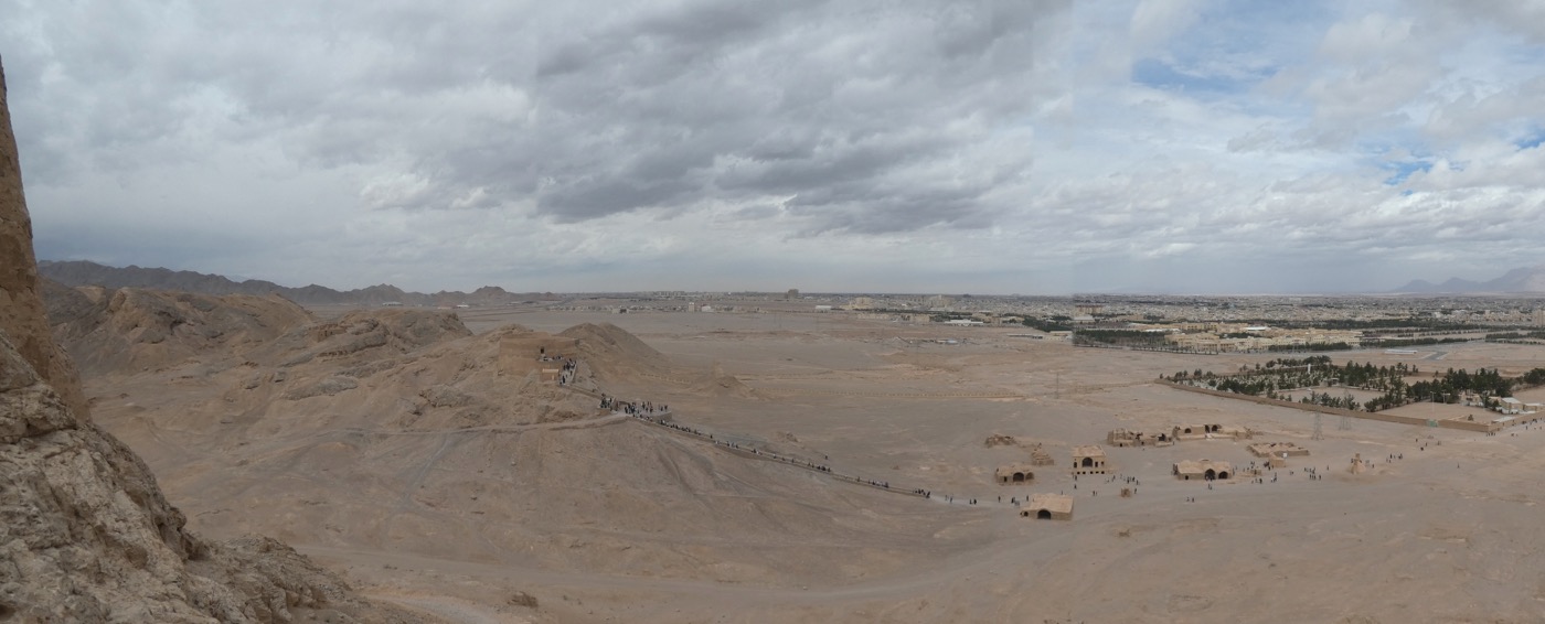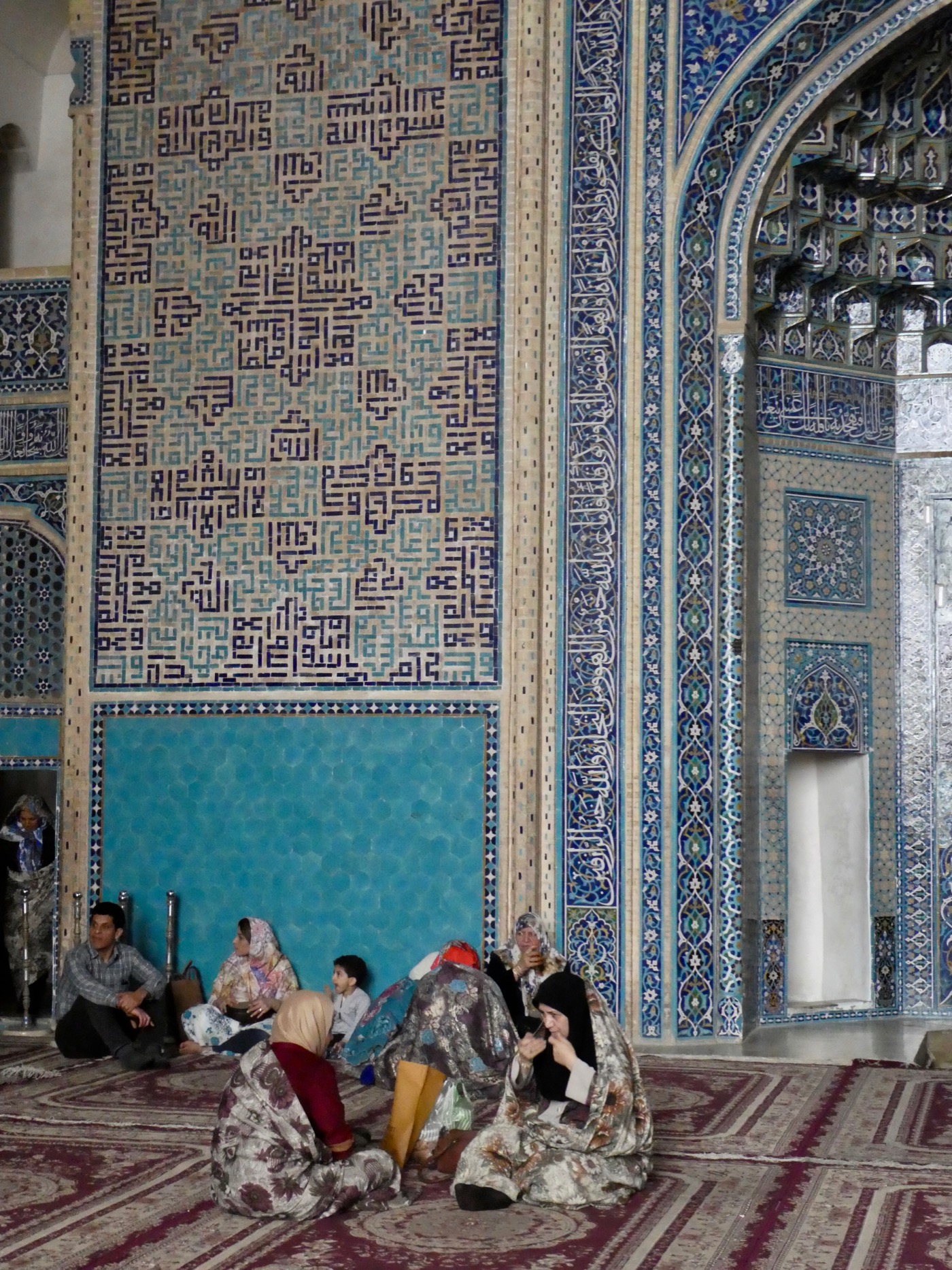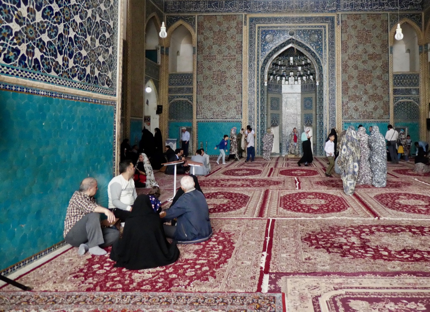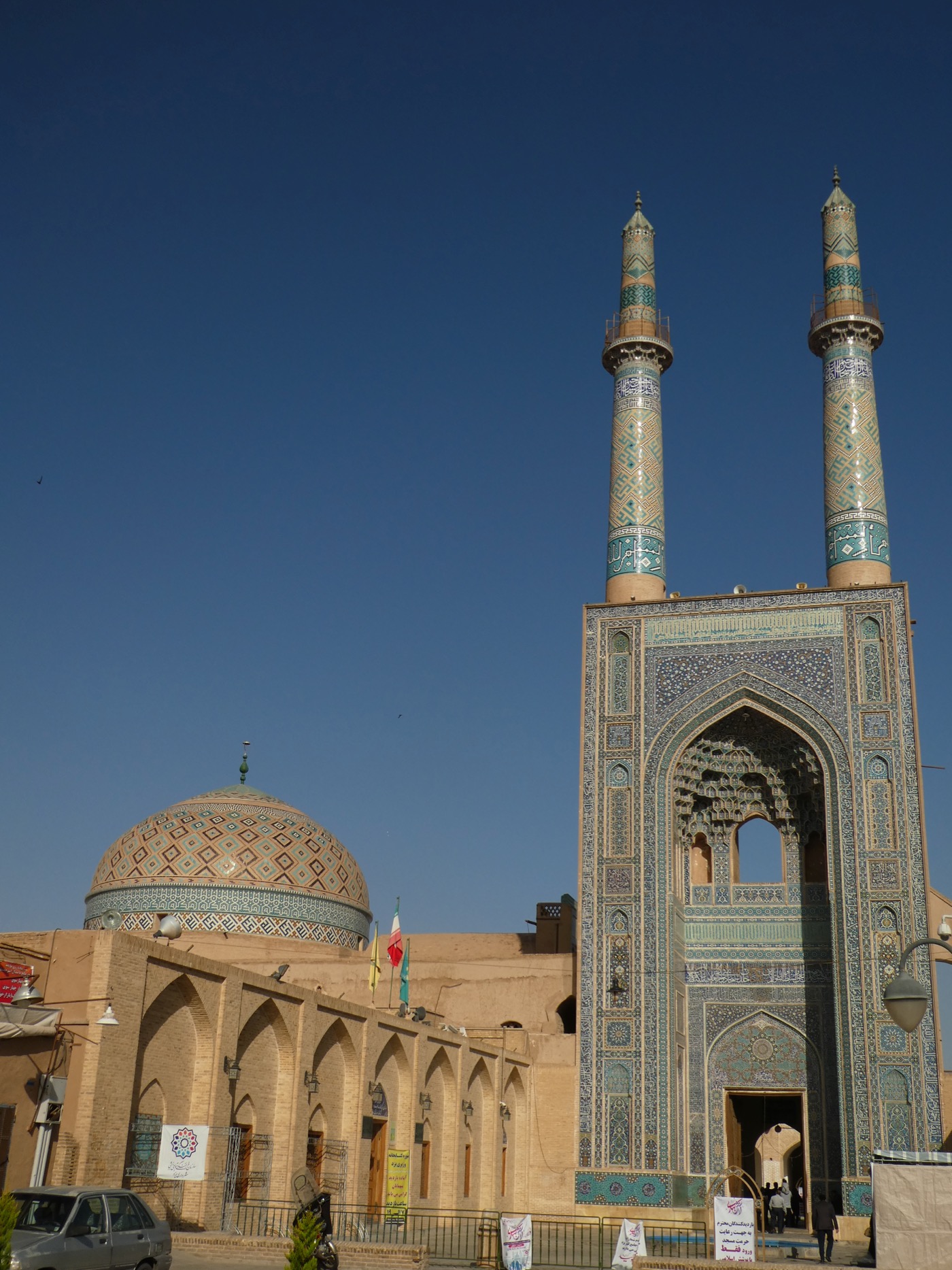 Für uns geht es weiter nach Yazd. Die Stadt gefällt uns auf Anhieb total gut – der große alte Ortskern mit unzähligen Lehmbauten, nette Cafés und Ferienstimmung überall. Nur das Wetter will nicht so richtig, es ist regnerisch – wirklich schade für die vielen Fotomotive. Die Jame Moschee ist dennoch beeindruckend – nett auch die Atmosphäre: Auf den Teppichen sitzen viele Großfamilien und genießen plaudernd einen Tee. Picknickatmophäre im Gebetsraum!