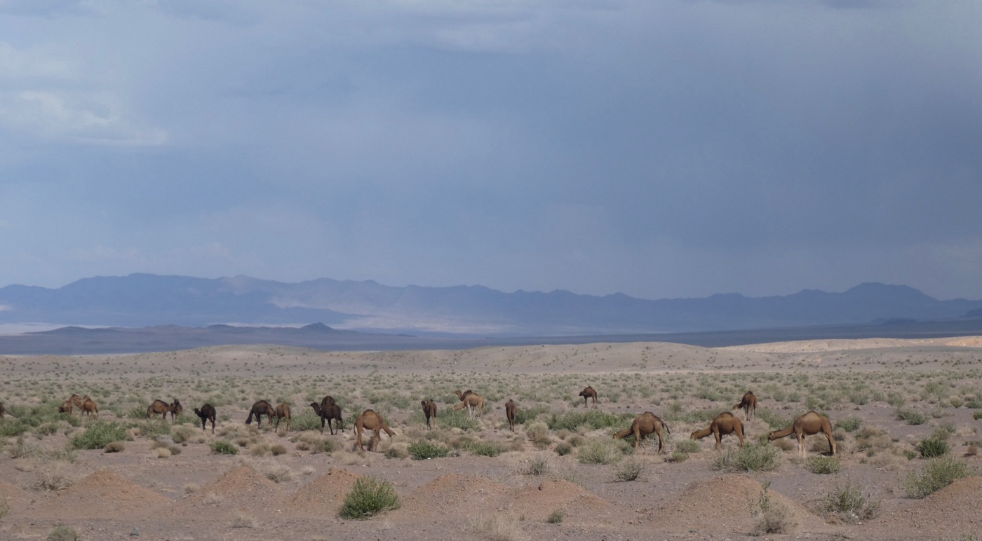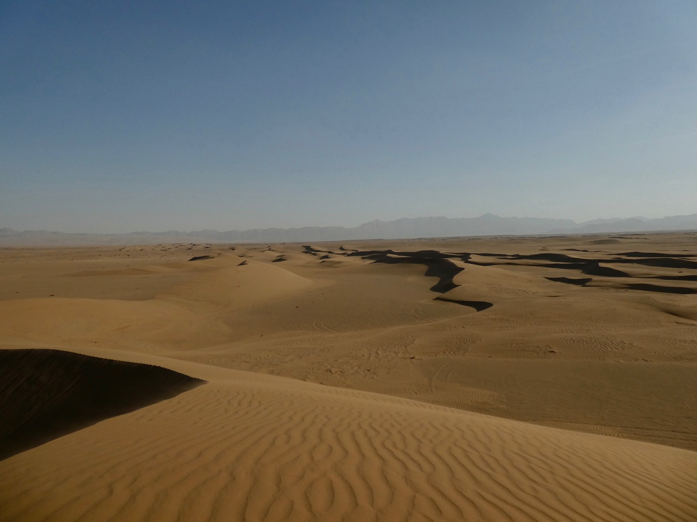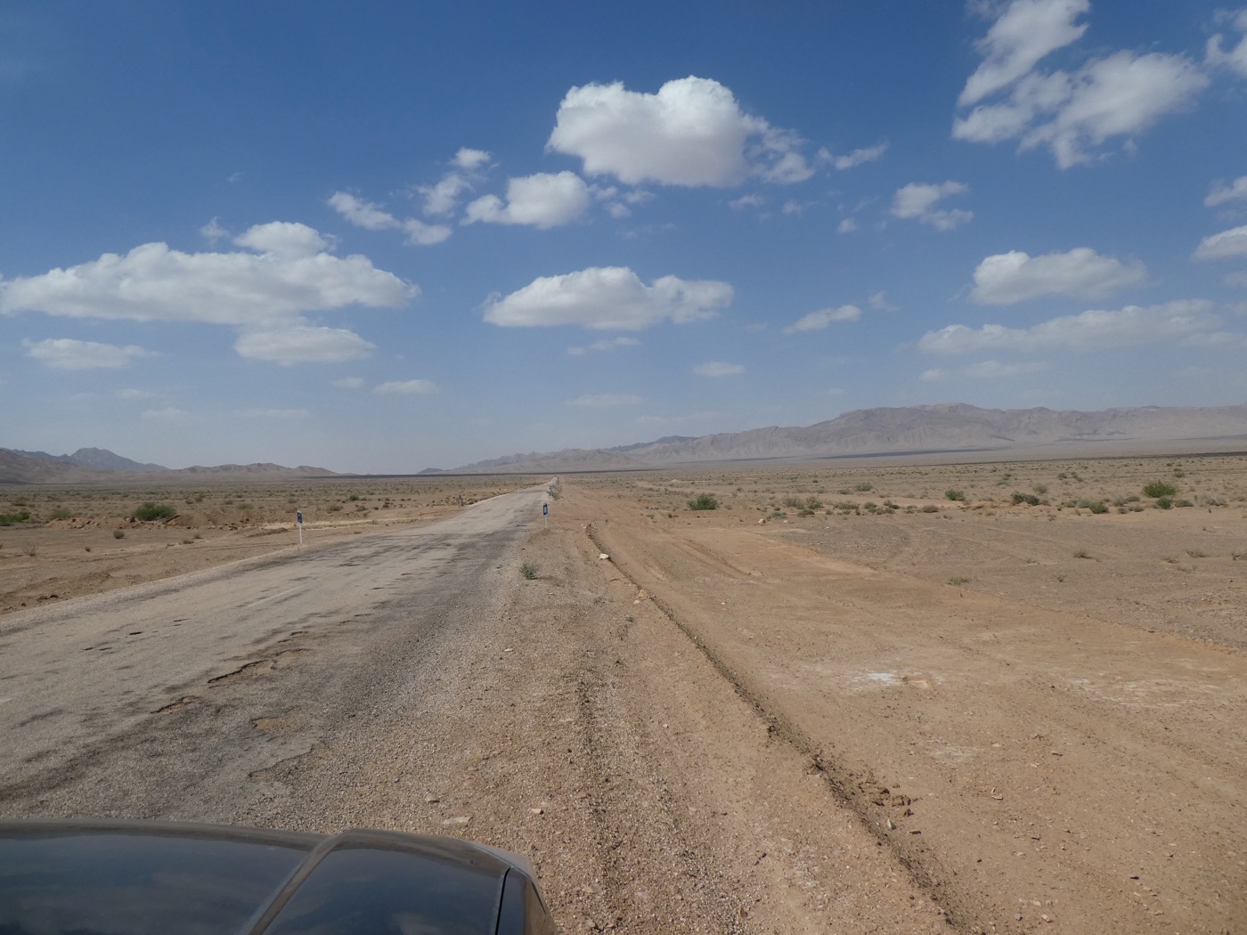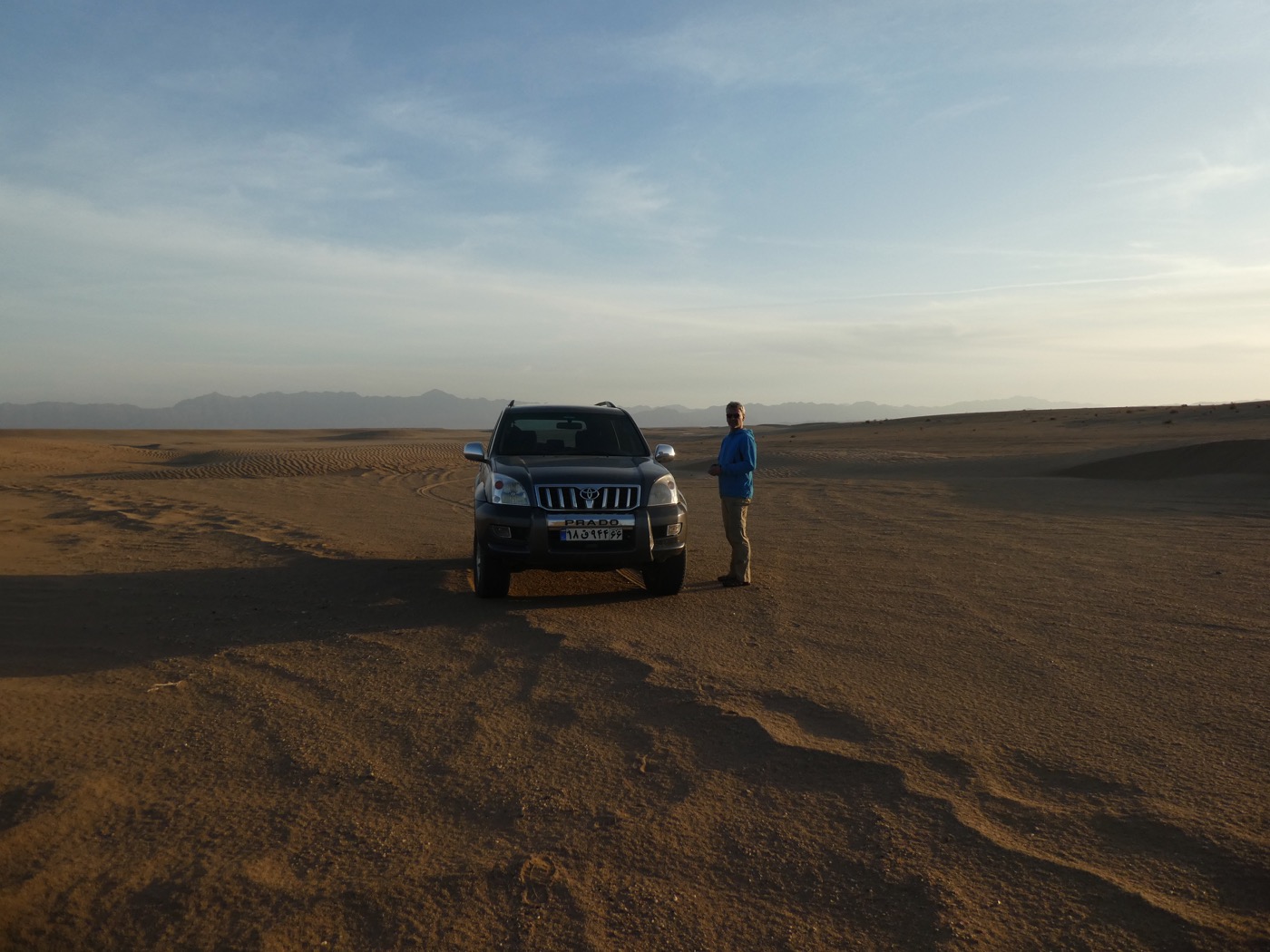 Unterwegs fahren wir durch weite Ebenen nur mit kleinem Buschwerk bewachsen – Erinnerungen an Uzbekistan kommen hoch. Die Weite der Landschaft ist einfach irre!!! Und bei Farahzad sitzt Sonja mal wieder entspannt auf einer Sanddüne …