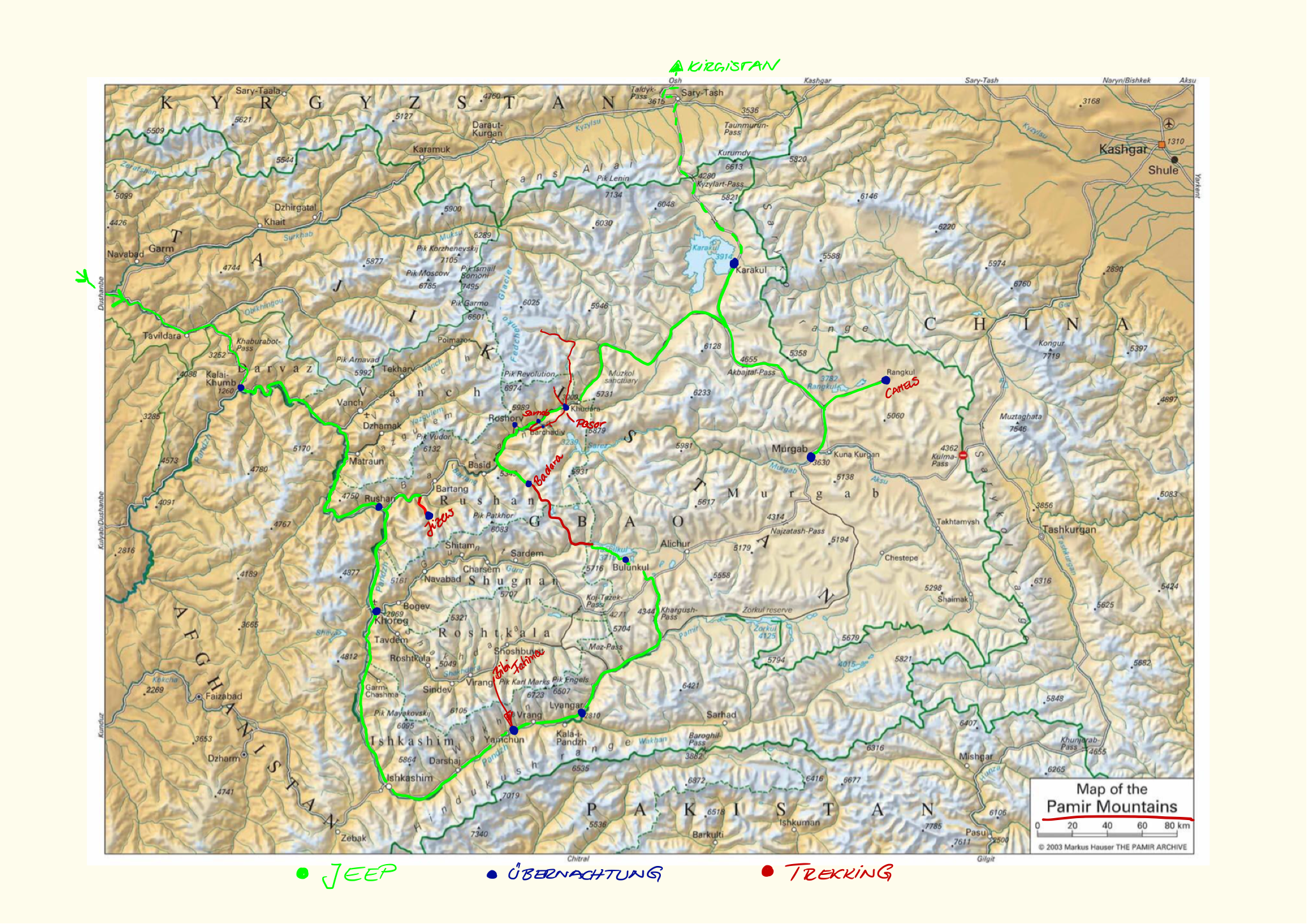 Für die ersten 3 Wochen hat sich eine kleine Gruppe gefunden, die mit uns zusammen auf Tour geht. Von Duschanbe fahren wir mit zwei Jeeps auf dem Pamir Highway in die Region  Berg- Badachschan zum Eingang vom Bartang Tal. Dort werden wir zum Akklimatisieren eine kleine Trekkingtour unternehmen. Geschlafen wird in Zelten oder in homestays. Anschließend gehts weiter an der afghanischen Grenze entlang zum Wakhan – Korridor. Dieses 210km lange und zwischen 20 und 60km breite Tal trennt das Pamirgebirge vom Hindukusch.