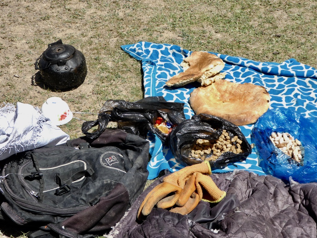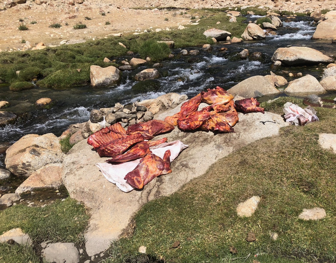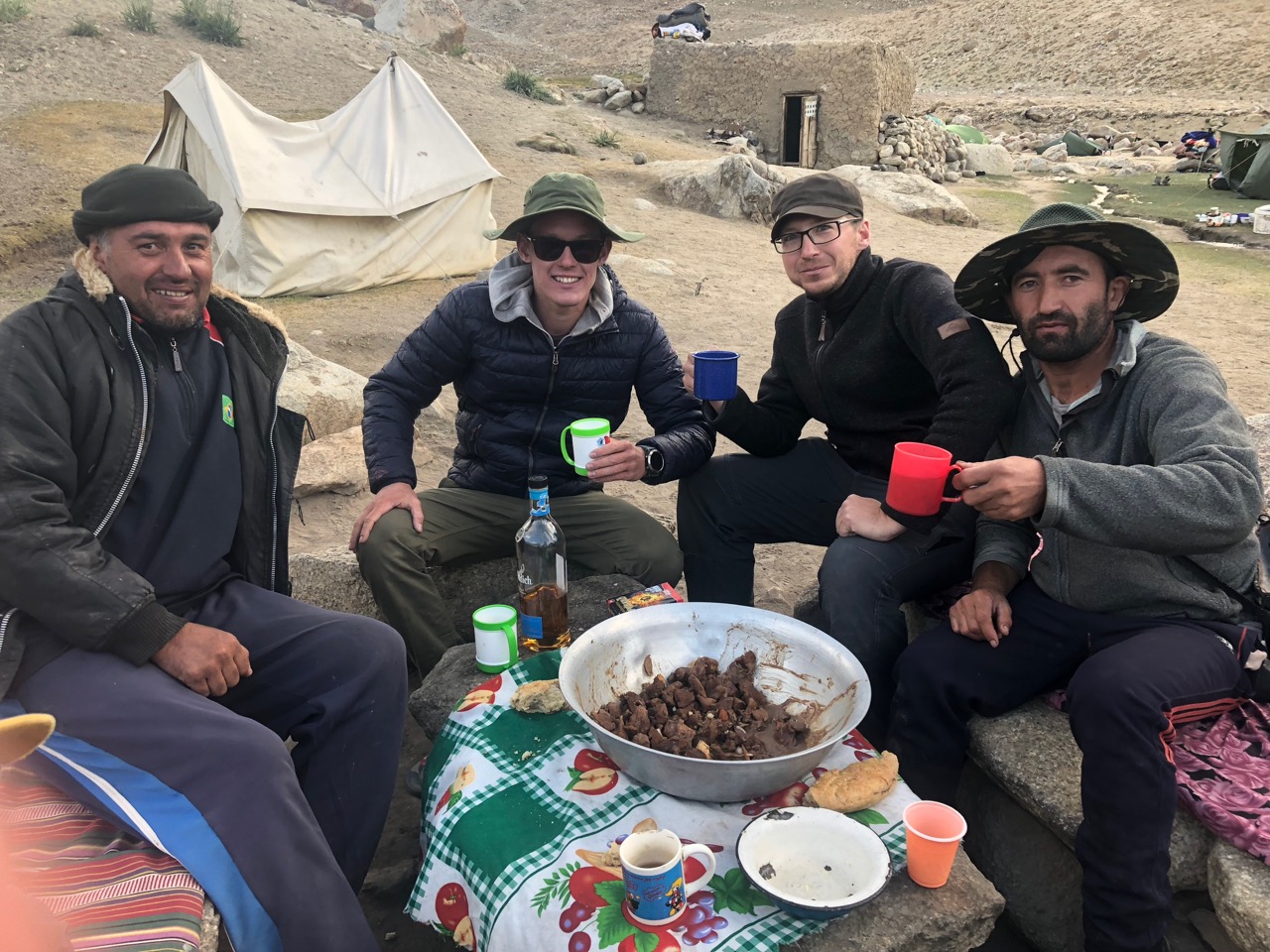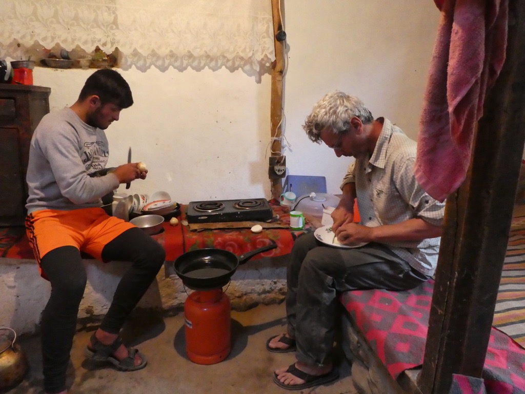 Es ist immer Zeit für einen Tee oder andere „Leckerlis“ wie Joghurt, Brot mit selbstgemachter Butter (sehr beliebt !!!) und natürlich „Gushtego“ … so hört es sich jedenfalls an, wenn sie uns Gegrilltes vom Rind anbieten =). Als wir zu der Alm eines unserer Donkeymen kommen, hatte sich ein Tier am Tag zuvor ein Bein gebrochen und musste geschlachtet werden. Statt Abhängen „Abliegen“ – und frisch gibt es die Innereien in der Männerrunde mit Kyle’s schottischem Kräuter … Avaz ist sehr besorgt über unser leibliches Wohlbefinden auf 4.300 m Höhe.