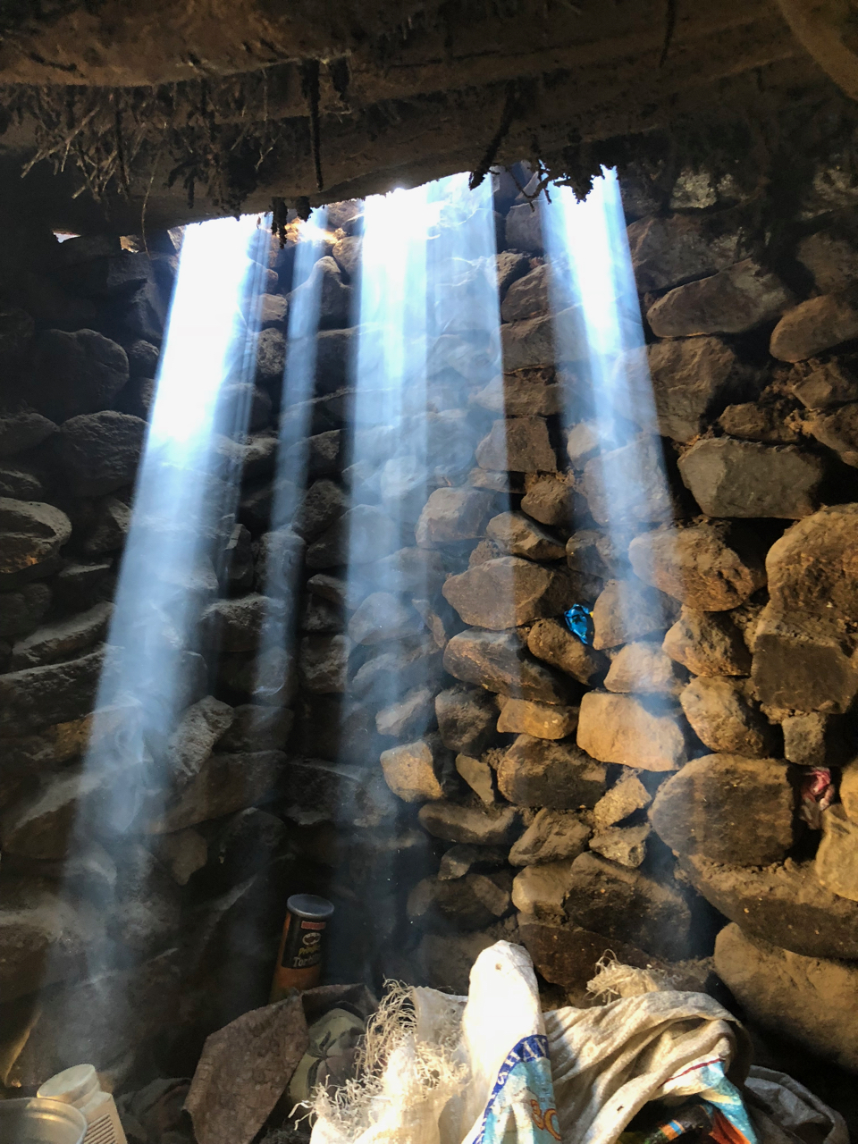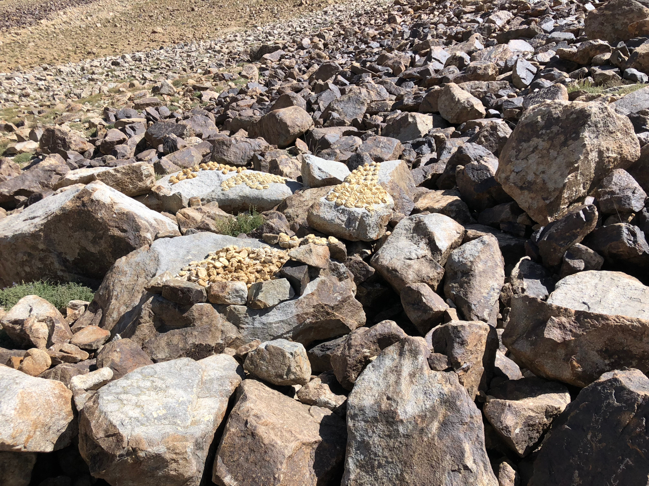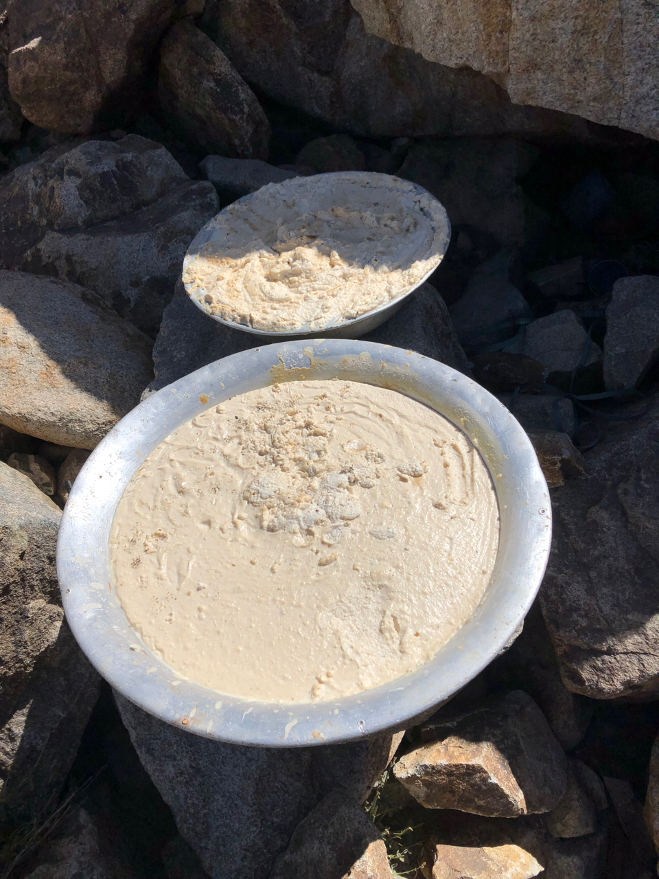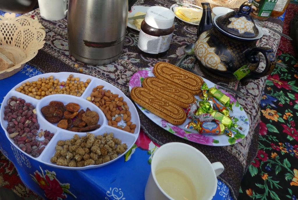 Es ist immer Zeit für einen Tee oder andere „Leckerlis“ wie Joghurt, Brot mit selbstgemachter Butter (sehr beliebt !!!) und natürlich „Gushtego“ … so hört es sich jedenfalls an, wenn sie uns Gegrilltes vom Rind anbieten =). Als wir zu der Alm eines unserer Donkeymen kommen, hatte sich ein Tier am Tag zuvor ein Bein gebrochen und musste geschlachtet werden. Statt Abhängen „Abliegen“ – und frisch gibt es die Innereien in der Männerrunde mit Kyle’s schottischem Kräuter … Avaz ist sehr besorgt über unser leibliches Wohlbefinden auf 4.300 m Höhe.
