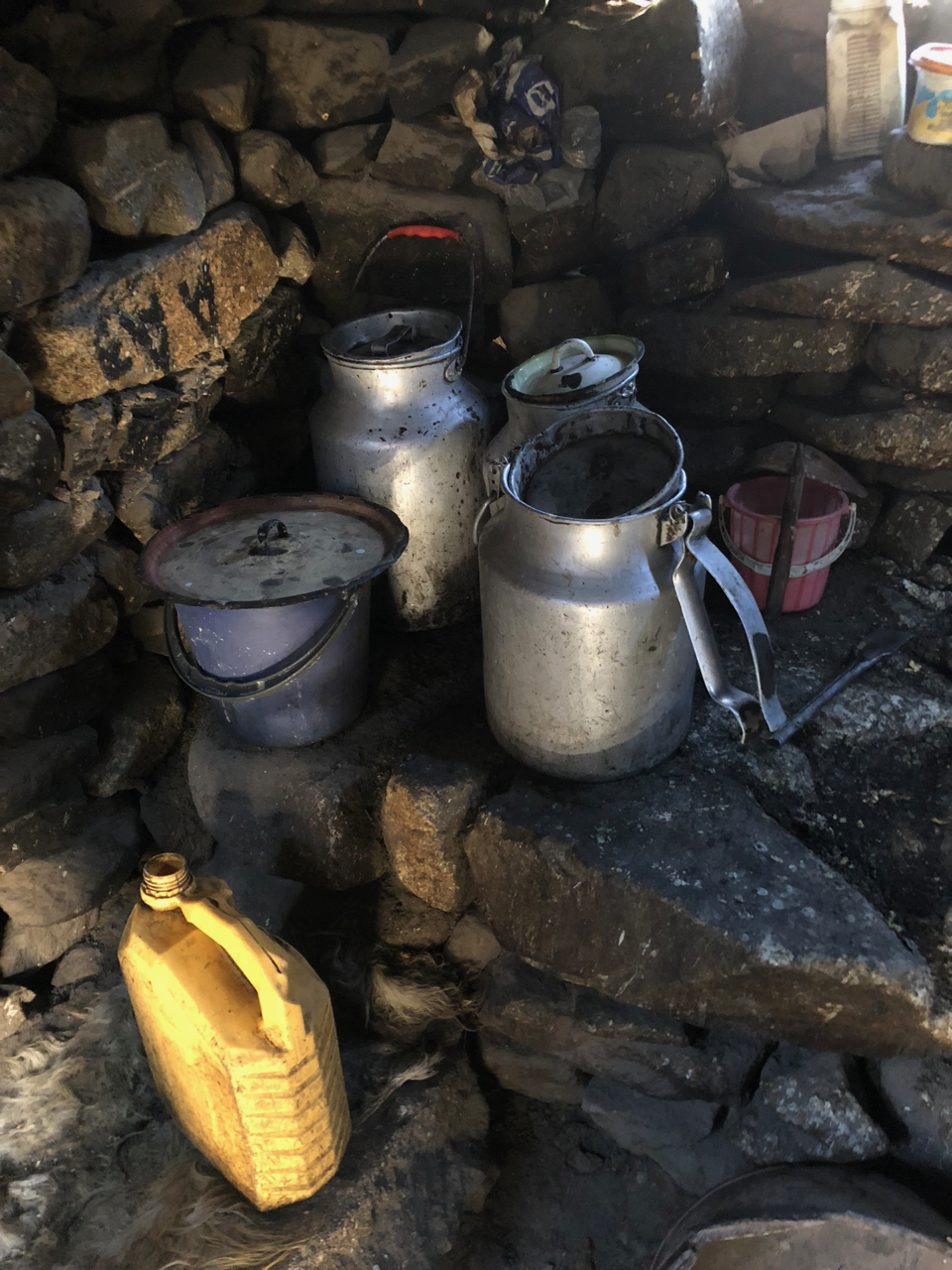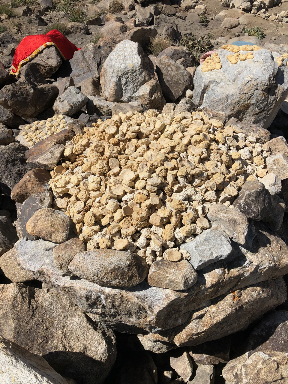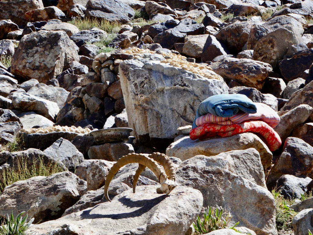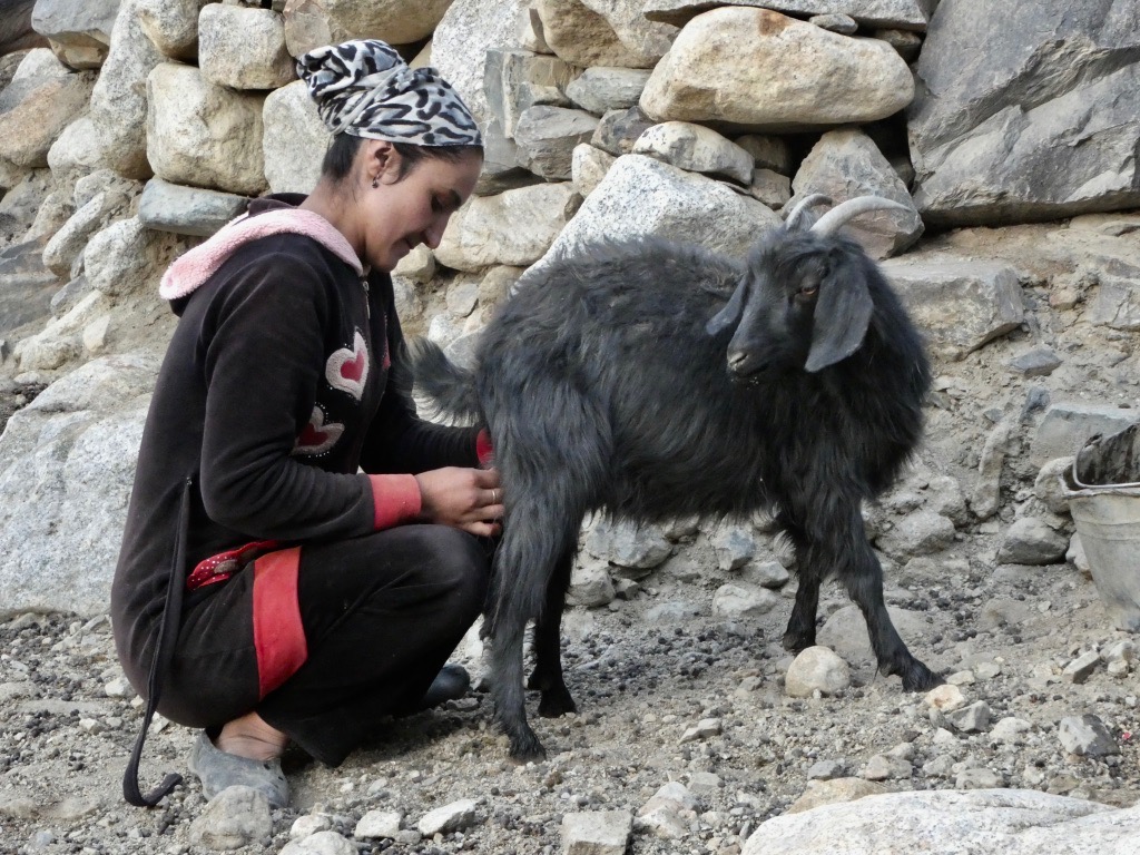 Immer wieder treffen wir auf Hirten, die in einfachen Unterkünften den Sommer auf den Hochalmen verbringen. Auf 4.100 m ist auf einer Alm die Käseproduktion wunderbar zu sehen. Von der Milcherhitzung in der „Küche“ bis zum Trocknen der Käsestücke auf den umliegenden Felsen. Das Resultat ist ein sehr würziger, trockener Käse, der zum Kochen verwendet wird und wenig mit unseren Käsegewohnheiten zu tun hat.
