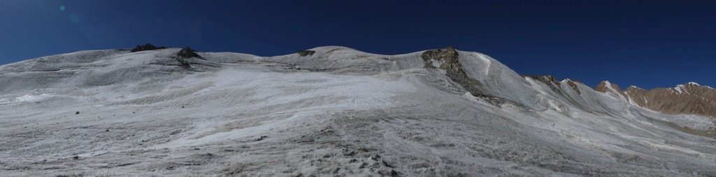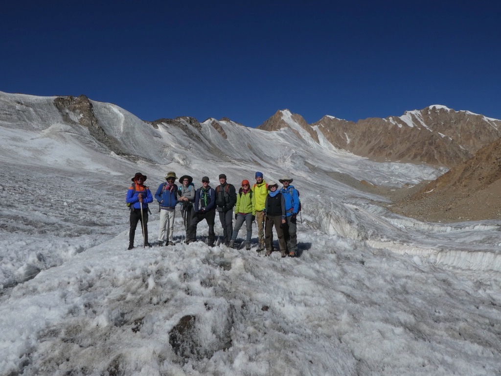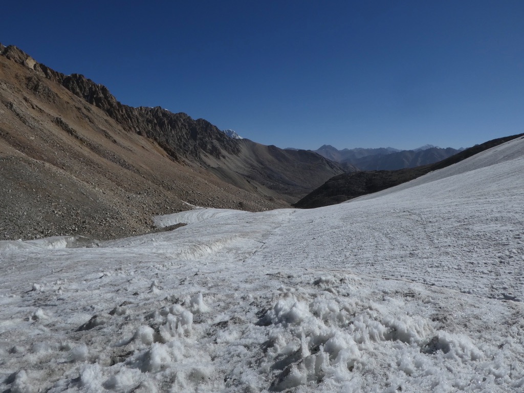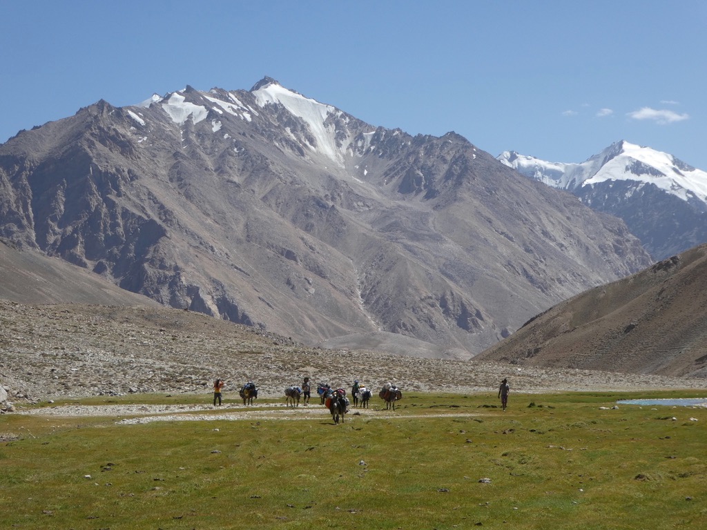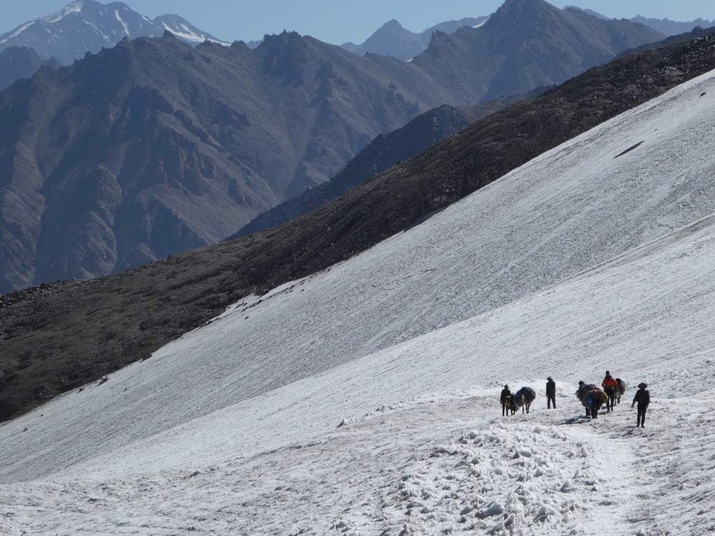 In den nächsten Tagen wandern wir weiter hoch zum Chapter Lake (4529m) – nach einer erfrischenden Nacht überqueren wir schließlich den Shtik Lozar Gletscher (4840m) … das ist der Übergang ins Bartangtal, den die Hirten im Frühjahr und Herbst sogar mit ihren Schaf – und Ziegenherden bewältigen. Nicht ohne Verluste, wie ein Eselfund unterm Schnee enthüllte… wir waren schon voller Bewunderung für unsere Begleitmannschaft, die die Esel mit Engelsgeduld über den Schnee geleiteten. Meine Ukulele wurde mit derselben Engelsgeduld transportiert und behütet … dafür hatten wir viel Spaß bei musikalischen Abenden – öfter auch mal als Konkurrenz zu den heulenden Wölfen …