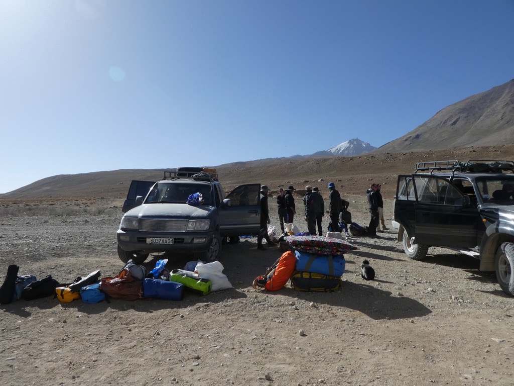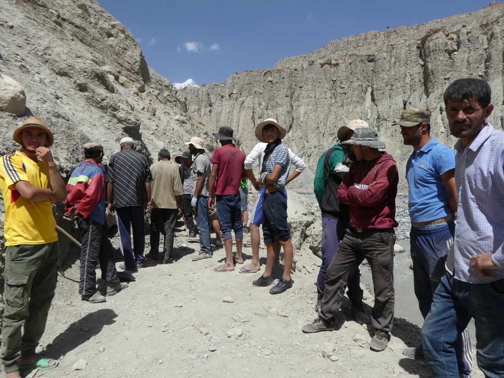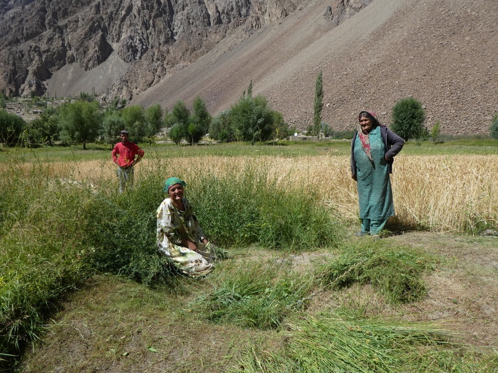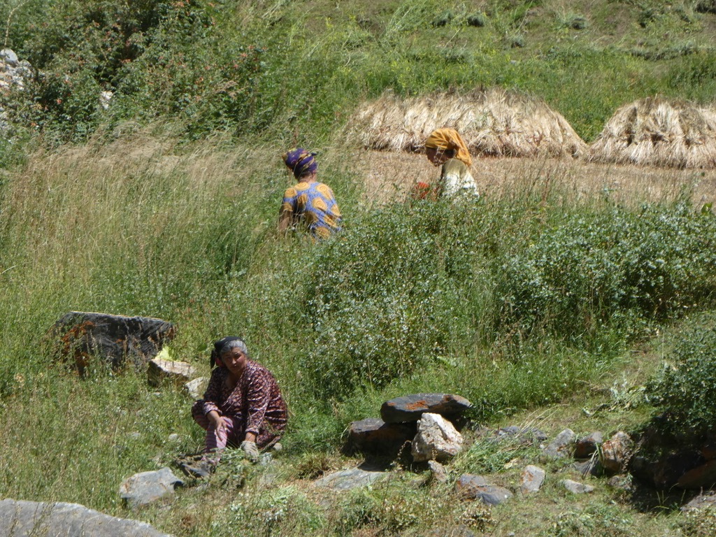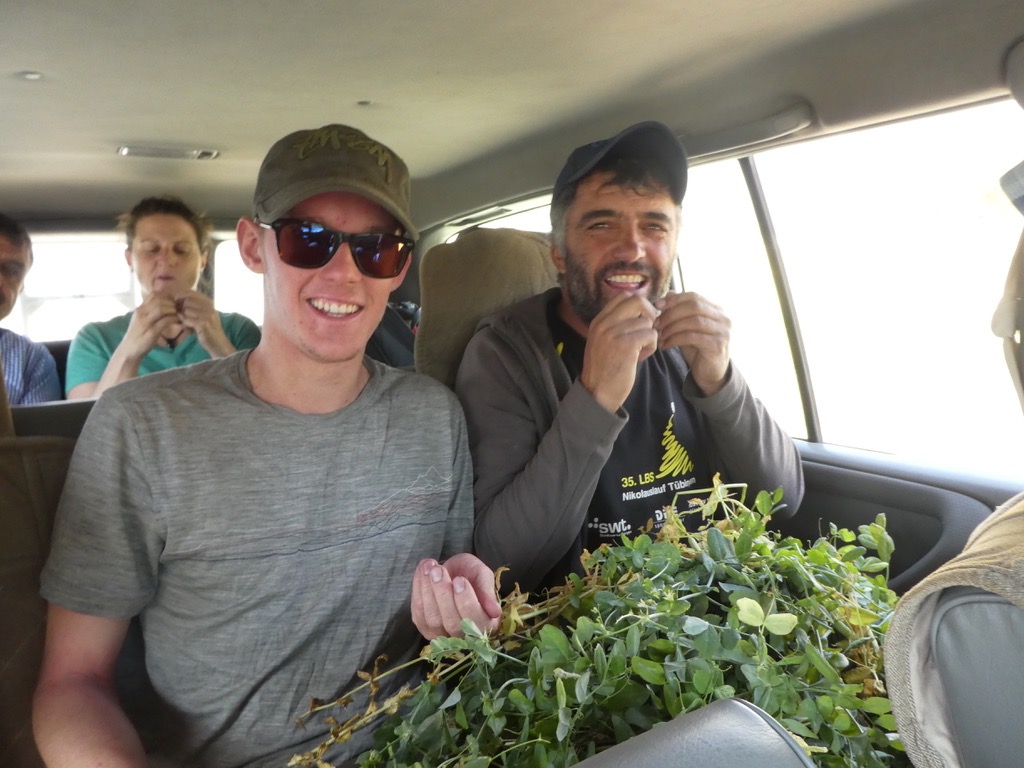 Nun geht es wieder mit gewohntem Auto-Geruckel auf einer ziemlich steilen „Straße“ hinunter ins Bartangtal. Dort erreicht uns ziemlich schnell die Nachricht, dass der Bartang-River gerade ungewöhnlich viel Wasser führt und der Straßenzustand sehr zu wünschen übrig lässt. Und tatsächlich – nach einer Nacht in Roshorv steht endgültig fest, dass der Weiterweg per Auto nach Osten dicht ist – die Straße ist unterspült und teilweise weggebrochen. Wo bei uns dann großes Gerät anrückt, stehen hier Männer mit Schaufeln und nach einigen Stunden ein altersschwacher Traktor zum Einsatz bereit. .. Und natürlich der Ortsvorsteher von Roshorv … in unserem Auto =) =) =) …zur Stärkung hat Avaz, unser Guide, mal schnell noch ein paar Bohnen vom Feld des Ortsvorstehers gemopst – die werden dann im Auto so nebenbei verknuspert… ich sag ja. „Alles was grün ist ….“