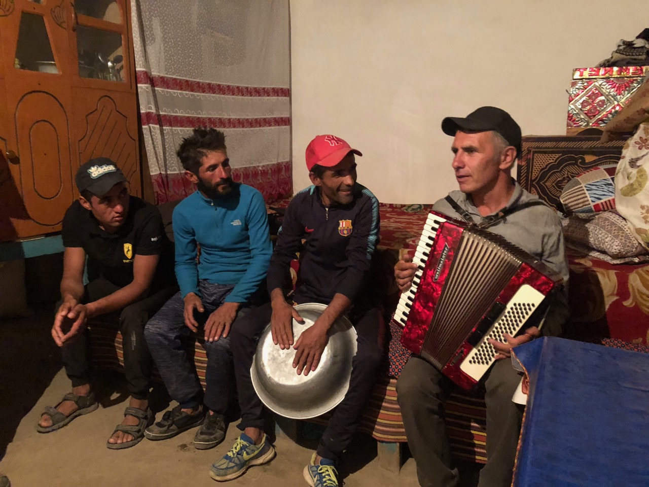 Am Abend verabschieden wir unsere Begleitmannschaft mit Musik von Sonja an der Ukulele & Topchi am Akkordeon und Tanz – eine willkommene Abwechslung für die gesamte Nachbarschaft, die sich sofort in die Feier einbringen.