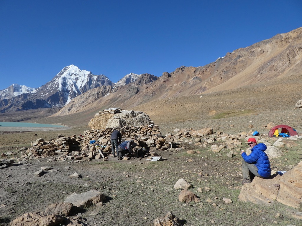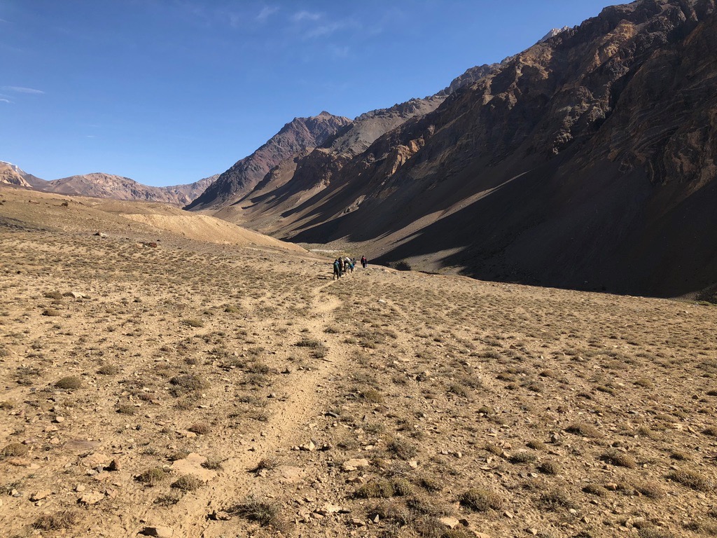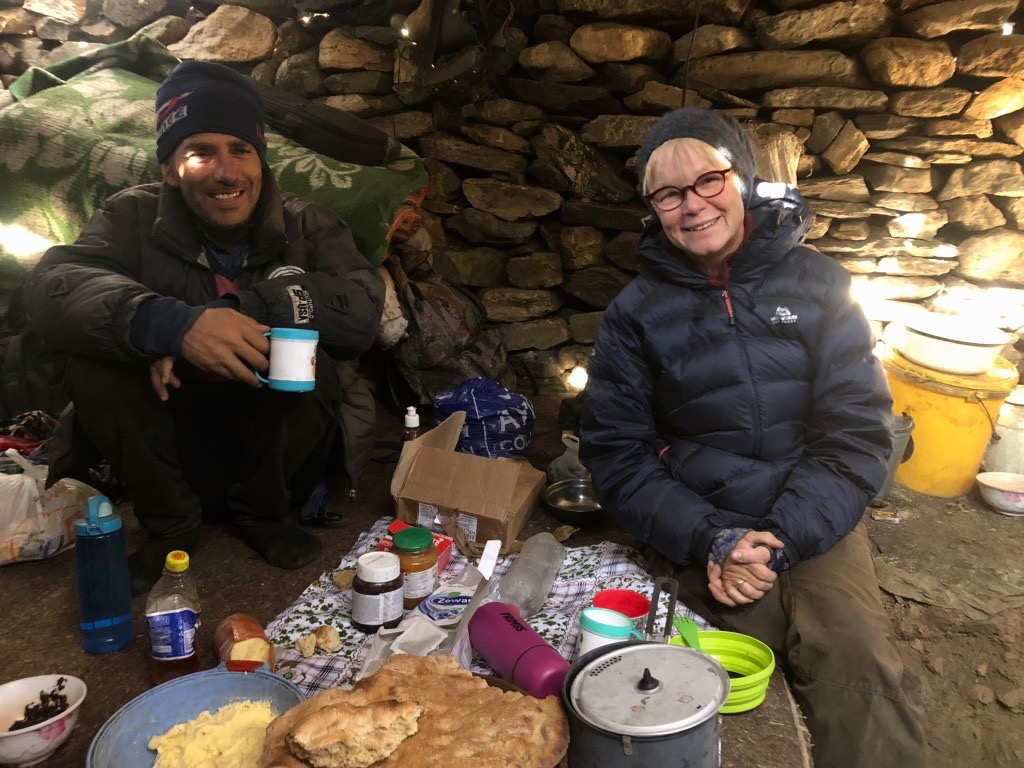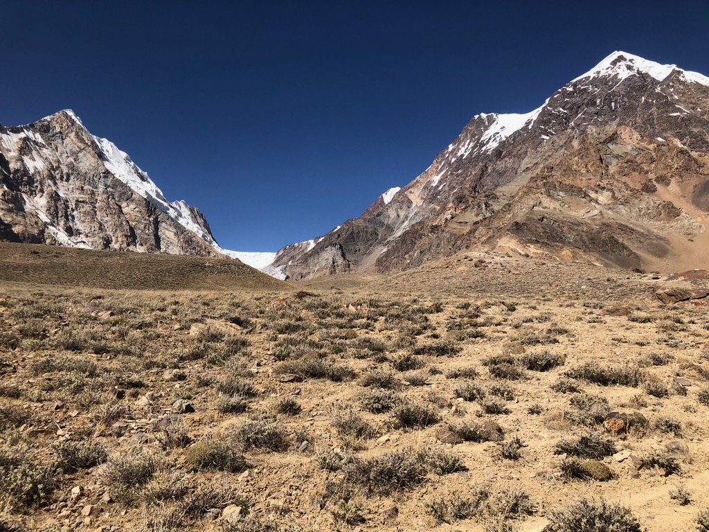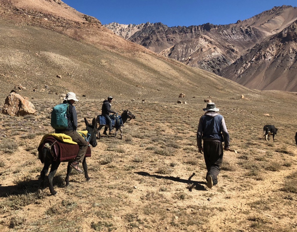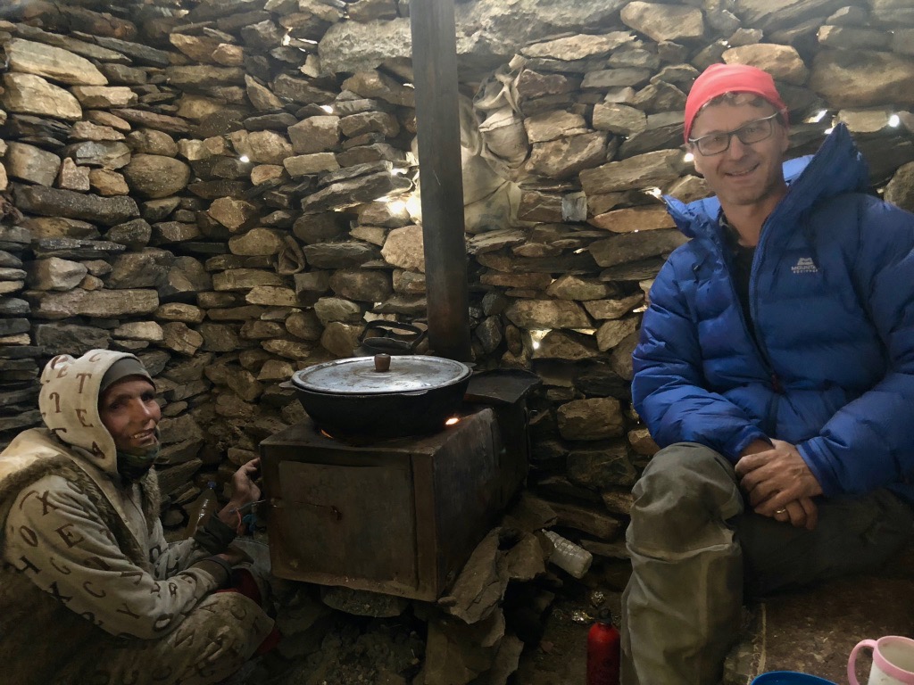 Zuerst geht es durch eine enge Schlucht, bevor sich das Tal weitete und in alle Richtungen Blicke auf schneebedeckte Gipfel bis 6.000 m bietet. Unser erstes Camp schlagen wir ziemlich geschafft und durchgefroren neben der Alm von Oscheg auf. Es windet stark und wir sind sehr froh zum Abendessen Unterschlupf in der Alm zu finden.
