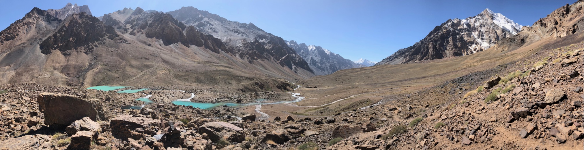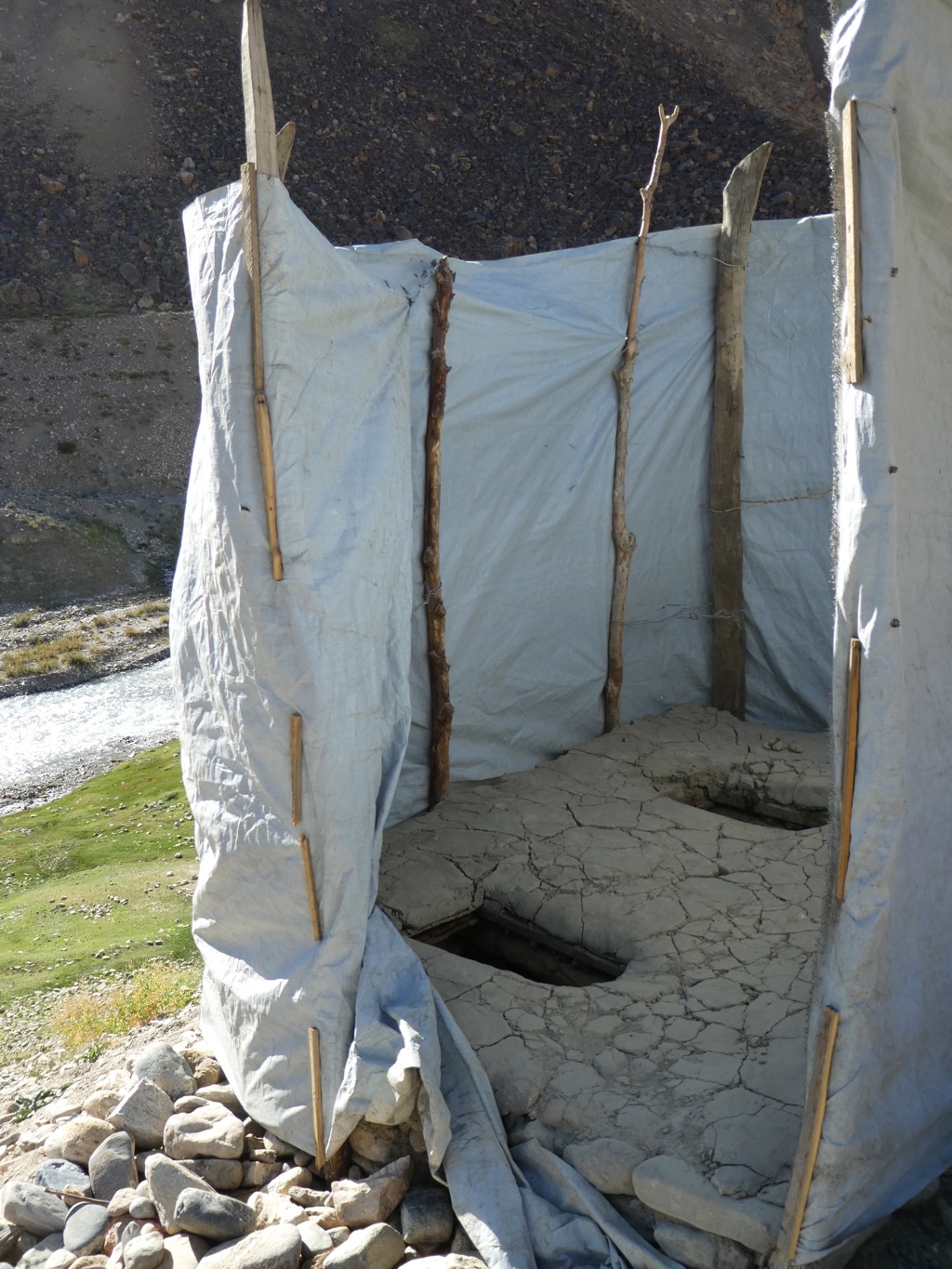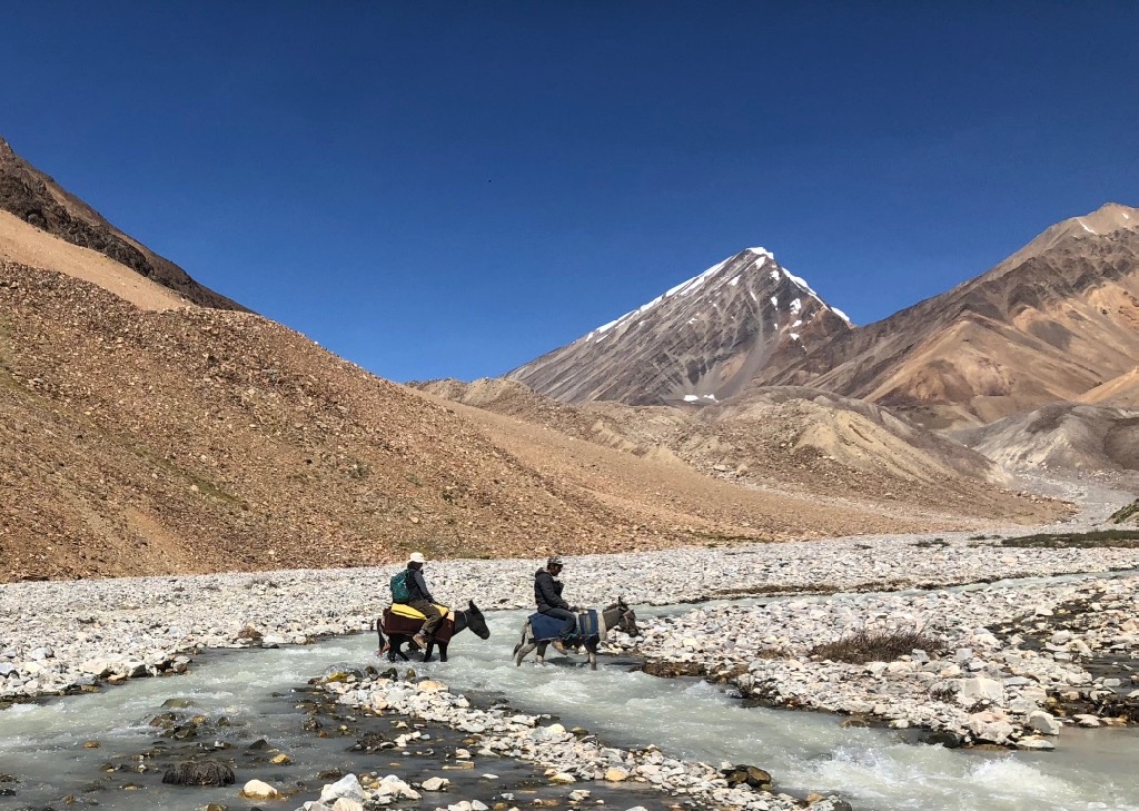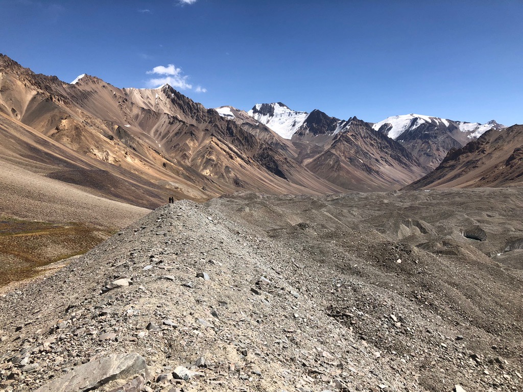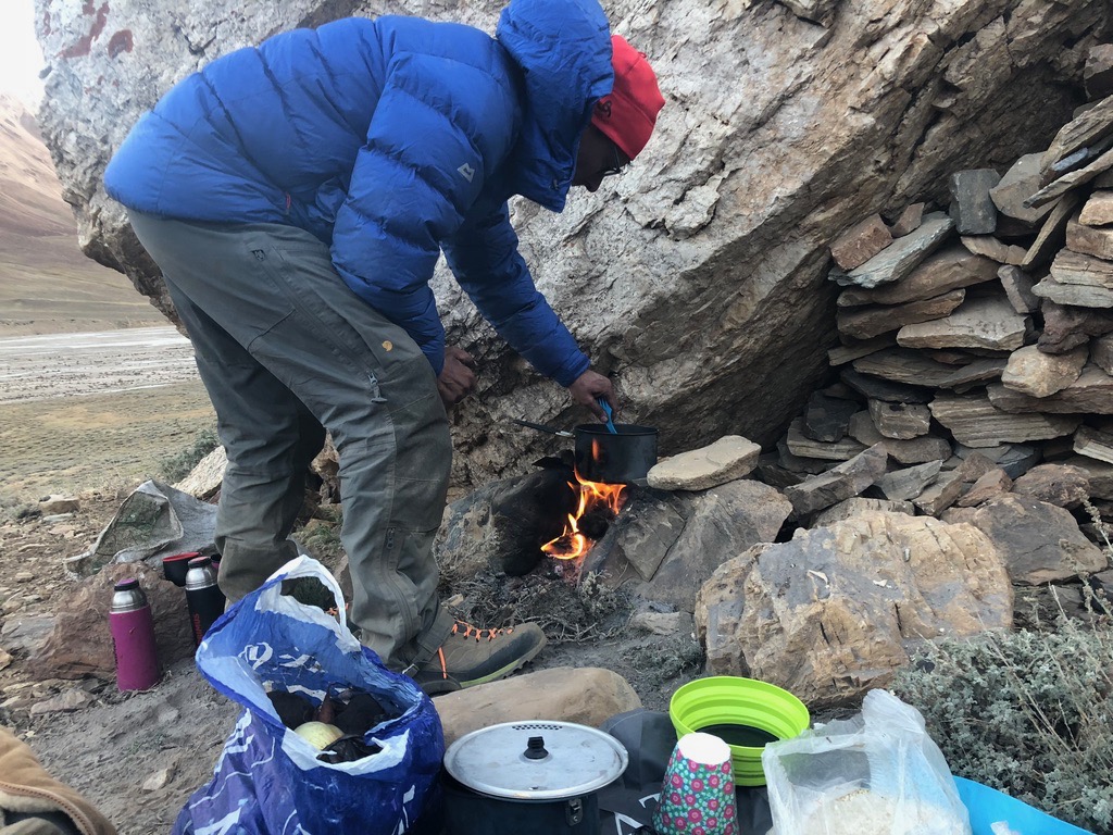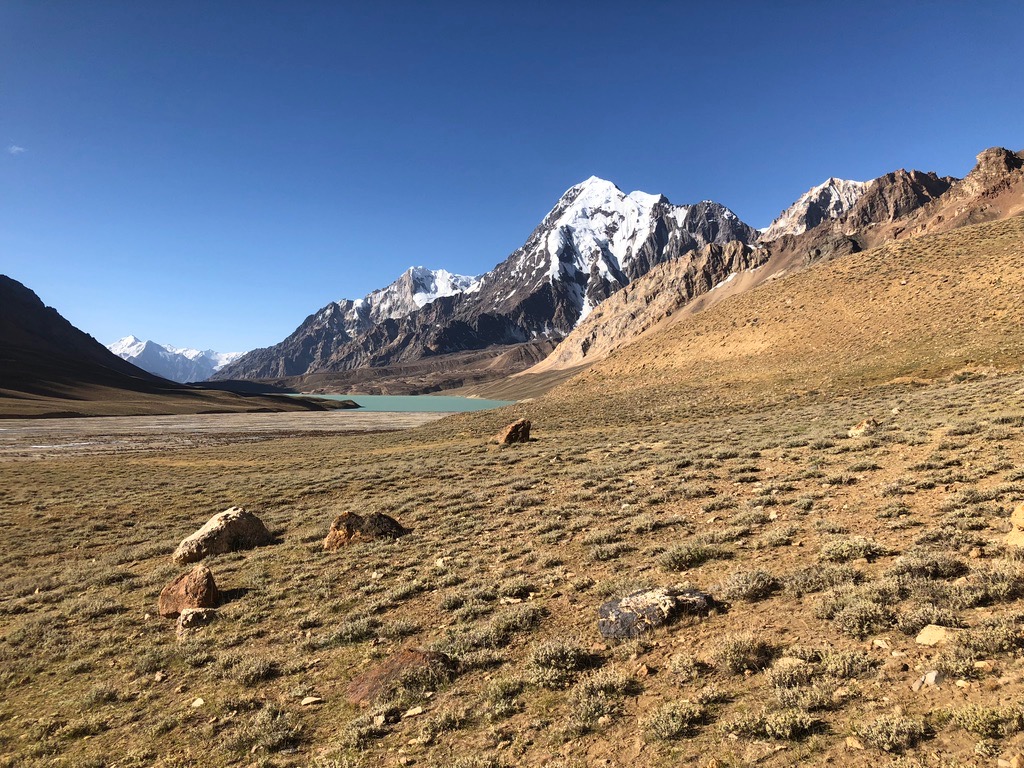 Zuerst geht es durch eine enge Schlucht, bevor sich das Tal weitete und in alle Richtungen Blicke auf schneebedeckte Gipfel bis 6.000 m bietet. Unser erstes Camp schlagen wir ziemlich geschafft und durchgefroren neben der Alm von Oscheg auf. Es windet stark und wir sind sehr froh zum Abendessen Unterschlupf in der Alm zu finden.