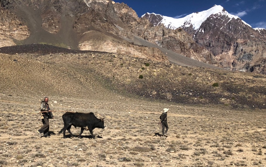 In der Nacht waren zwei Bullen hinter den Kühen unserer Gastgeber her und man hatte Angst um unsere Sicherheit im Zelt  – die Jungs hatten also wenig Schlaf wegen der ständigen Bullenjagd. Oscheg beschließt die Bullen auf die Hochalm zu treiben – weg von den Kühen. So machen wir uns zu fünft mit zwei Bullen und nun zwei Eseln – einer voll, einer kaum beladen – auf den Weg. Immer entlang dem Khafrazdara River, im steten Auf und Ab vorbei an tollen Gebirgsseen und Klasse Aussicht auf Berge und Gletscher. Die Bullen bewegen sich nur widerwillig weg von den Kühen … Teilweise noch höhengeschädigt kommen wir auf der „Hochalm“ an – einer Ansammlung von Steinumfriedungen – und ich bin ziemlich erschöpft.