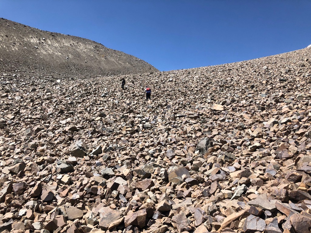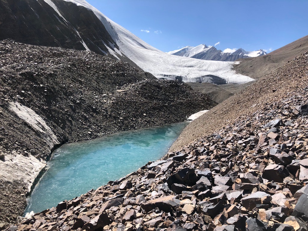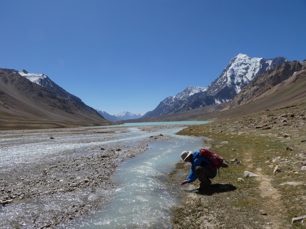 Am nächsten Morgen zeigen Eiszapfen an unserer Waschstelle wie kalt es nachts wurde … wie Hussein hier nachts ohne Schlafsack oder Decke schläft – ein Rätsel! Von hier brechen wir zum Rande des Grum Grjimallo Glacier – einem „Zufluss“ des Fedchenko – als Tagestour auf. Nach ein paar Kilometer kommen wir zu einem Plateau, auf dem zu Sowjetzeiten wohl größere Trainingslager für sowjetische, polnische und tschechische Bergsteiger stattfanden. Man kann sich gut vorstellen wie dies Ausgangspunkt für Touren in die umliegenden Nordwände und zum Peak Revolution (heute: Istiqlol, 6940 m) waren. Ab da geht es nur noch im weglosen Gelände über ausgedehnte Moränen weiter, zwischendurch immer wieder eisige Seen. Auf 4.600 m haben wir einen Blick auf den Peak Revolution und den Fedchenko Gletscher in der Ferne – ein Weitergehen bis zum Grum Grjimallo Rand lässt die Zeit und Kraftreserve nicht mehr zu.