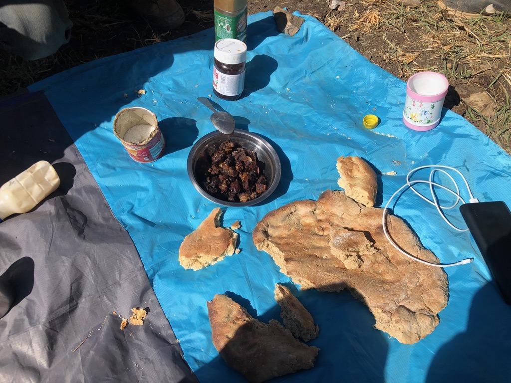 Insbesondere Hussein und Topchi sind eigentlich die ganze Tour auf die Infrastruktur der Hochalmen angewiesen. Wie wir unterwegs feststellen, hat Hussein außer einer Edelstahltasse und seinem Esel nichts dabei – gar nichts – keinen Schlafsack, kein Messer, keine Lampe – nada !!! In Pasor war ich noch über seinen vollen Tagesrucksack überrascht, aber der ist bis oben hin mit Fladenbrot gefüllt – ohne das geht in Tadschikistan gar nichts … Topchi hat immerhin einen Schlafsack dabei und wir hatten ihn zum Glück genötigt eine Essschüssel und einen Löffel einzupacken, aber auch sonst NICHTS. Wohlgemerkt: Angesagt war eine 6 – Tages – Trekkingtour bis 4.600 m – na ja, dann halt mit drei Löffeln für vier Leute.