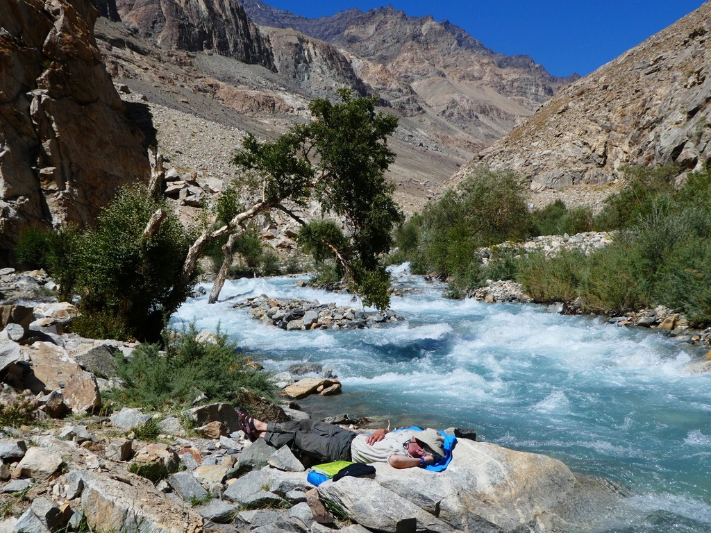 Während des Abstiegs sehe ich mich übrigens immer wieder im Ganter Biergarten auf dem Weg zur Theke – ein Urtrunk – von hinten rufen die Nieren „hier, jetzt“ … Kurz vor Pasor gönnen wir uns ein Bad im eiskalten Khafrazdara River und waschen endlich Schweiß, Staub und Dreck ab.