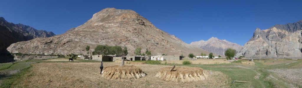 Einigermaßen erholt geht es wieder los und wir machen uns auf nach Pasor, um von dort das Khafrazdara Tal hinauf zu wandern. Mit Topchi hatten wir den Proviant zusammengestellt (… Einkauf im Dorfladen … Reis, Zucker, Thunfischdosen und … russische Nudelsuppe zum Frühstück… das rettet uns unterwegs einige Male die Stimmung). Zum Glück können wir auch hier auf Mulk’s Garten zurückgreifen – frische Gurken, Tomaten, rote Beete, Karotten und Kartoffeln kommen auf den Speiseplan. In Pasor wartet Hussein mit seinem Esel auf uns – er begleitet uns die nächsten 5 Tage und ist für den Gepäcktransport zuständig.
